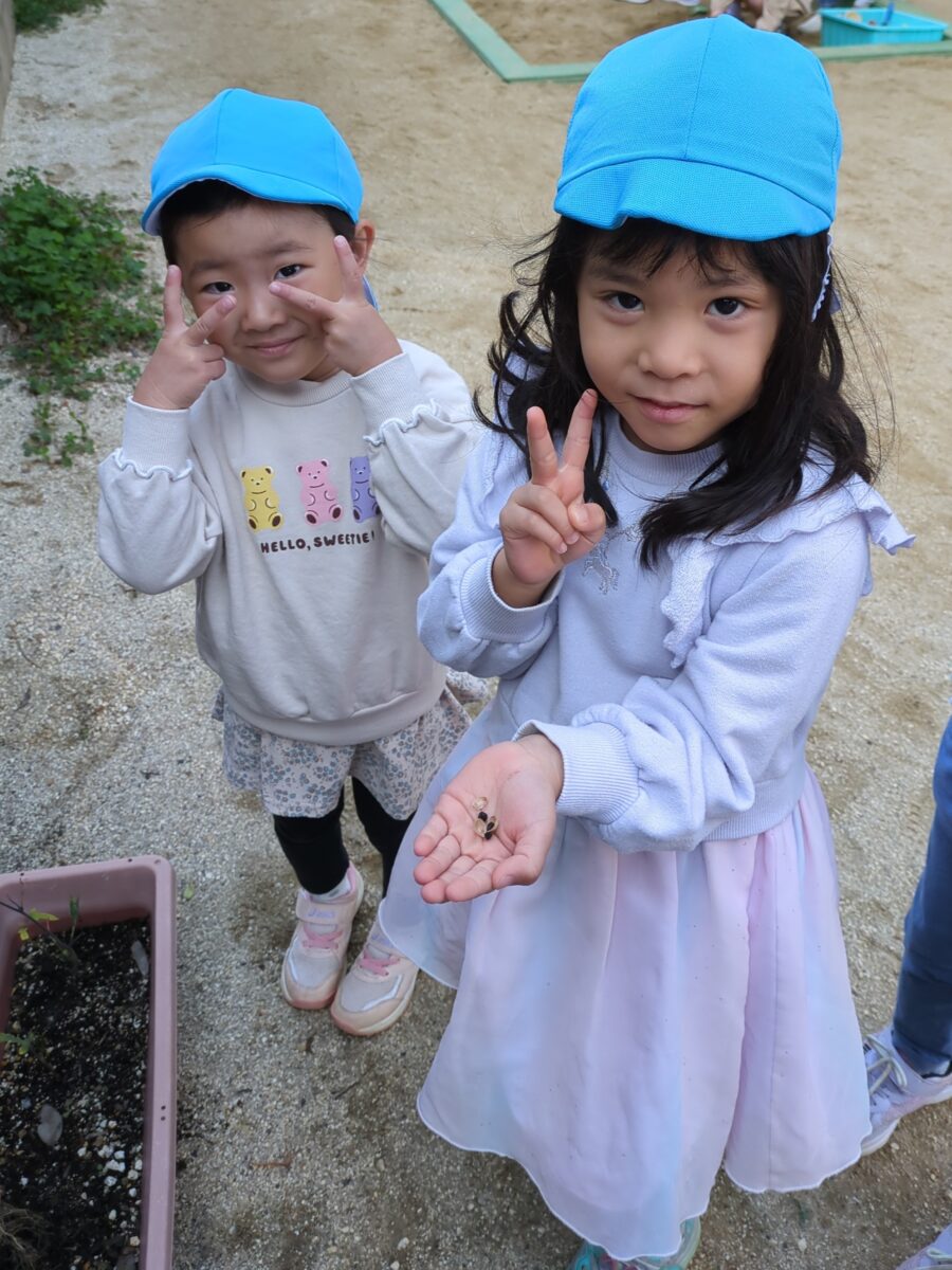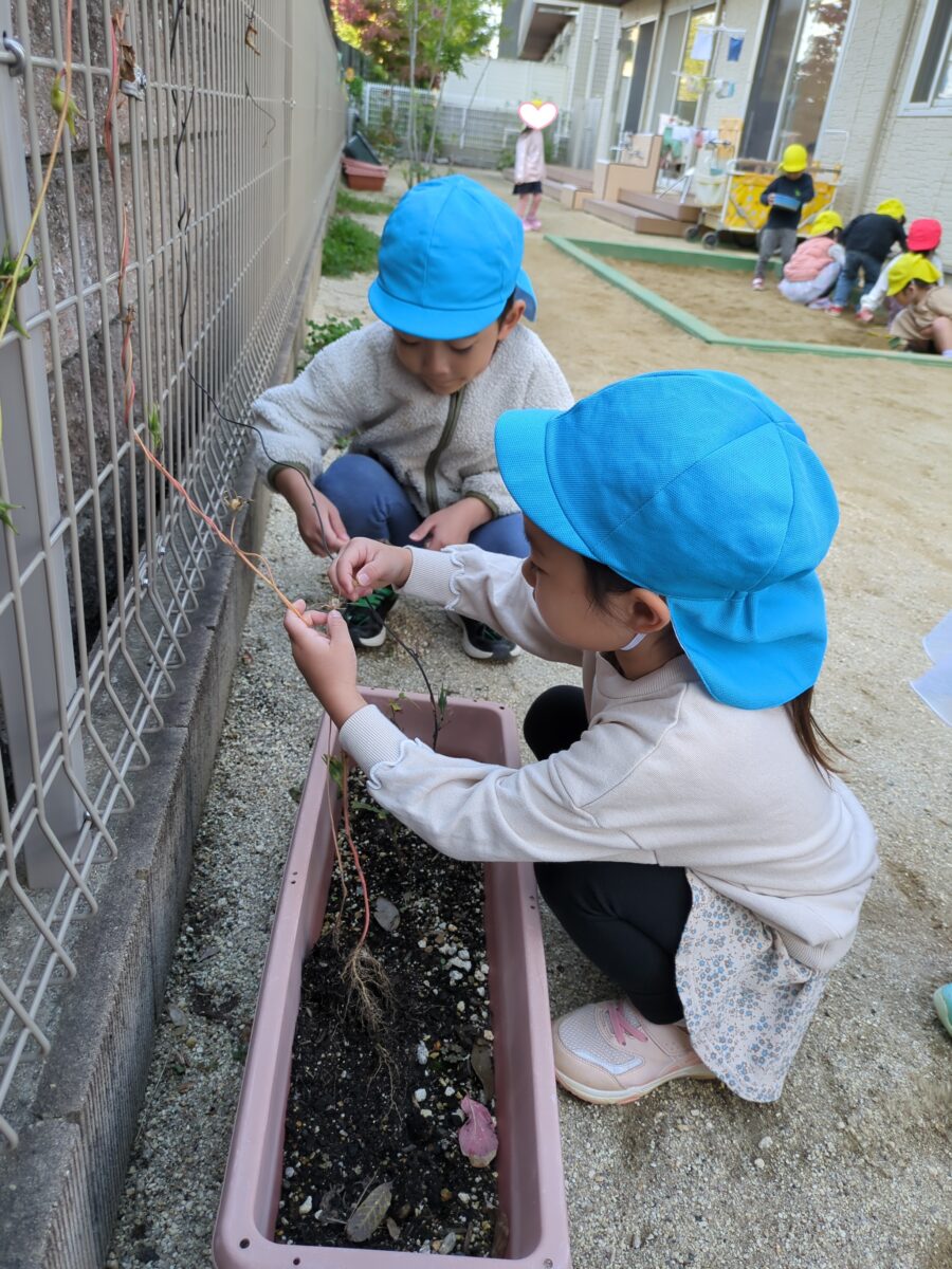 あさがおのプランターからは、茶色く乾いたさやを見つけた子ども達。そっと割ってみると、黒い小さな種がころんと出てきました。