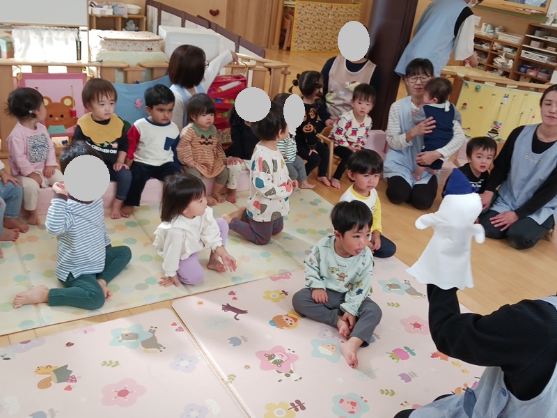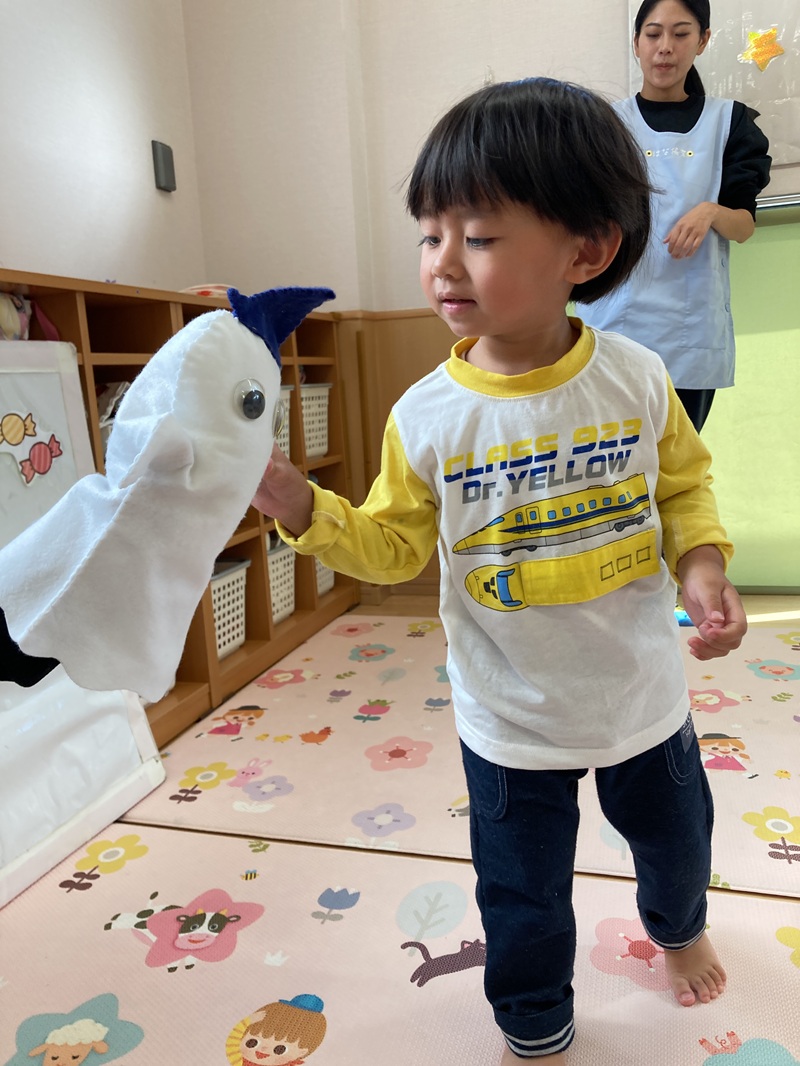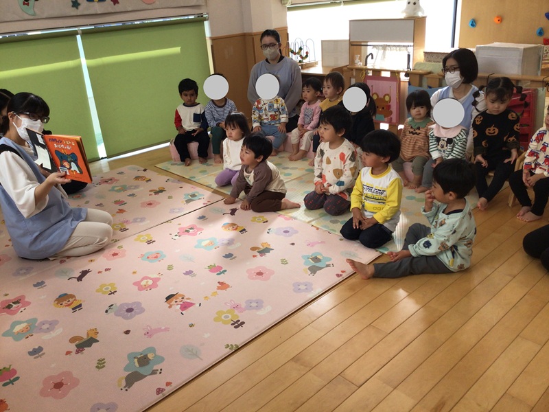 絵本におばけが登場すると「おばけ!」と笑顔の子どもたち✨