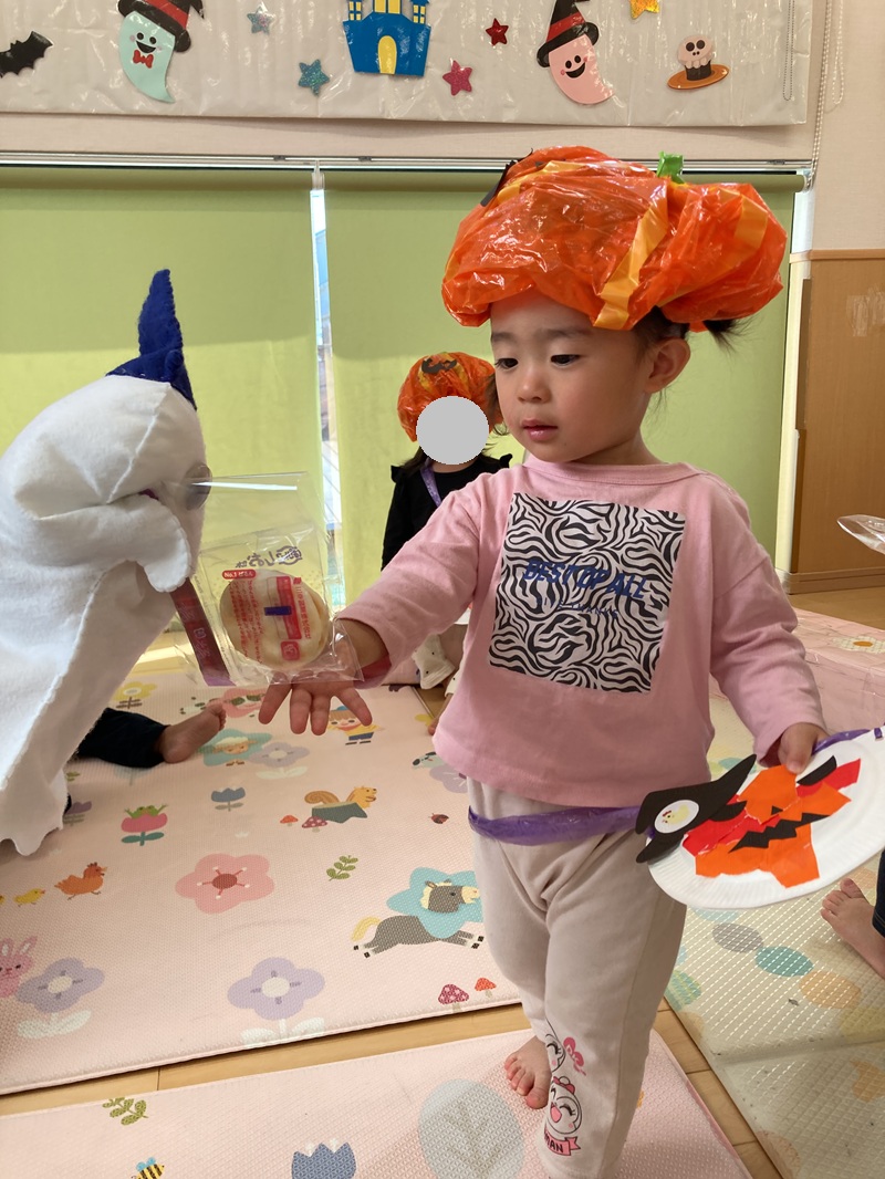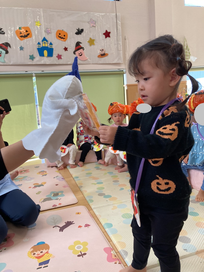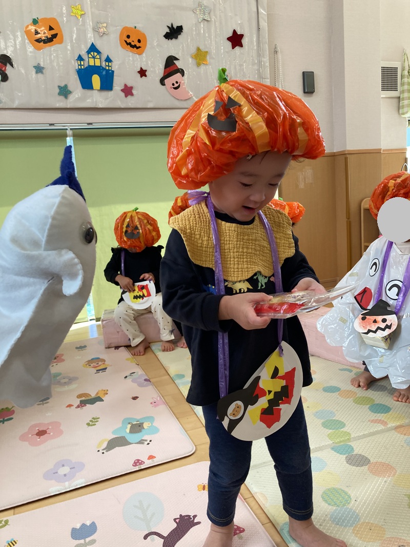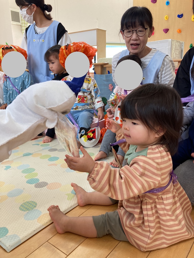 0・1歳児は、少しドキドキしながらも嬉しそうな表情でお菓子を貰っていました![]()