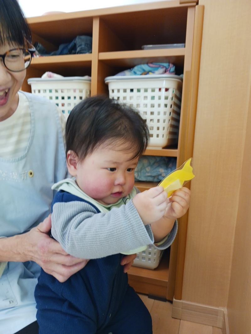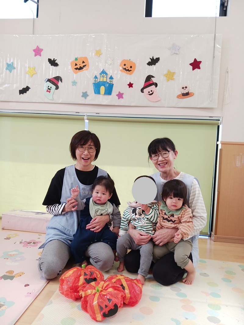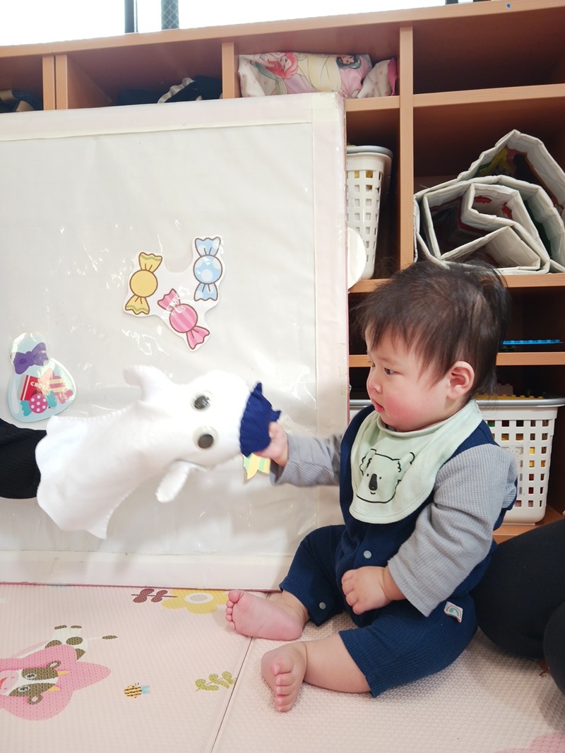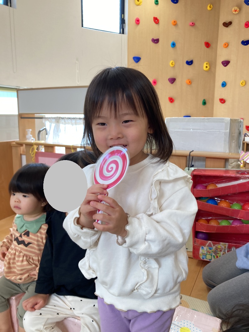 0・1歳児は、少しドキドキしながらも嬉しそうな表情でお菓子を貰っていました![]()