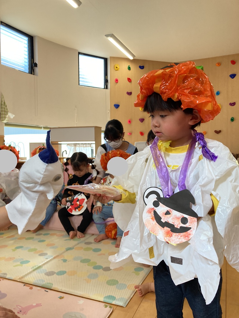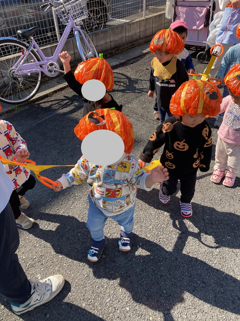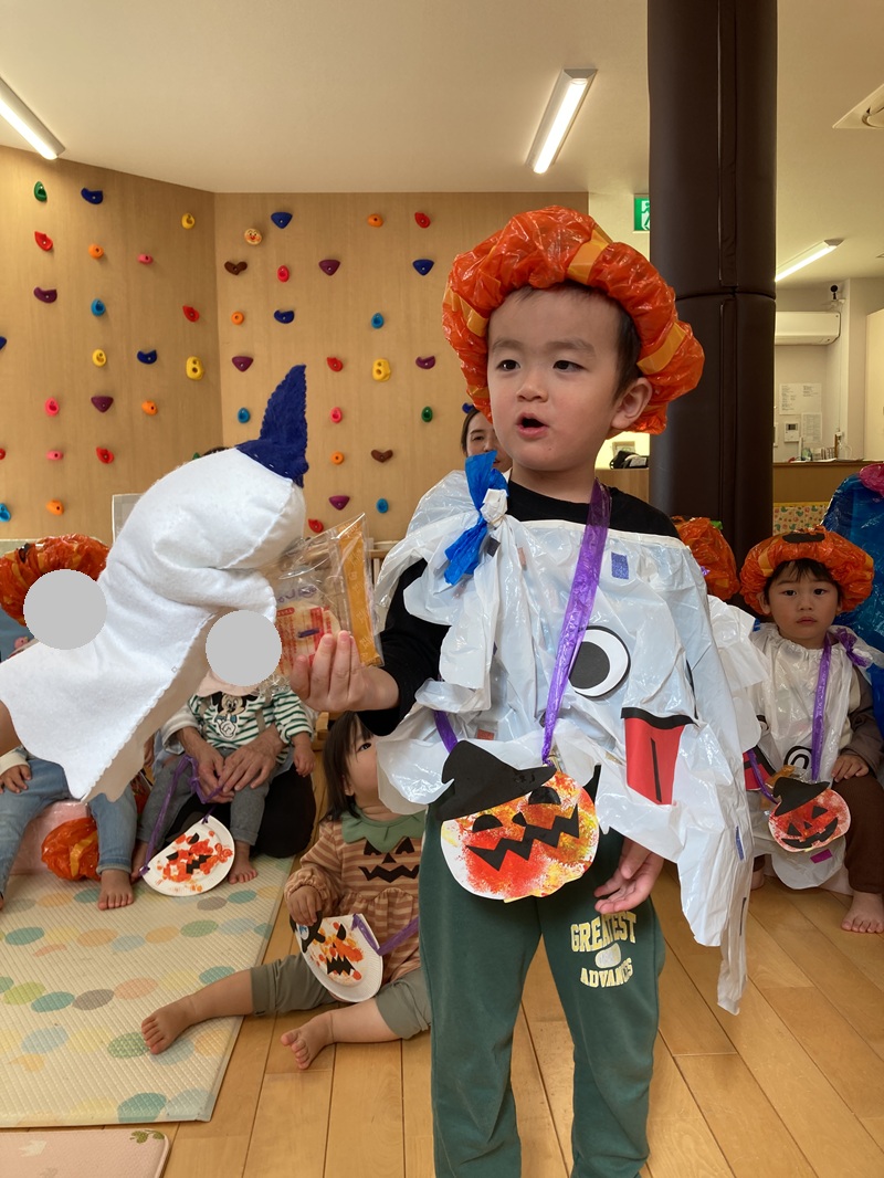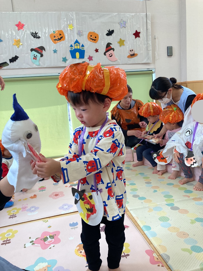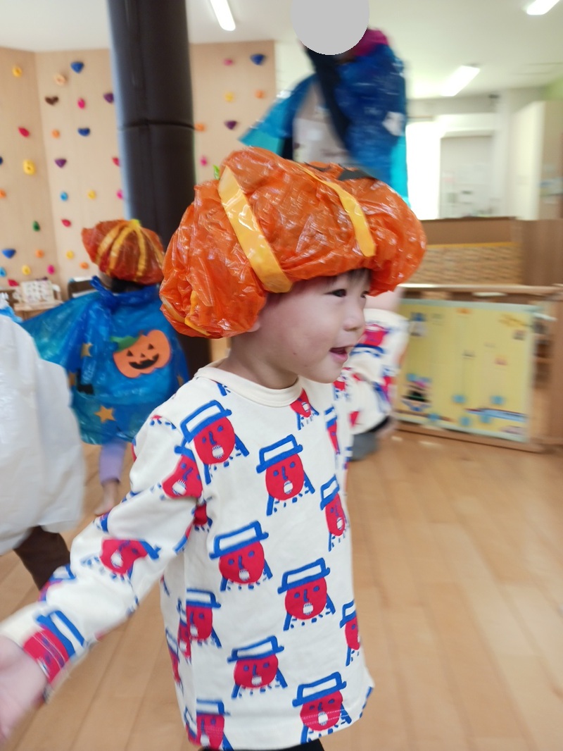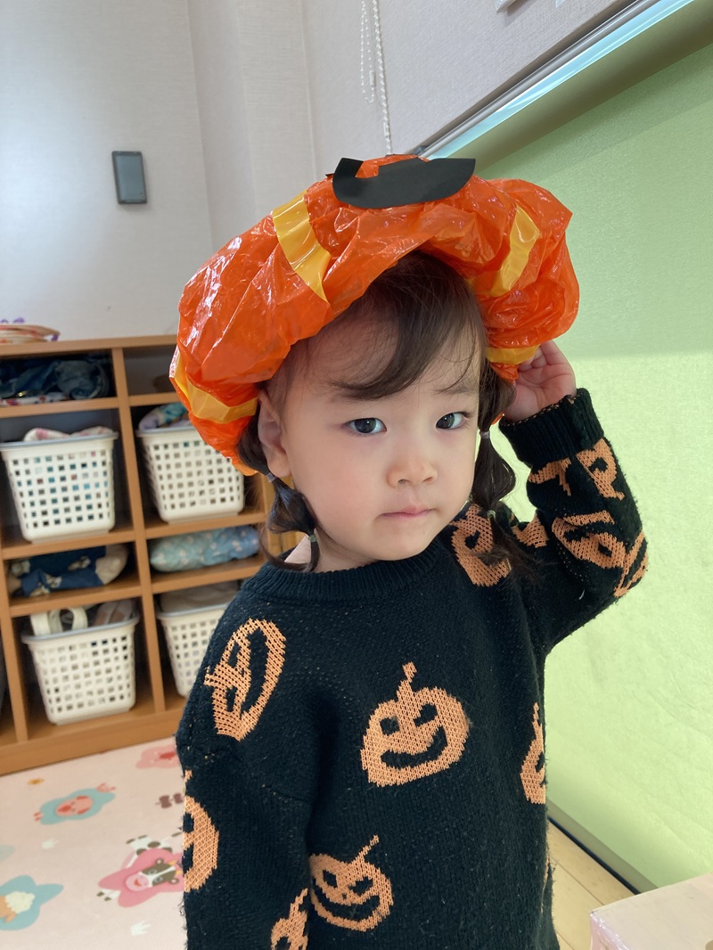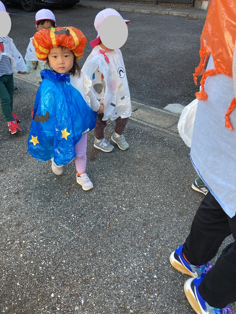 2歳児は帽子と衣装やマントを身につけてすっかりハロウィンの仲間入りです🎃![]()