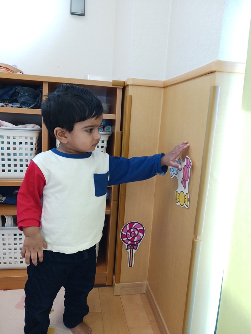 「どこかな~?」と探している子どもたち、お菓子を見つけると「あったー!」と嬉しそうに手を伸ばしていました🍭