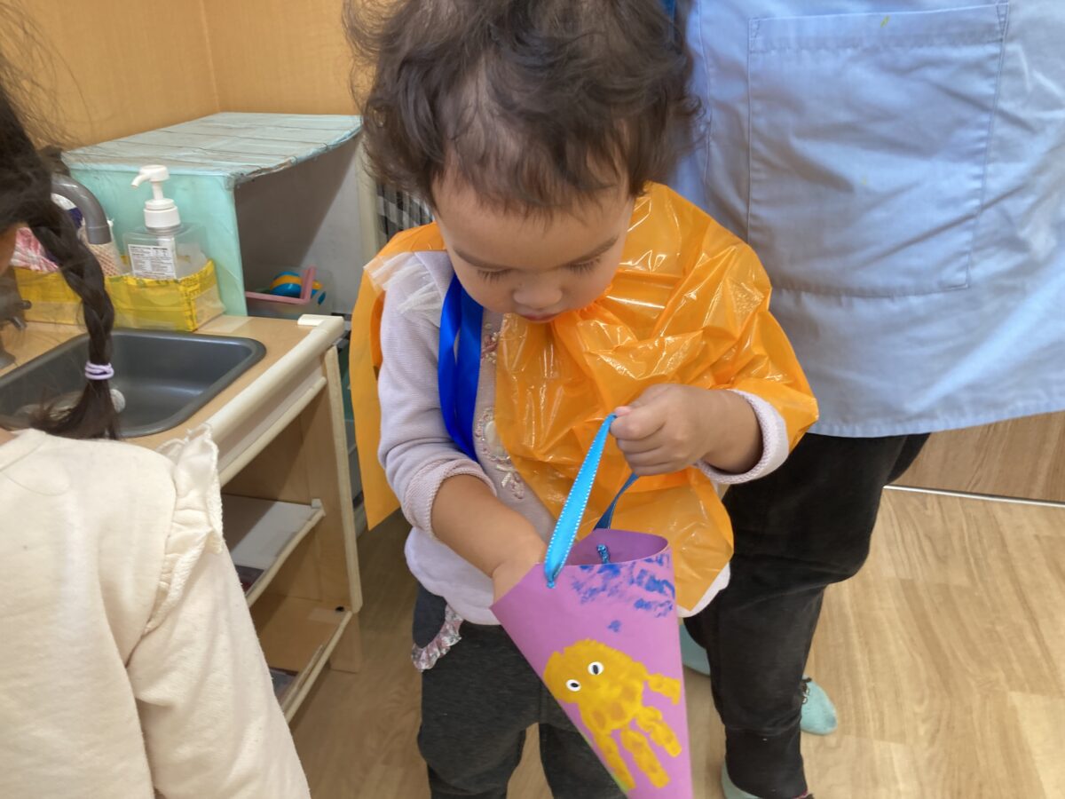 手形で作った可愛いハロウィンバッグを持って、よーいスタート!