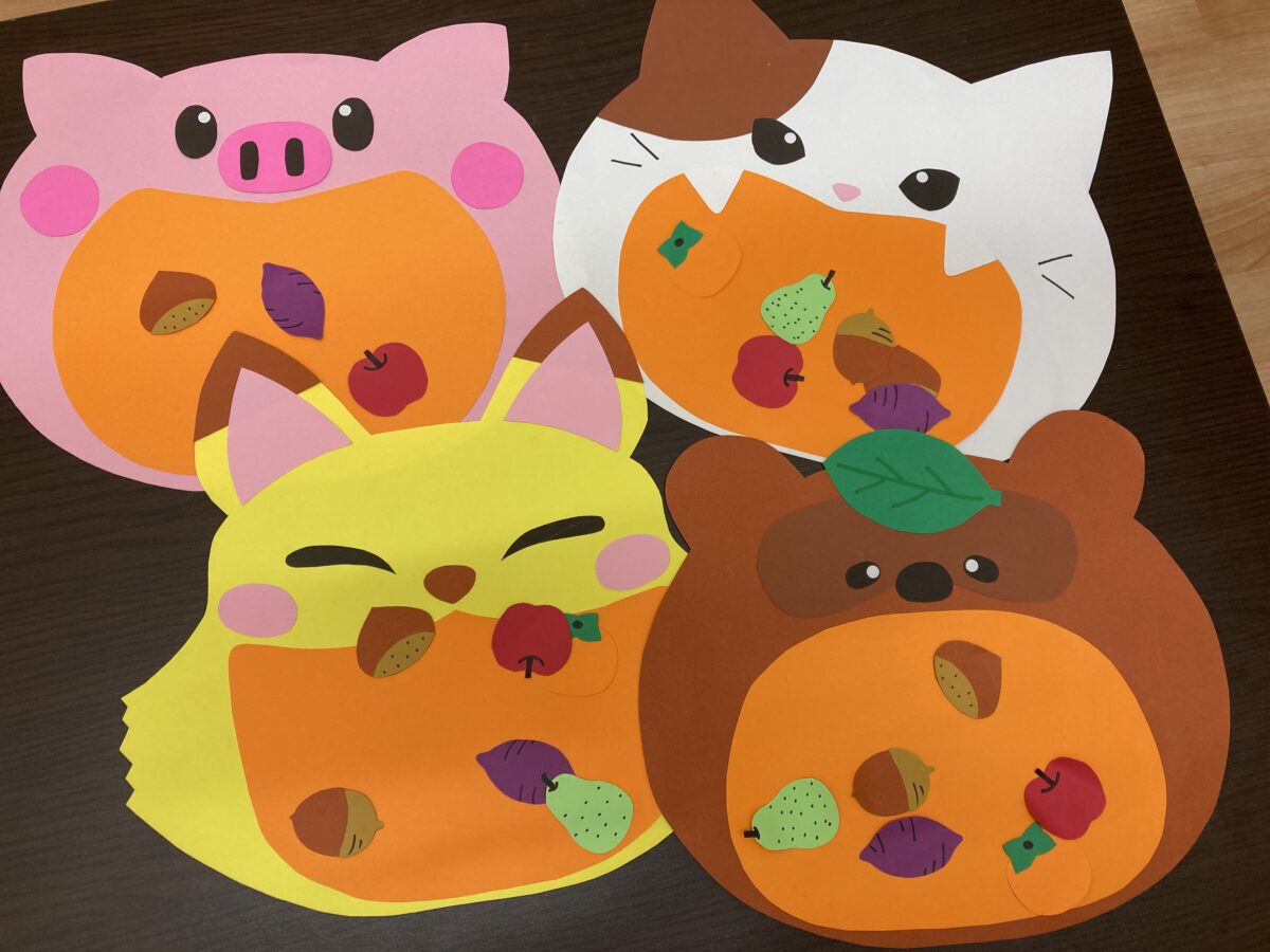 秋の食べ物を動物の口にぺたっと貼り付けて、もぐもぐ、あ~ん