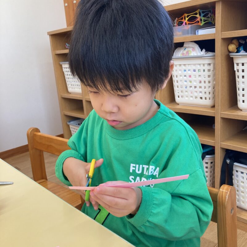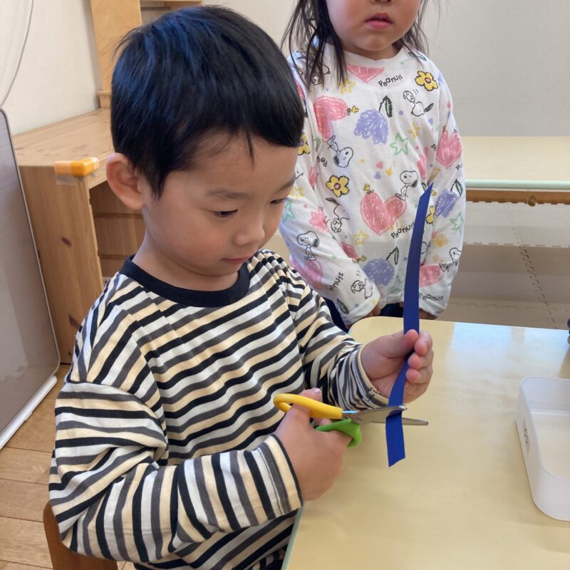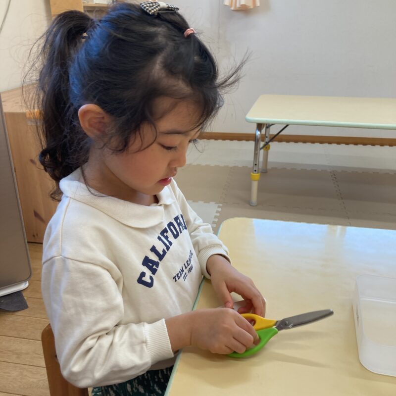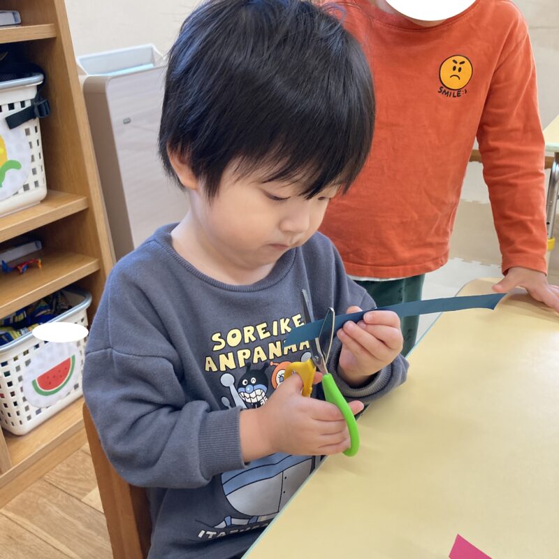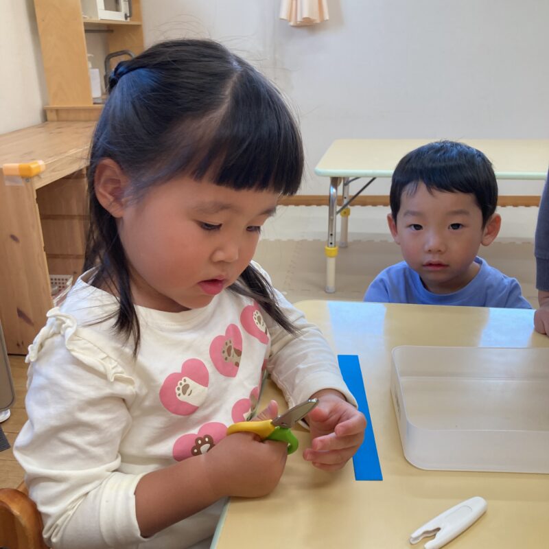 初めてのハサミでしたが、つき組のみんなは興味津々で「やりたーい!」「ハサミできた!」「もう1回やる~!」と、
