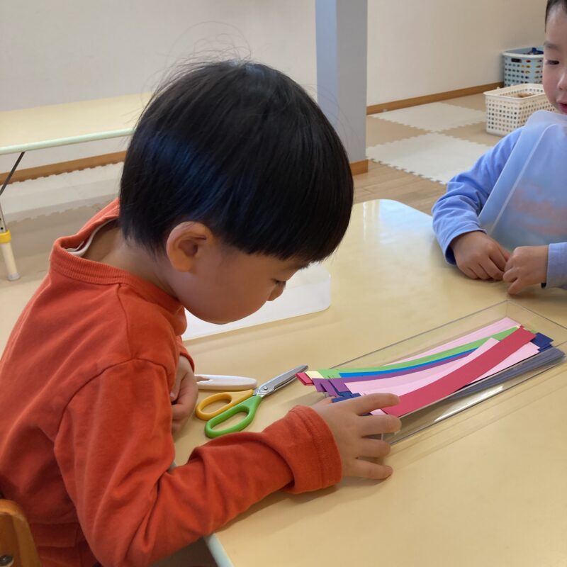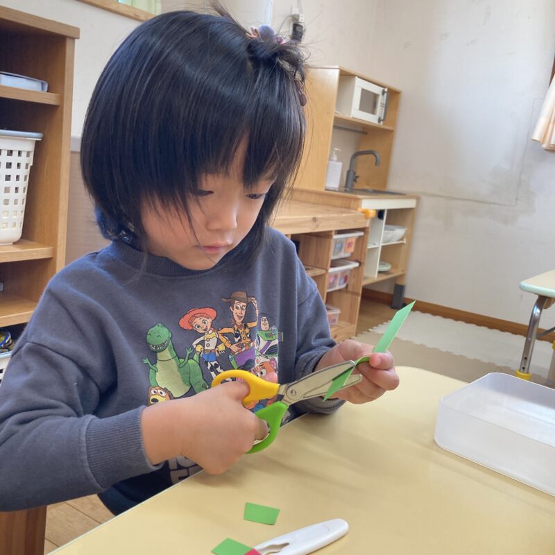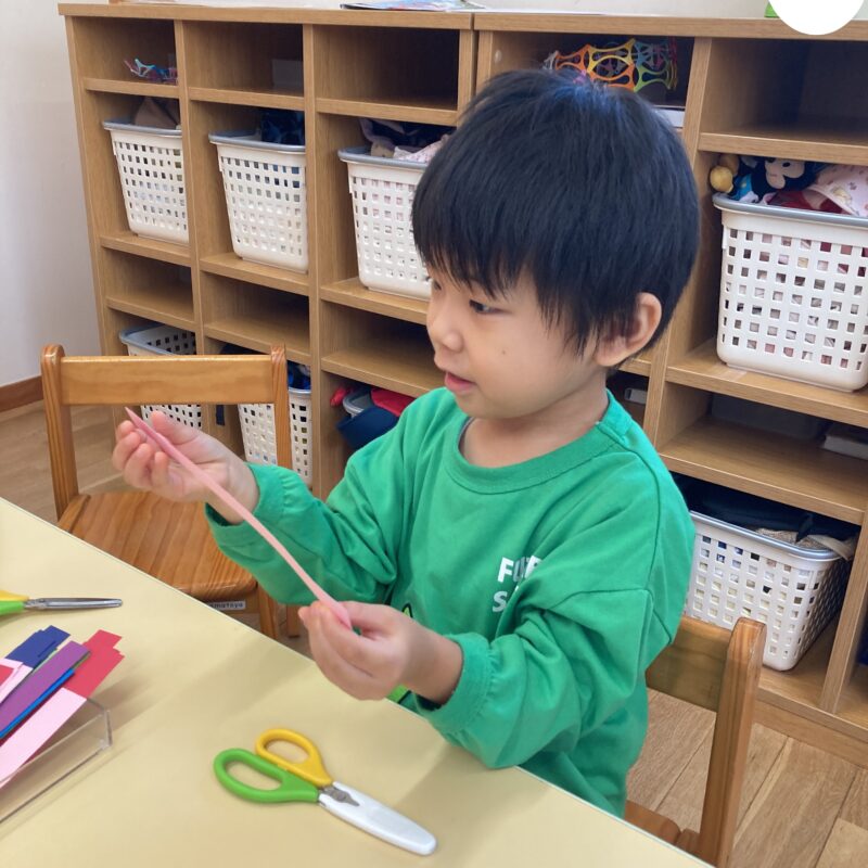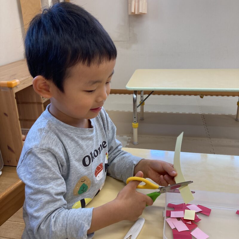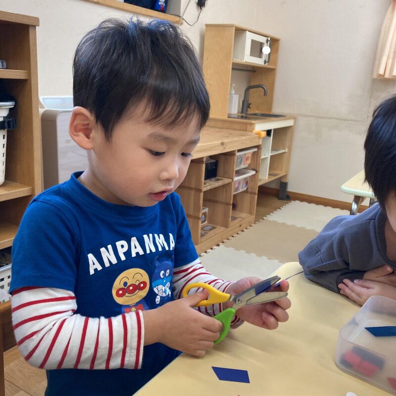 初めてのハサミでしたが、つき組のみんなは興味津々で「やりたーい!」「ハサミできた!」「もう1回やる~!」と、