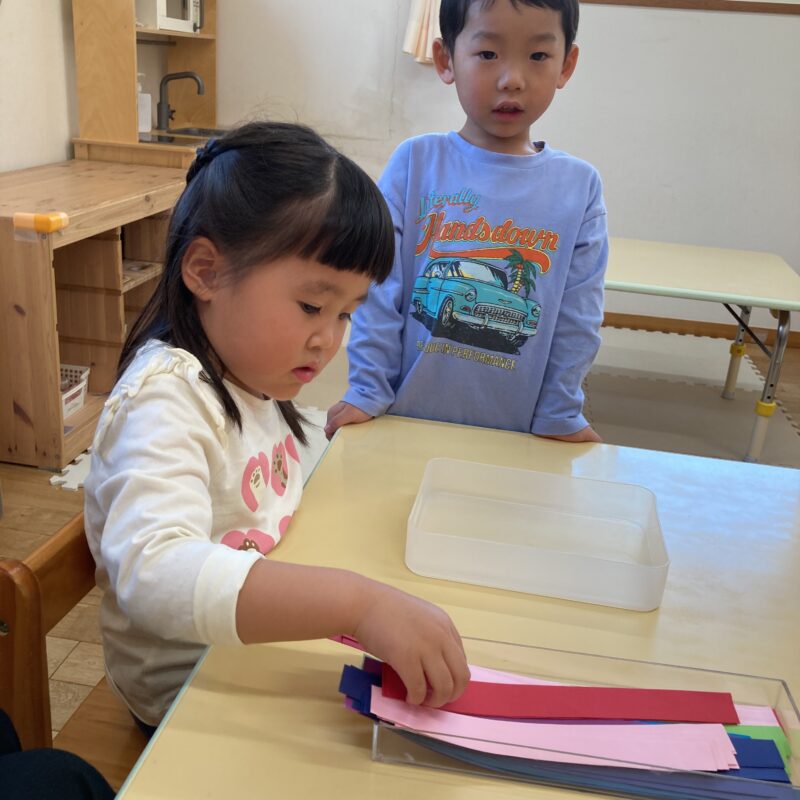 ハサミを使う前に保育士が切った物や、実際にハサミを使って切っているところを見ると・・・💭