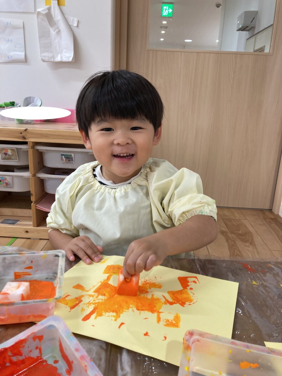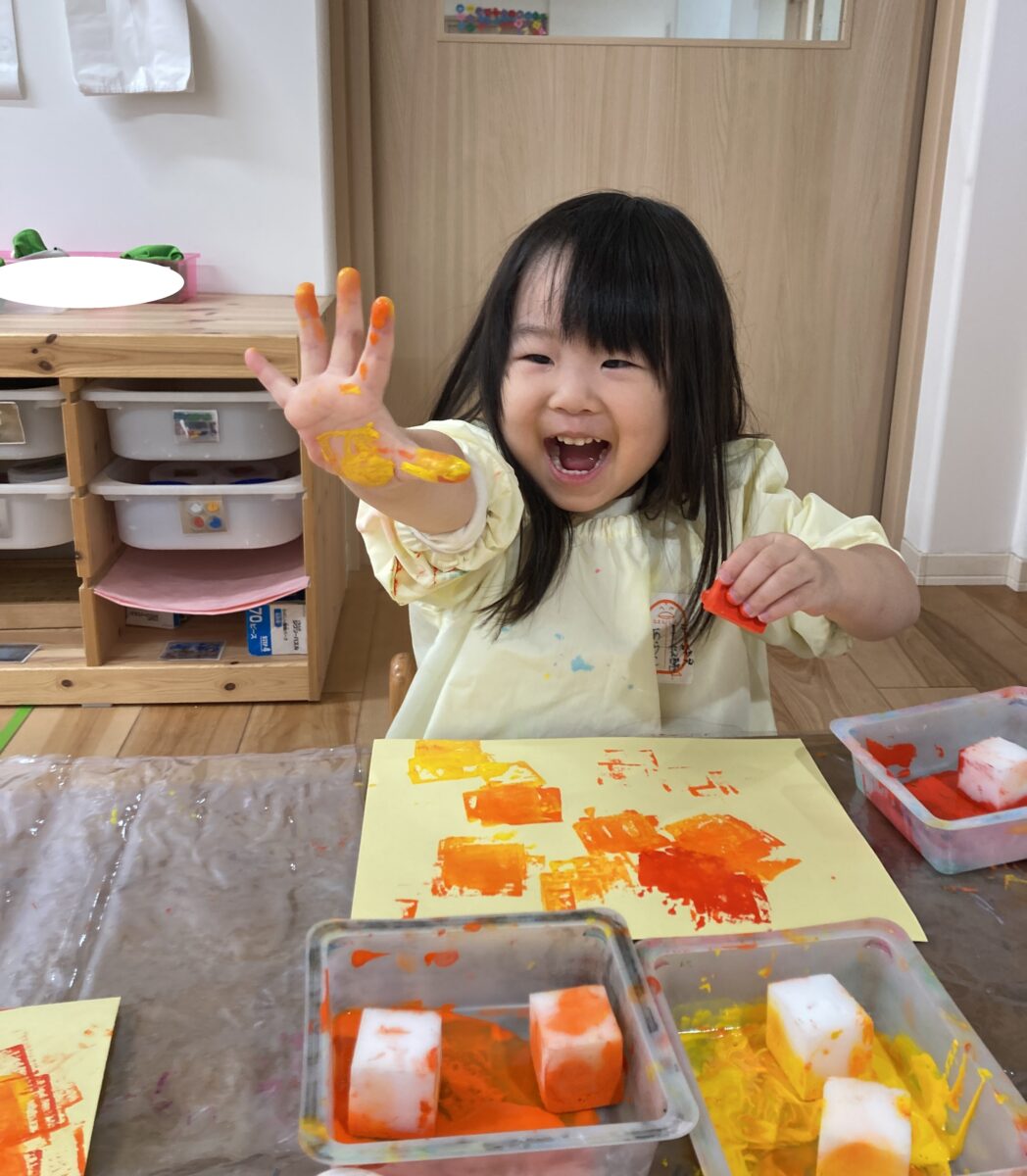 手についた絵の具を「ついちゃった~!」と喜んでいます![]()