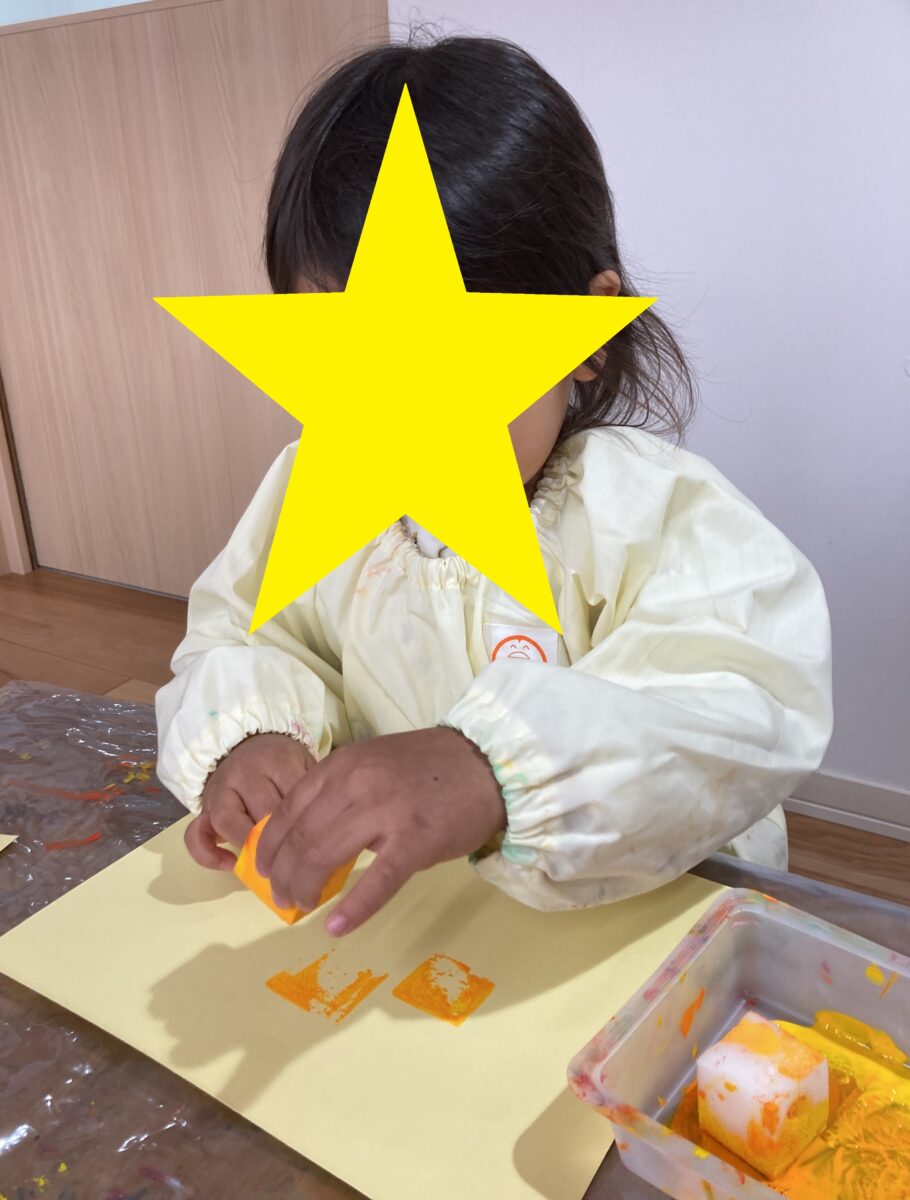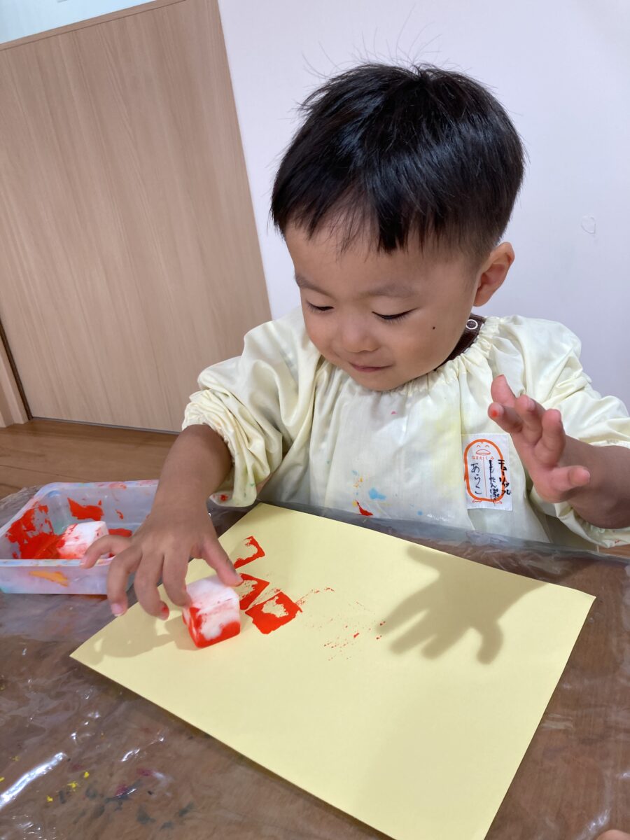 メラミンスポンジスに絵の具をつけて画用紙にペタッ!