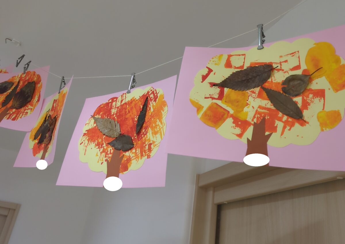 赤・黄色・オレンジと、そして拾ってきた落ち葉を貼ってまるで本物の紅葉のような作品ができあがりました![]()