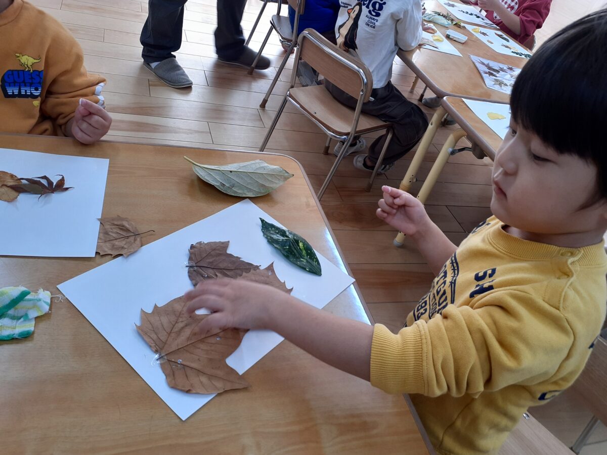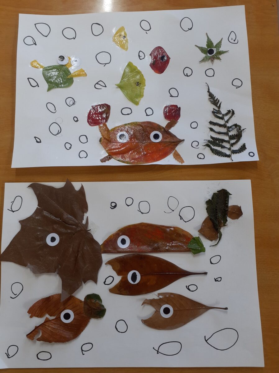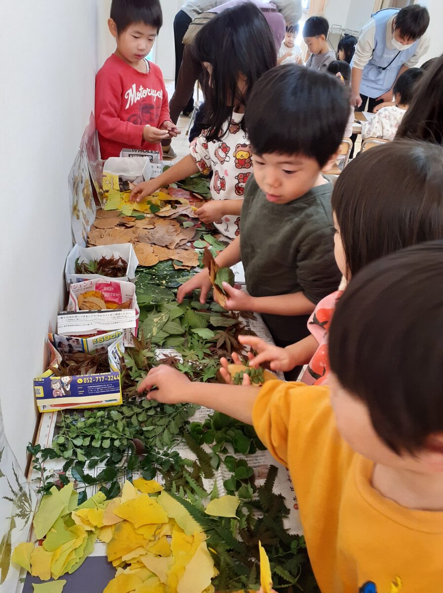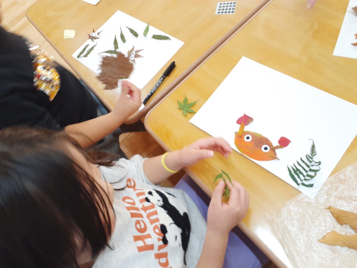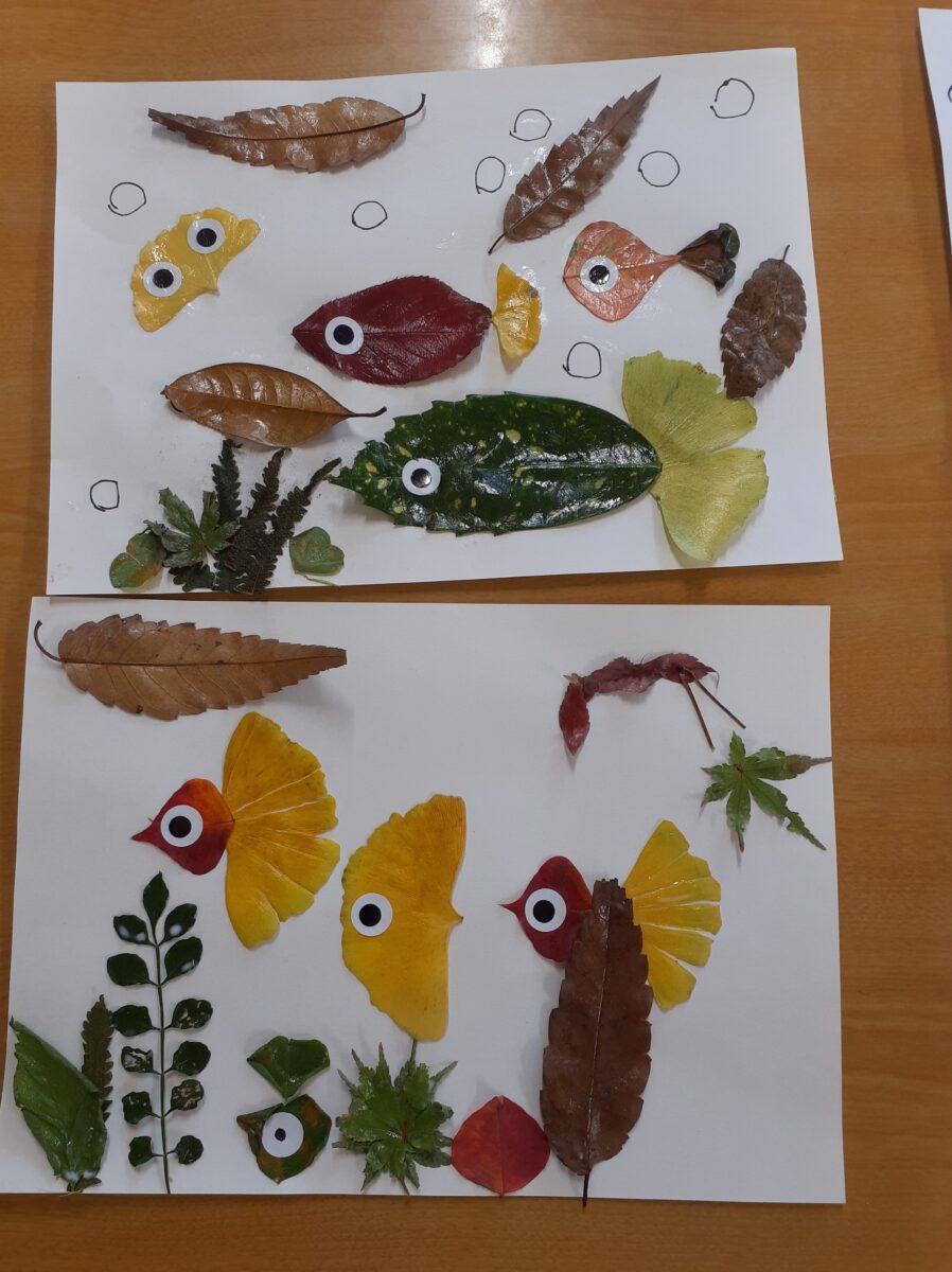 お友だちと見せ合いっこしたり、葉っぱ先生にアドバイスを頂いたりして自分だけの「葉っぱ水族館」が完成しました。