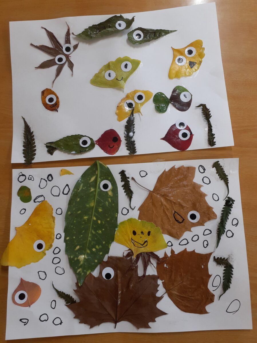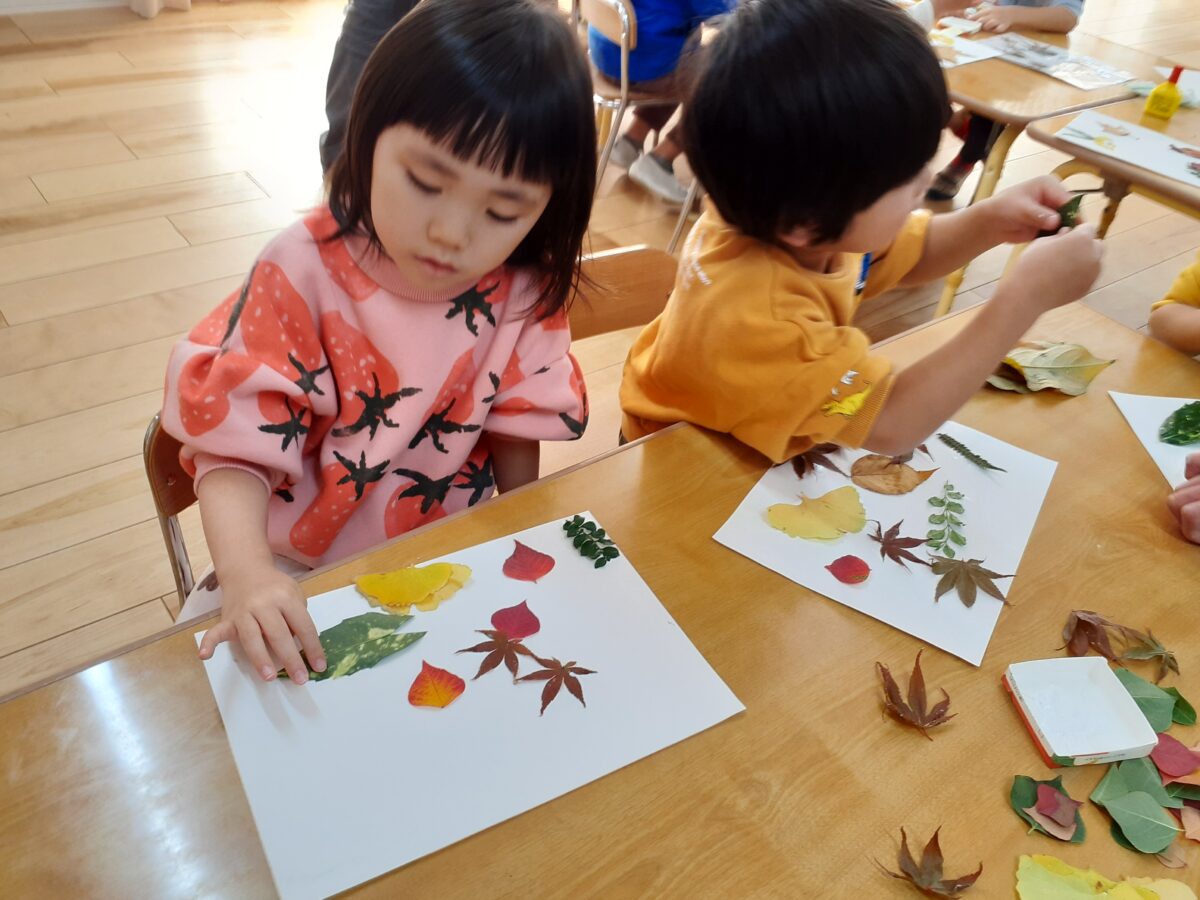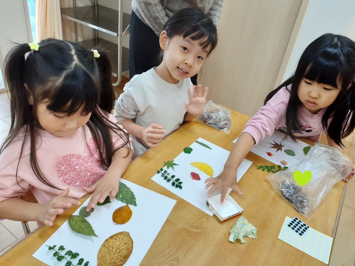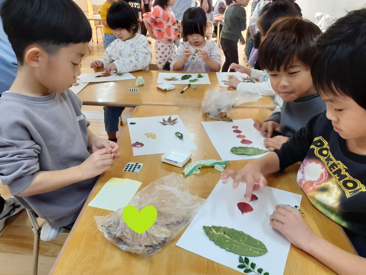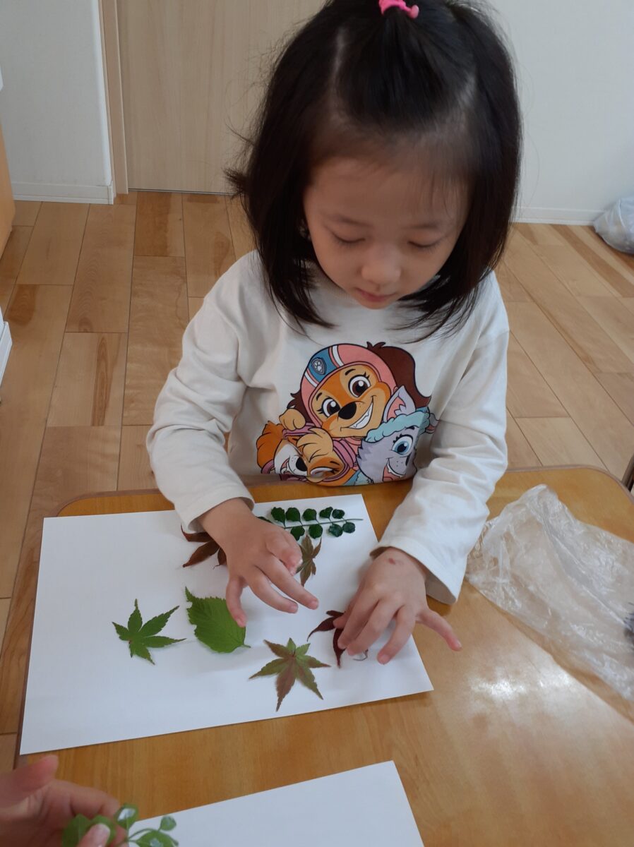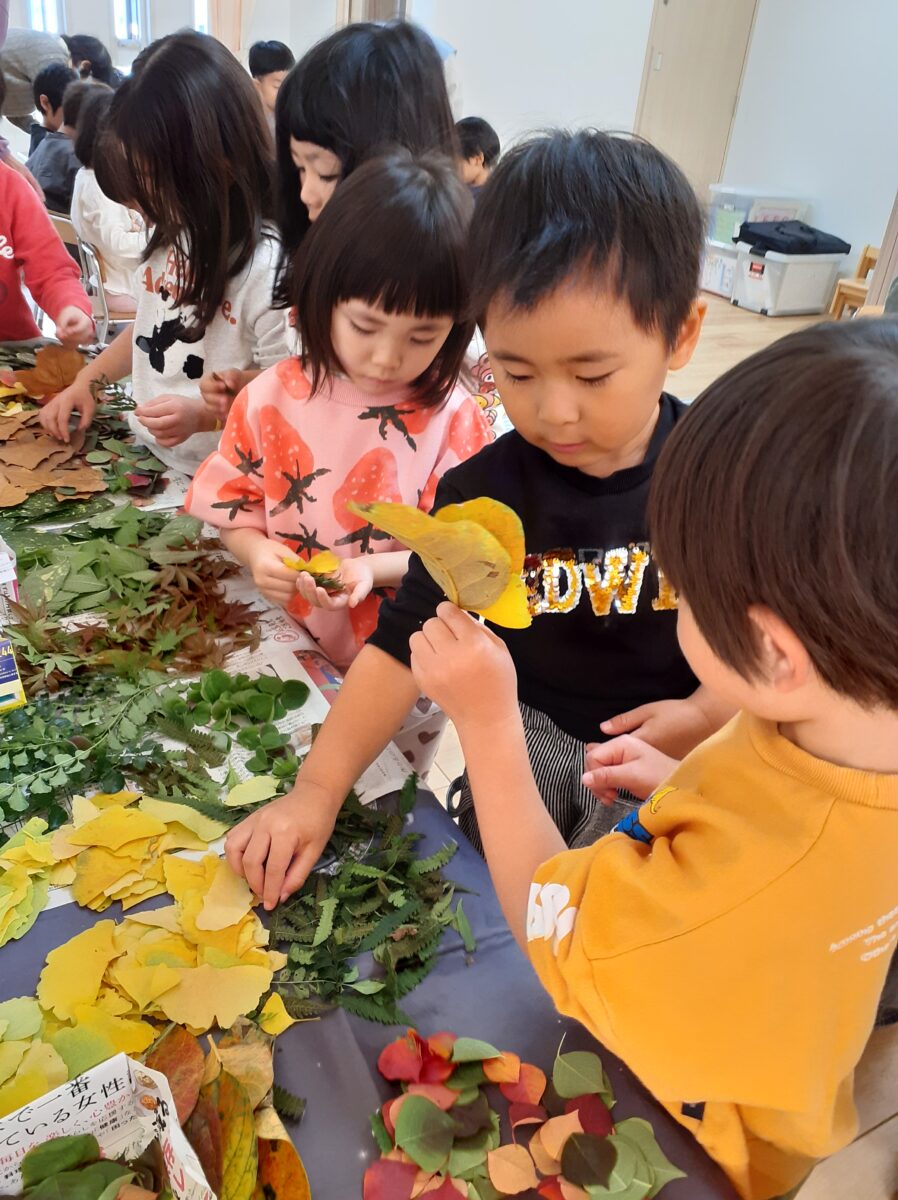 お友だちと見せ合いっこしたり、葉っぱ先生にアドバイスを頂いたりして自分だけの「葉っぱ水族館」が完成しました。