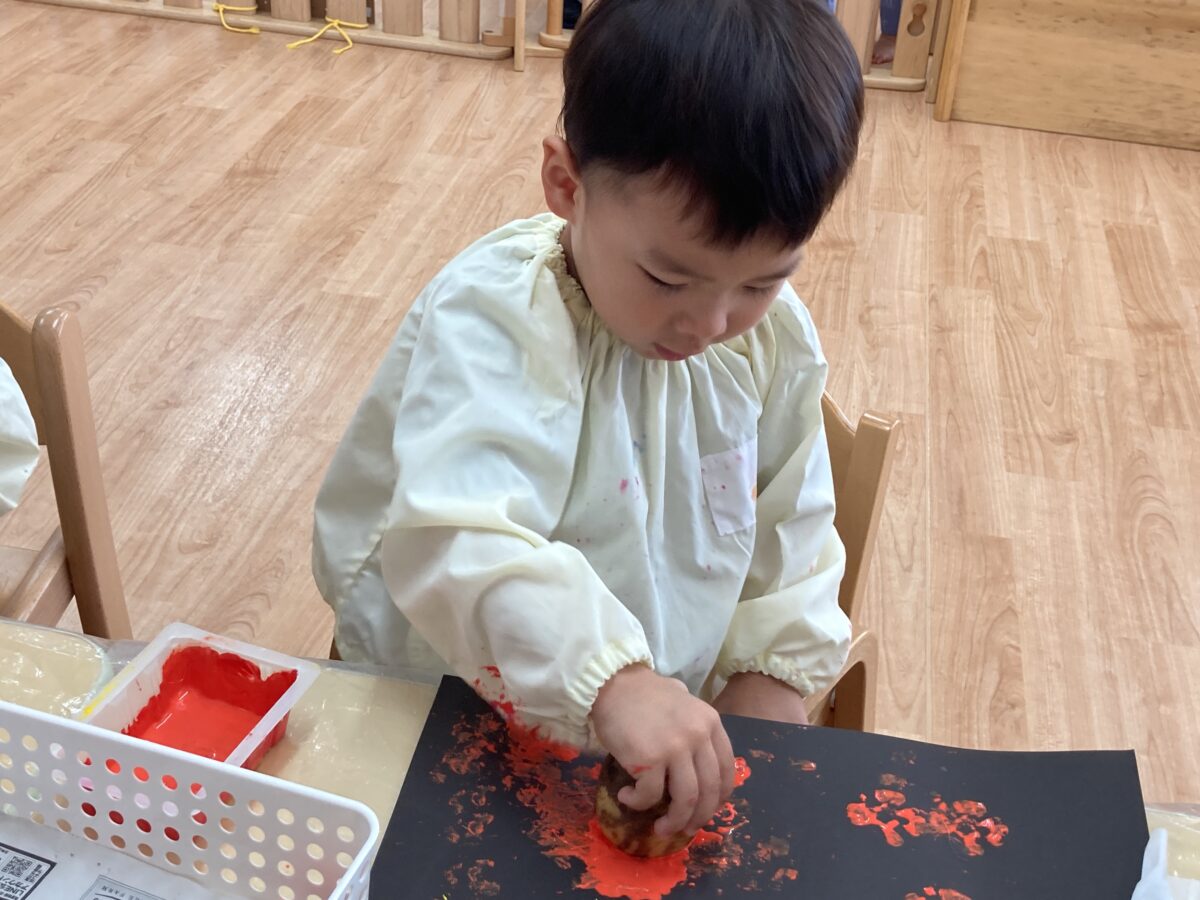 4月からくま組さんが一生懸命育ててくれた野菜や、秋の食材を使ってスタンプをしましたよ!