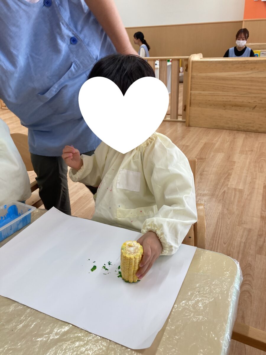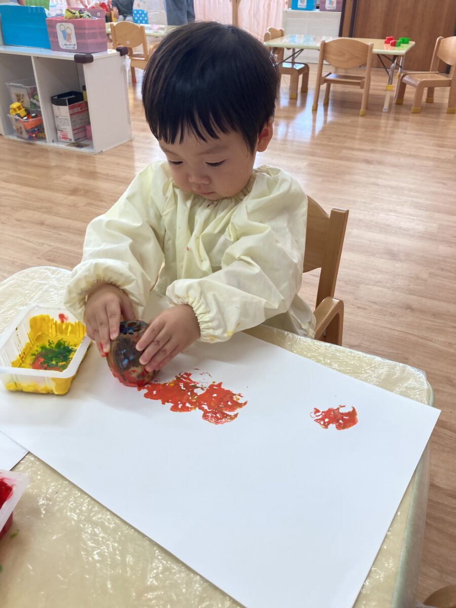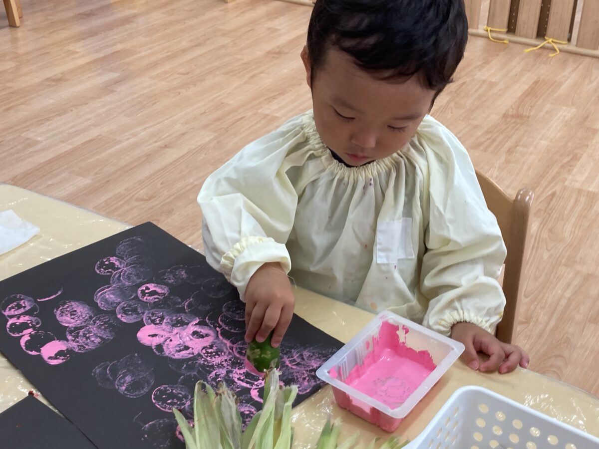 スタンプを重ねて花火のようにしたり、野菜の形を見て楽しんだりと集中してスタンプをしていましたよ🍠