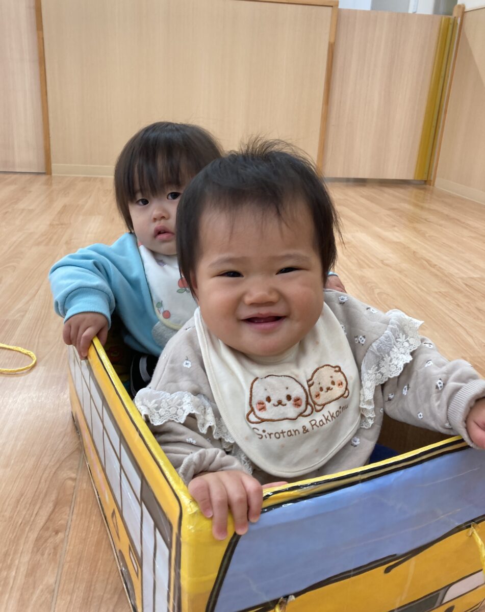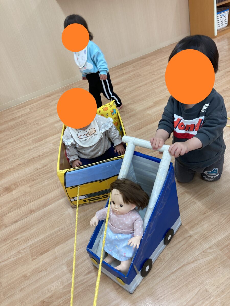 バスや車に乗ってお散歩ごっこ!「バスにのって」の歌に合わせて気分はお父さん♪