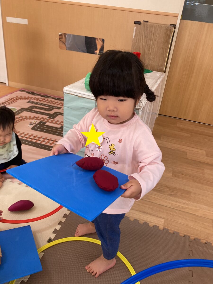 お皿にたくさんのお芋を乗せ上手に歩いています