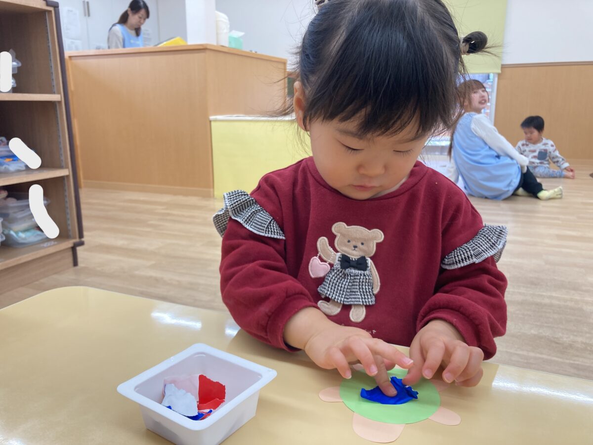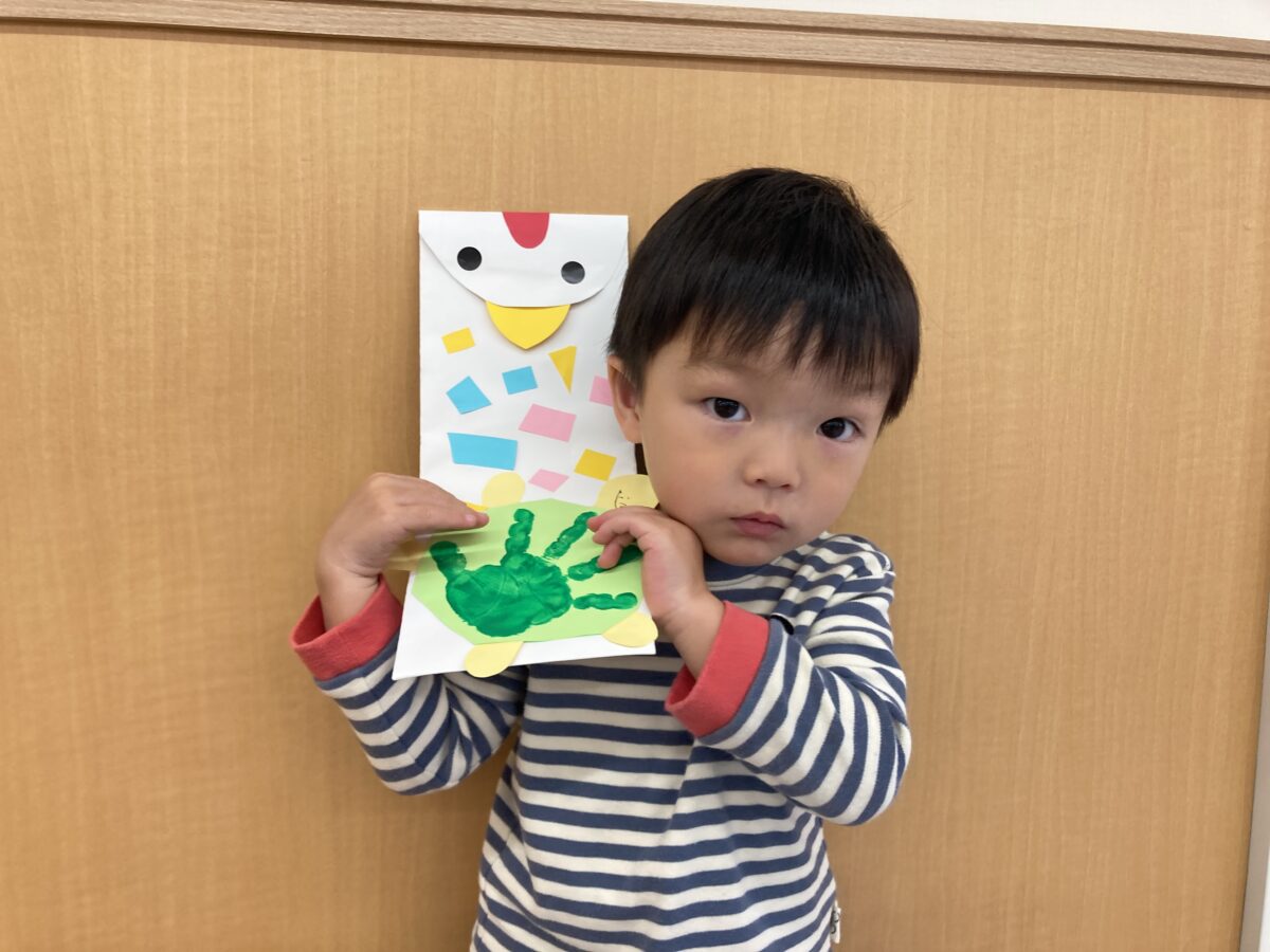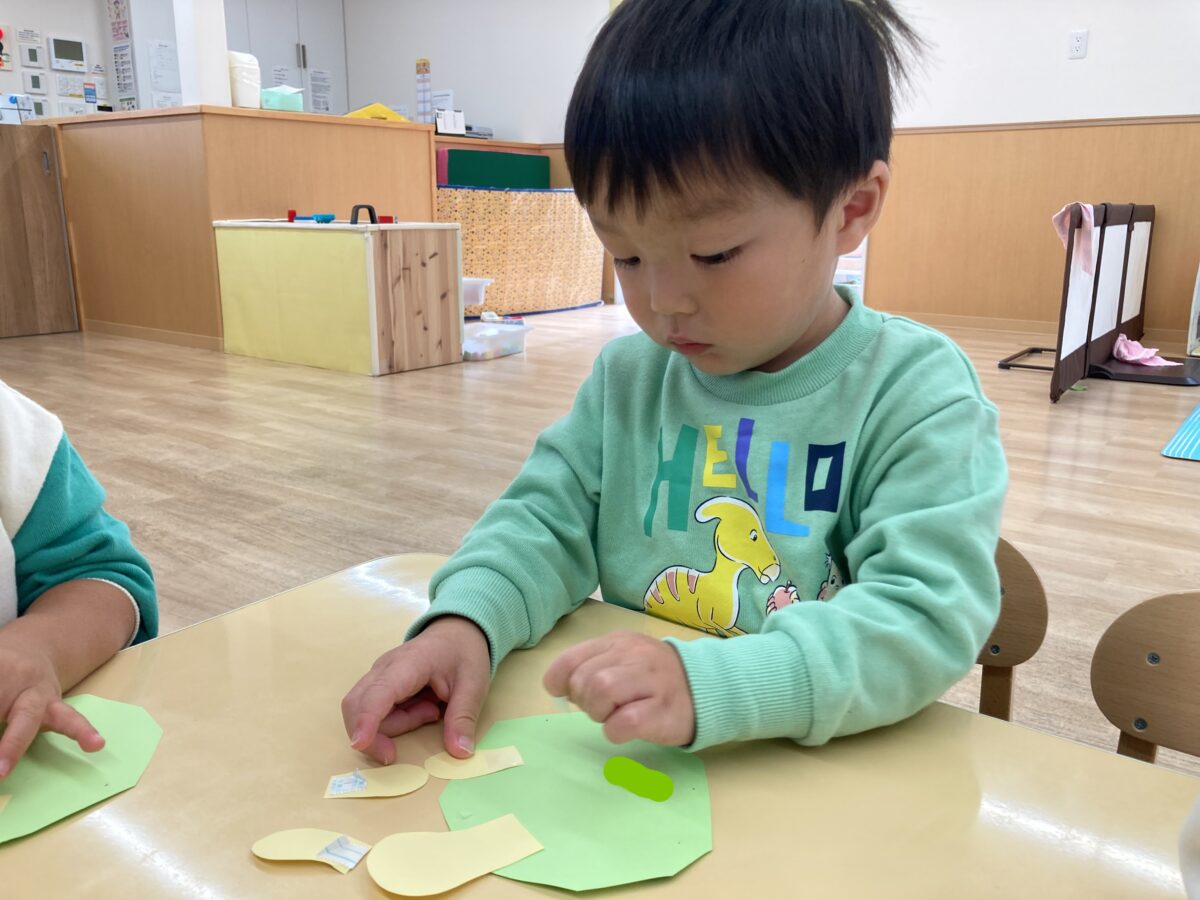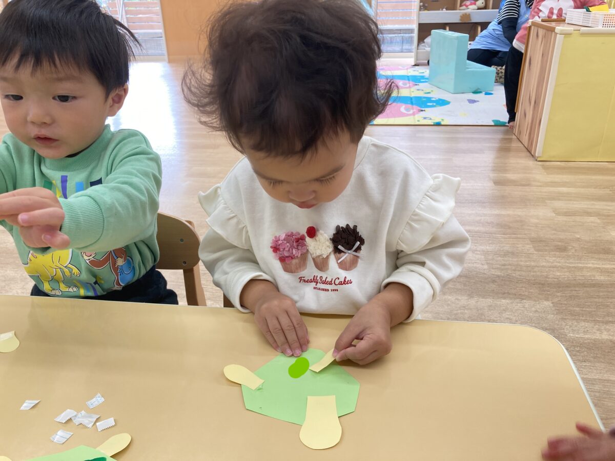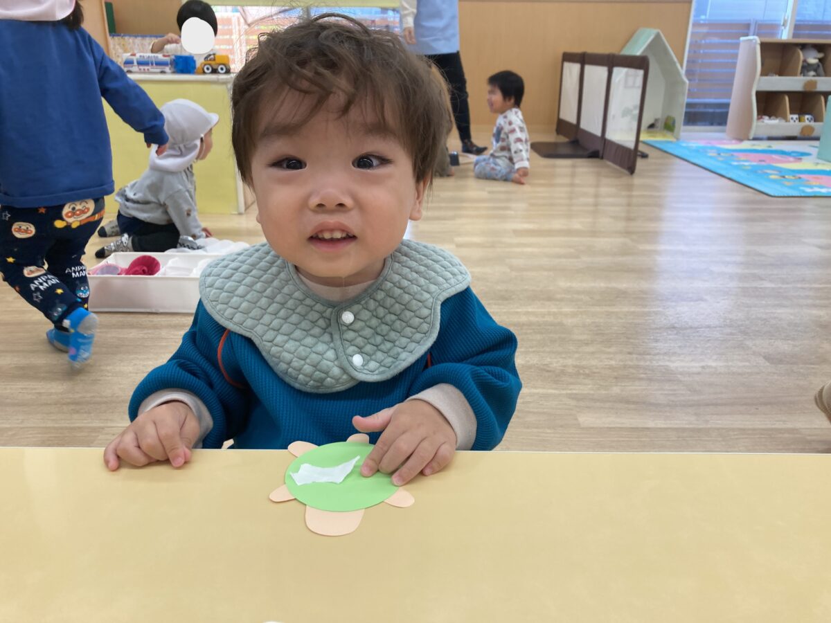 もも組さんは手形スタンプをしたり、好きな色の折り紙をビリビリ破ってカメの甲羅を自分で飾りつけをしたりしました🐢