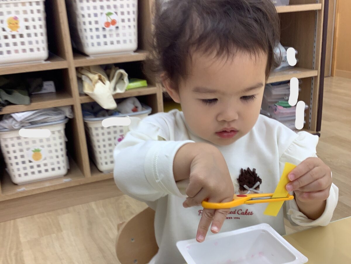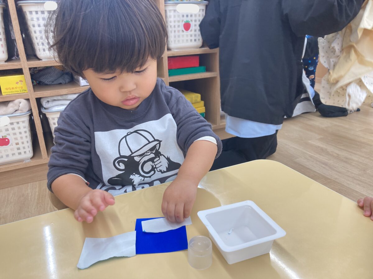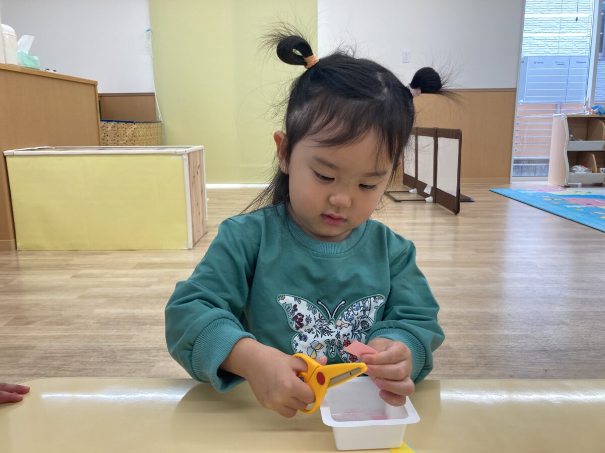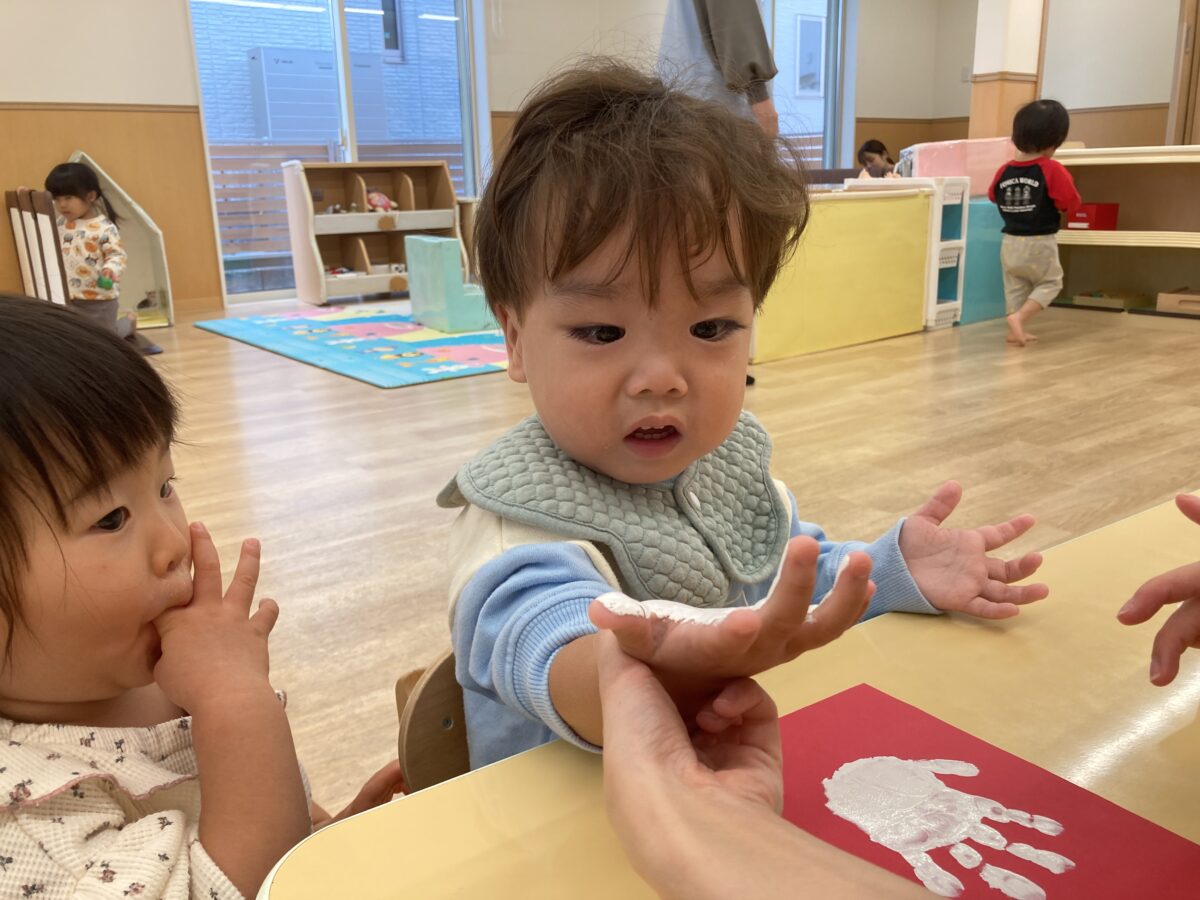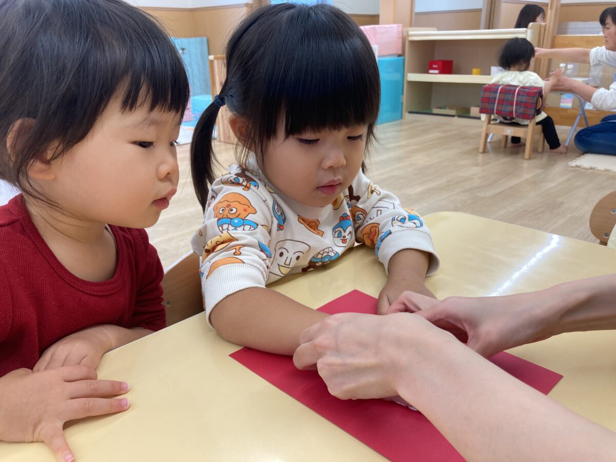 もも組さんは手形スタンプをしたり、好きな色の折り紙をビリビリ破ってカメの甲羅を自分で飾りつけをしたりしました🐢
