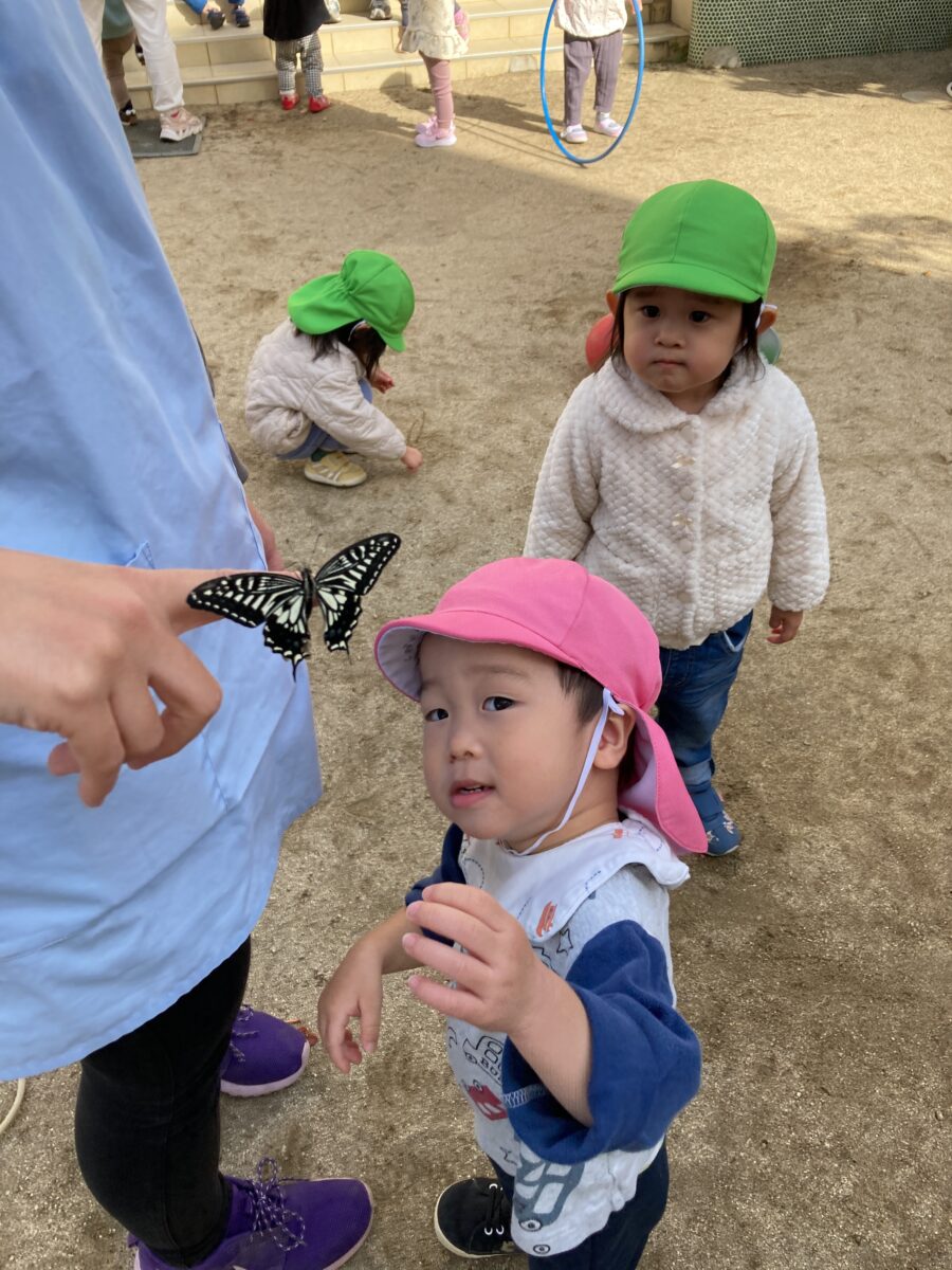 またある時、アゲハ蝶が園庭に遊びに来てくれました🦋「えーー!すごーい!」「見せて見せて~」と大興奮の子どもたち