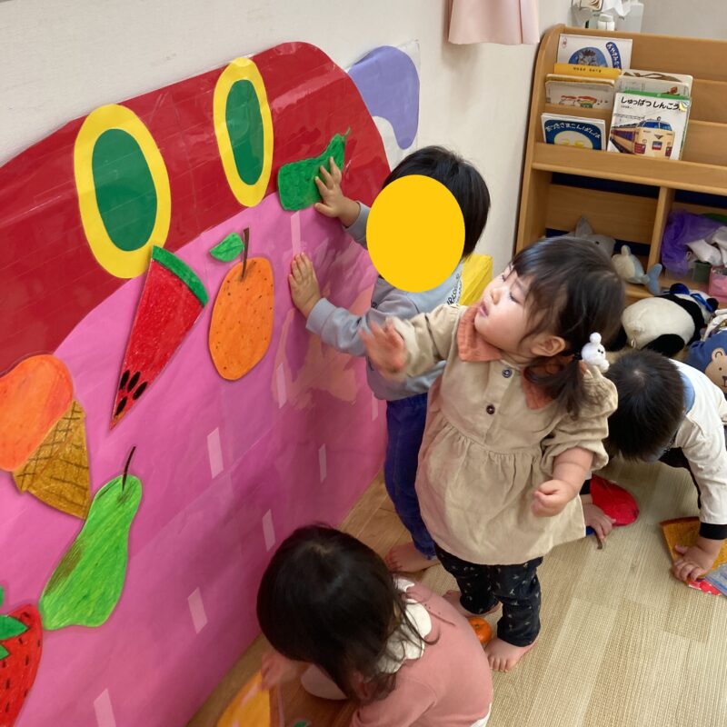 あおむしの口の中に「あーん!」と言いながら、様々な食べ物を食べさせて楽しんでいます