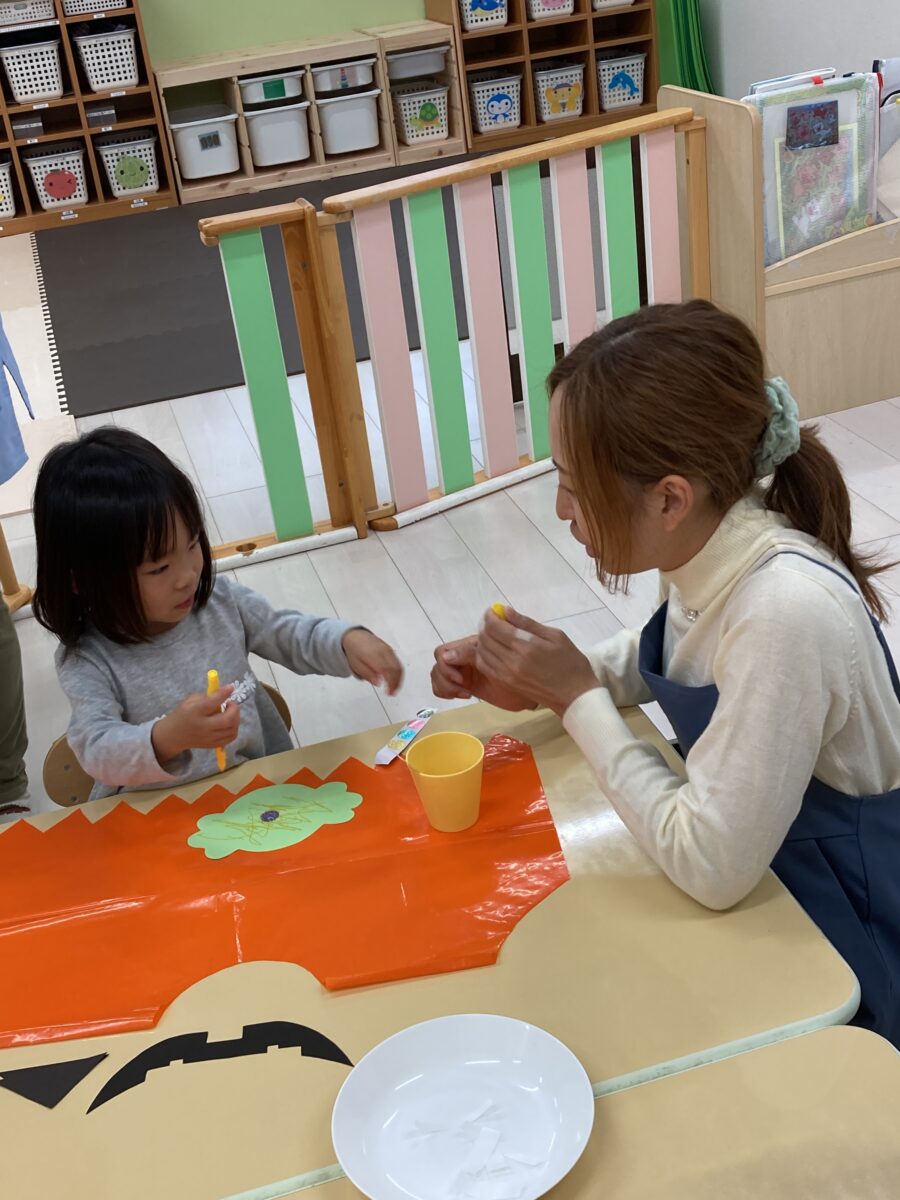 ハロウィンのお話と製作の説明を聞いたら、製作スタート!
