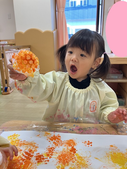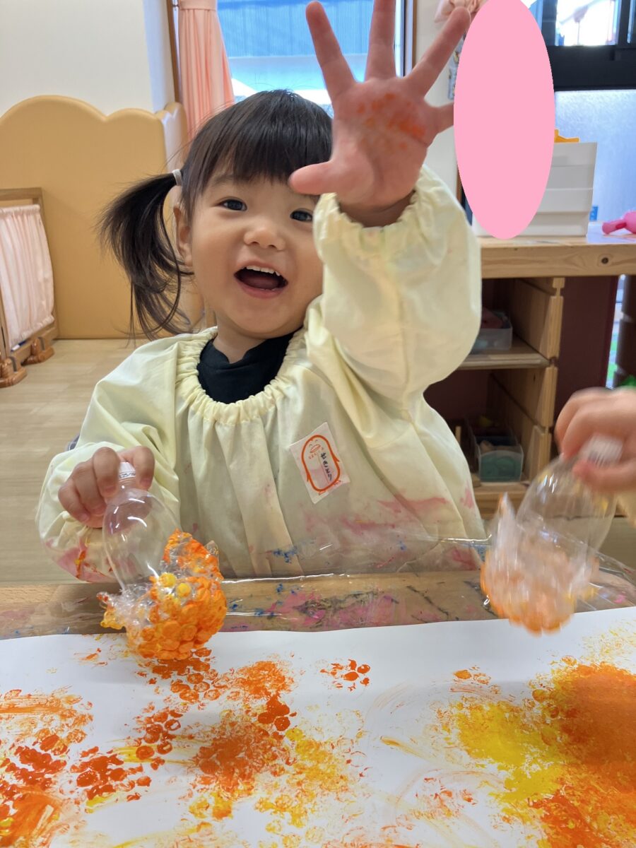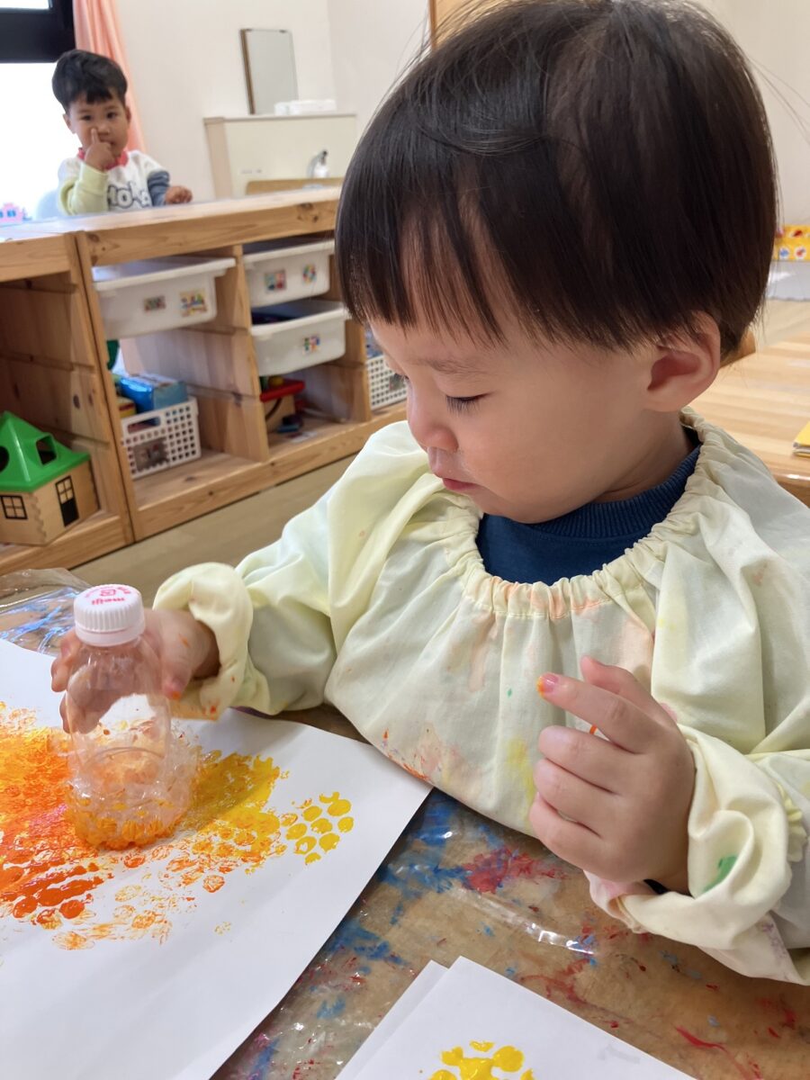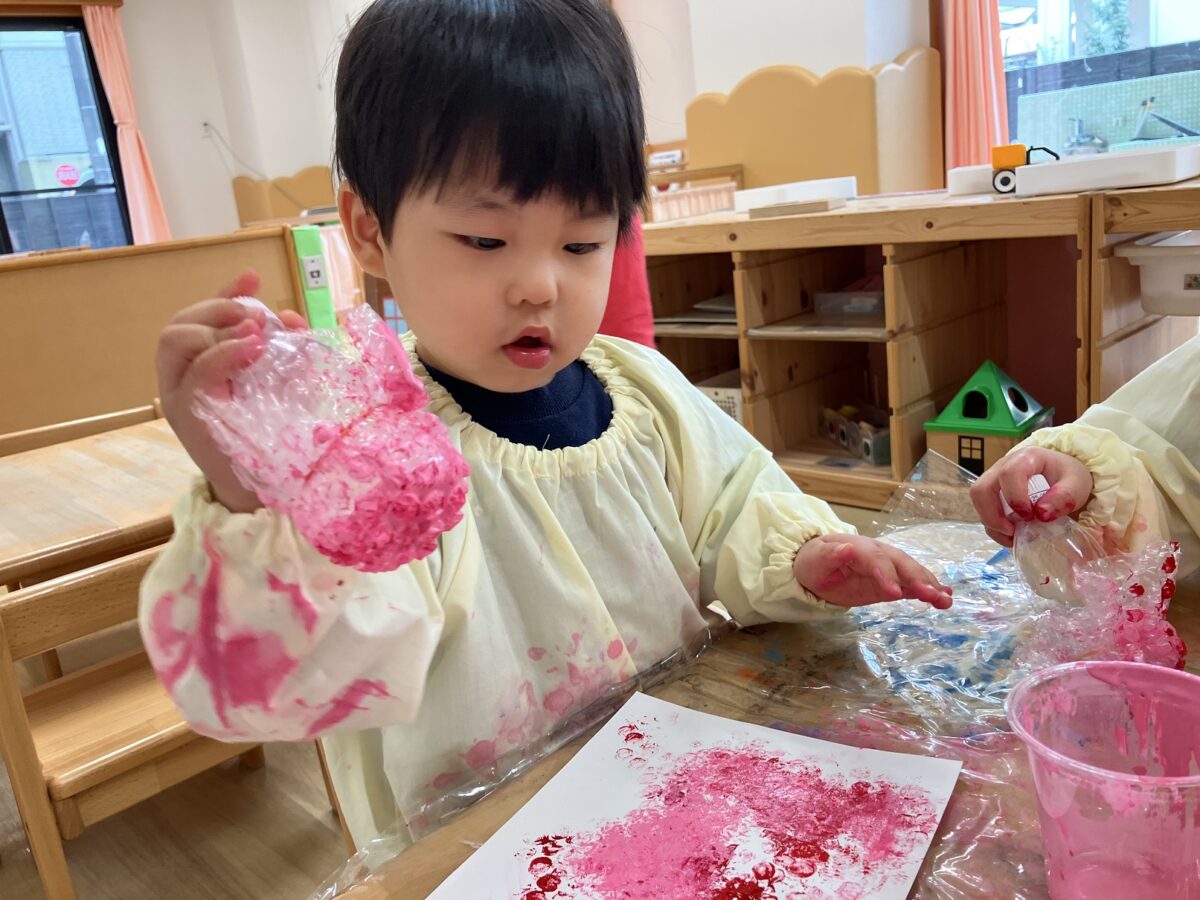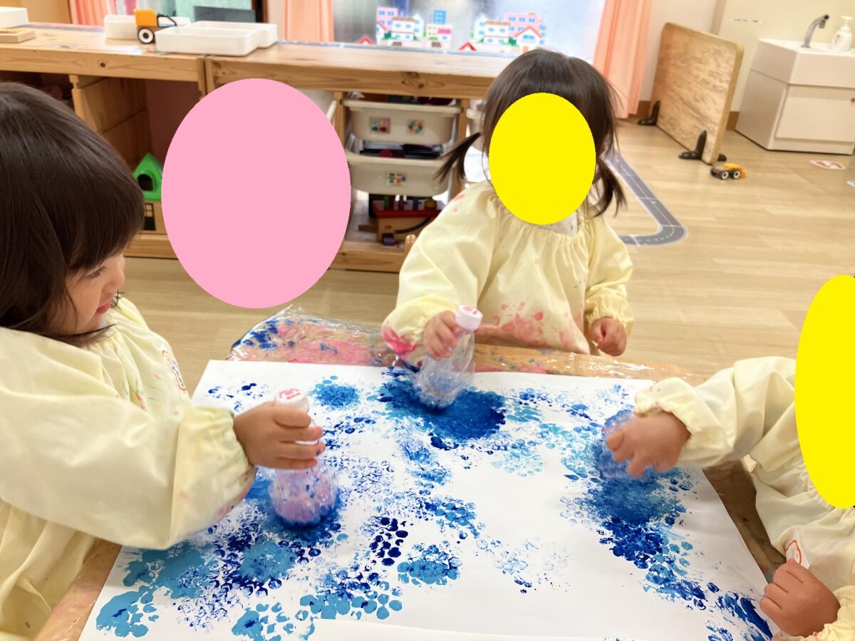 保育者が「色が混ざっていると綺麗だね」というと子どもから「きれいだね」という言葉も出てきました