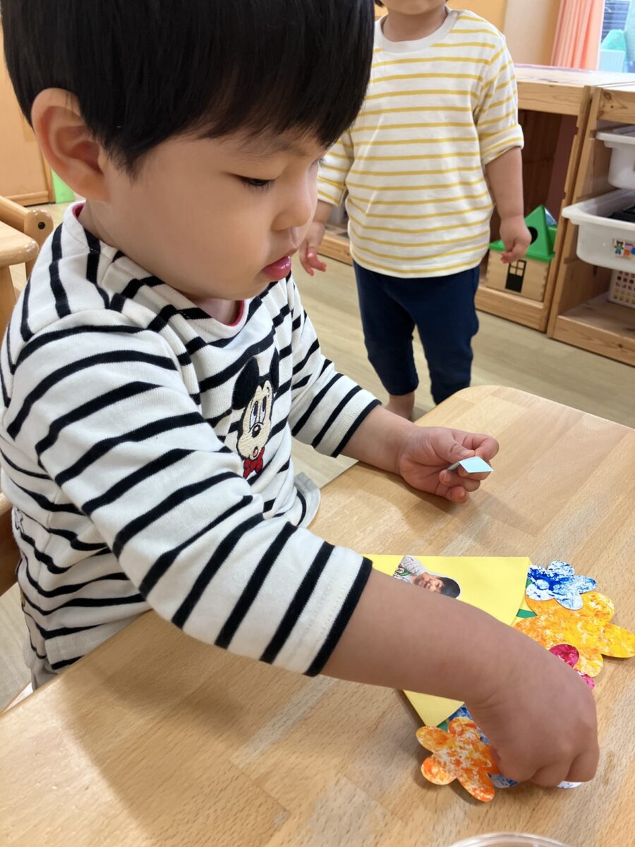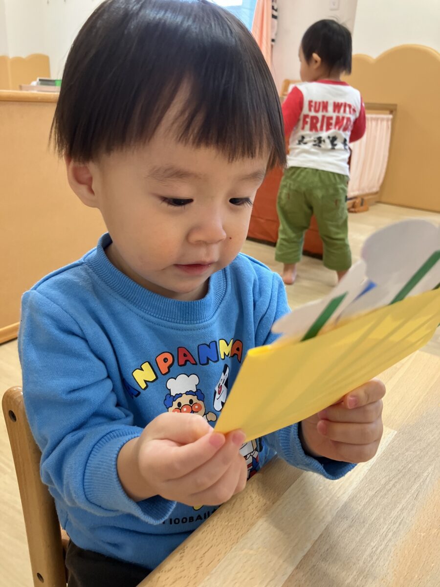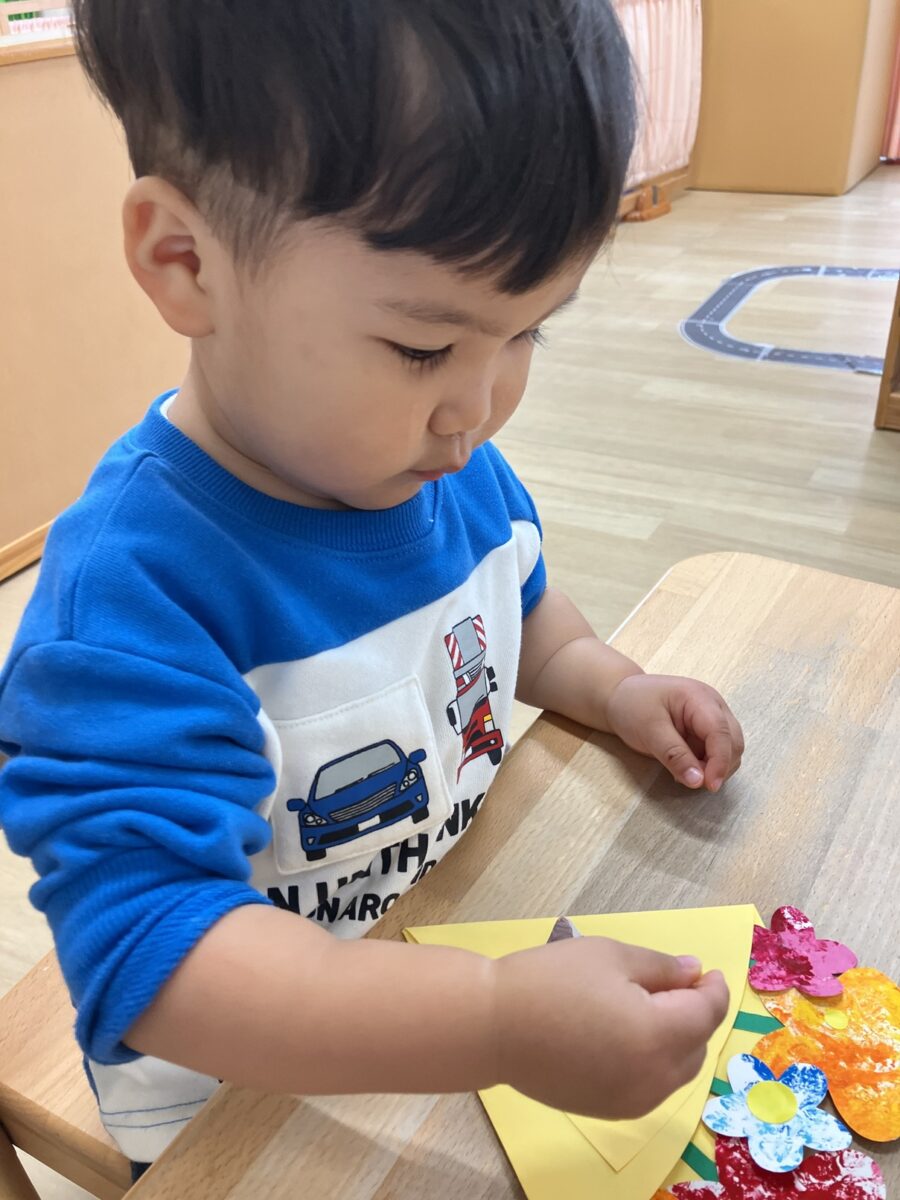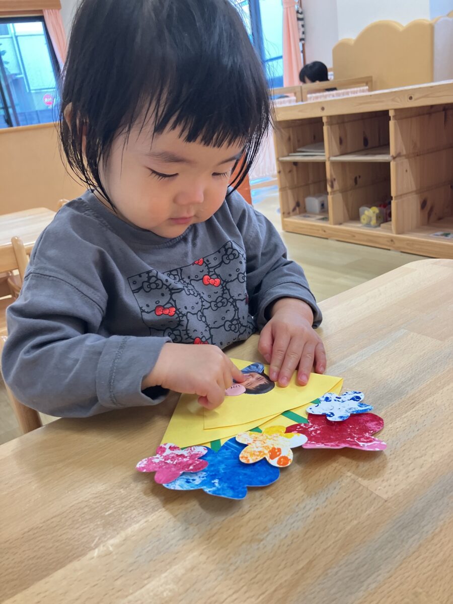 今日はたんぽぽ組(1歳児)の制作を楽しむ様子をご紹介したいと思います。