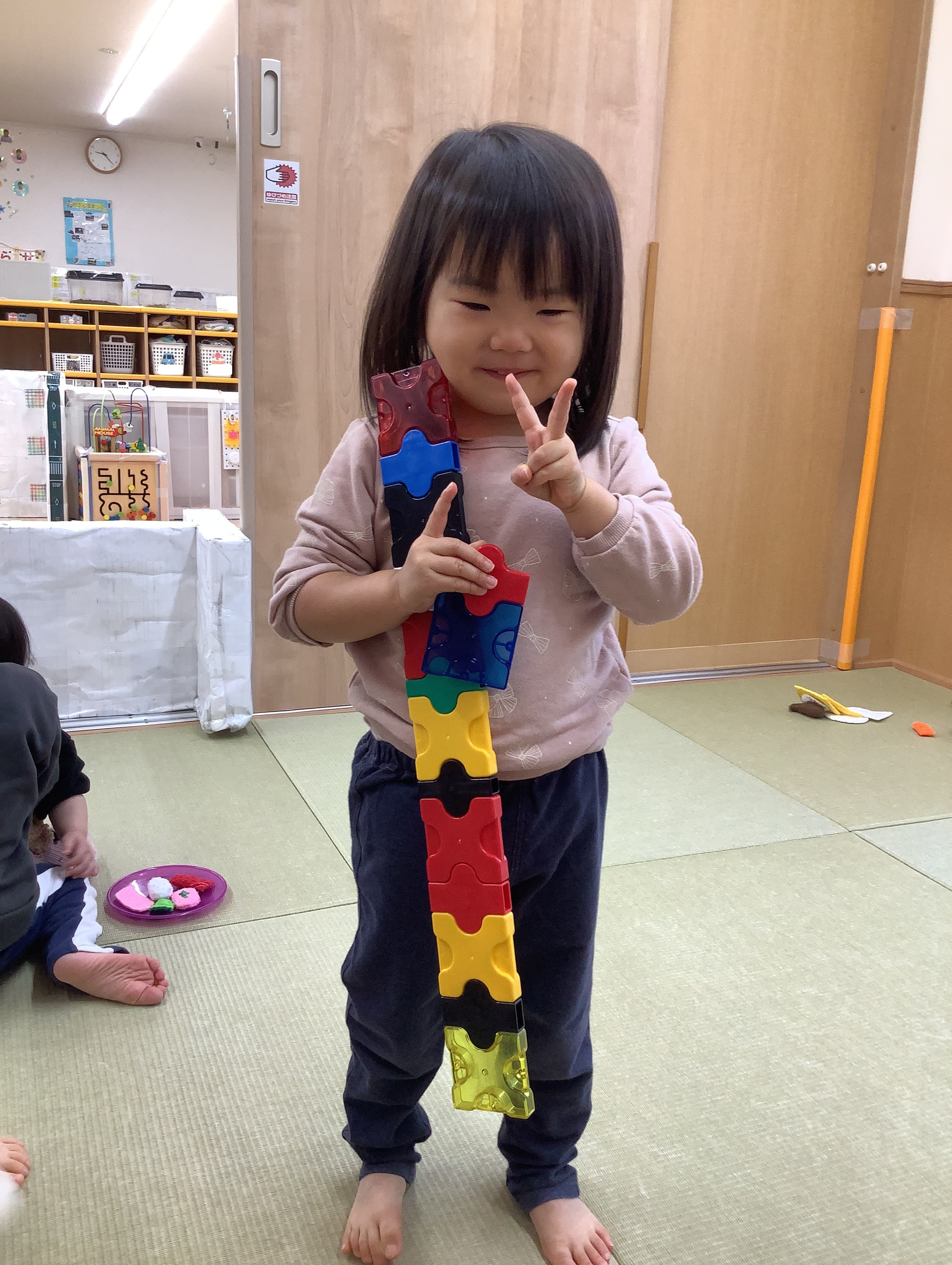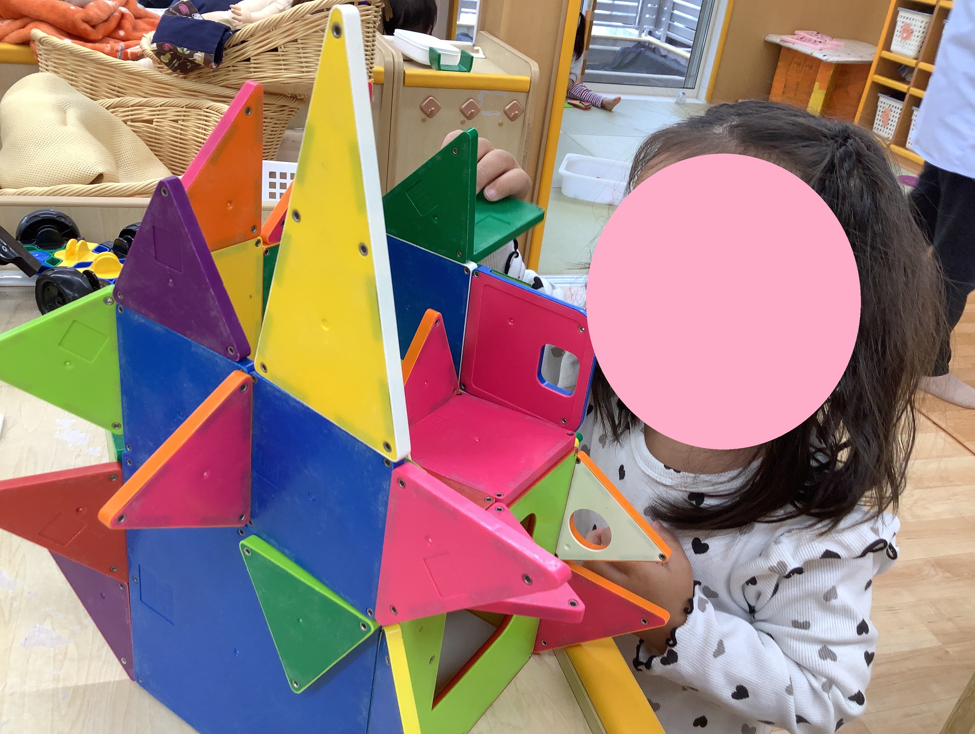 2歳児クラスのパンダ組さんがピタゴラスで『おうち』を作っていました❕