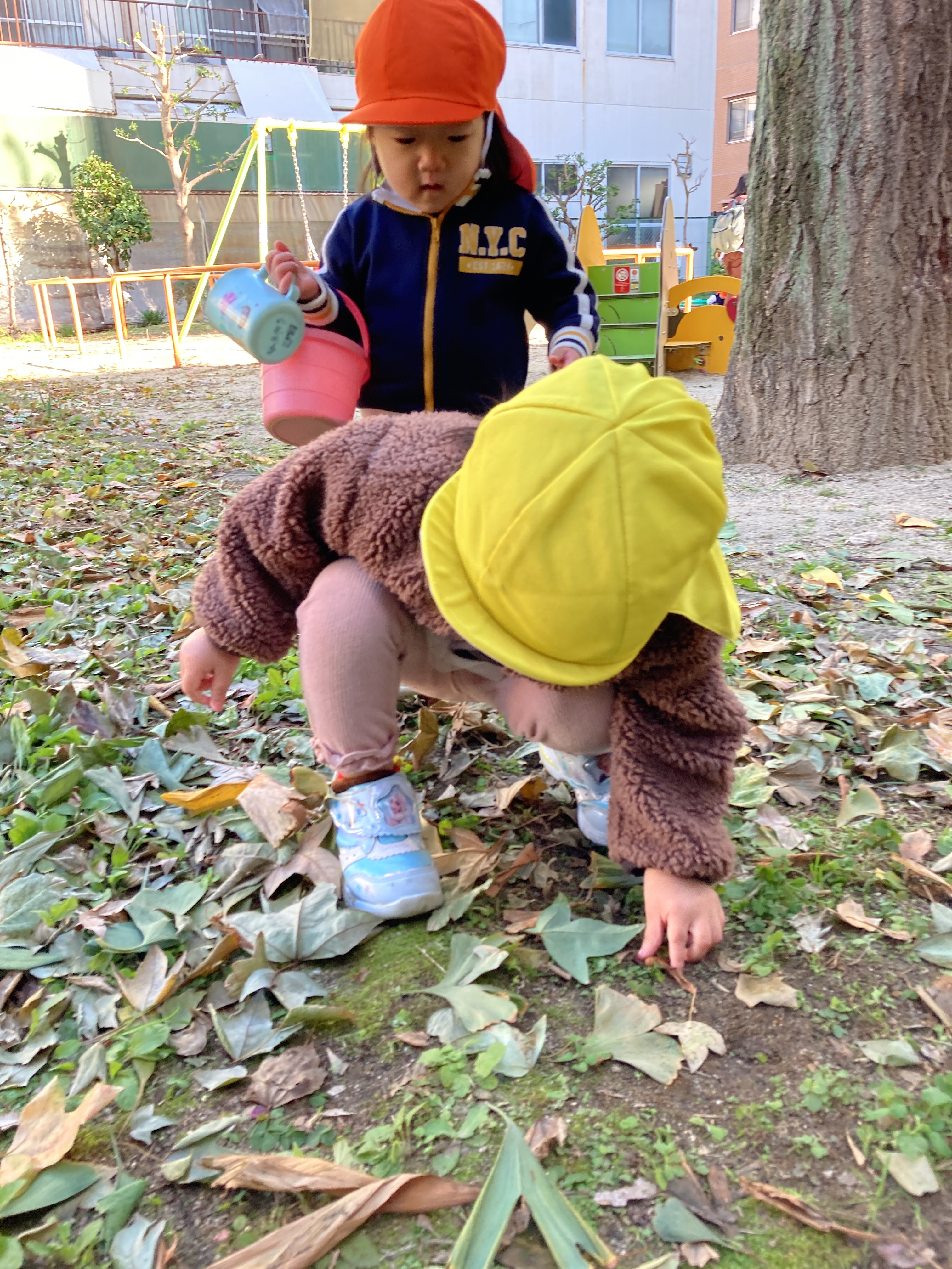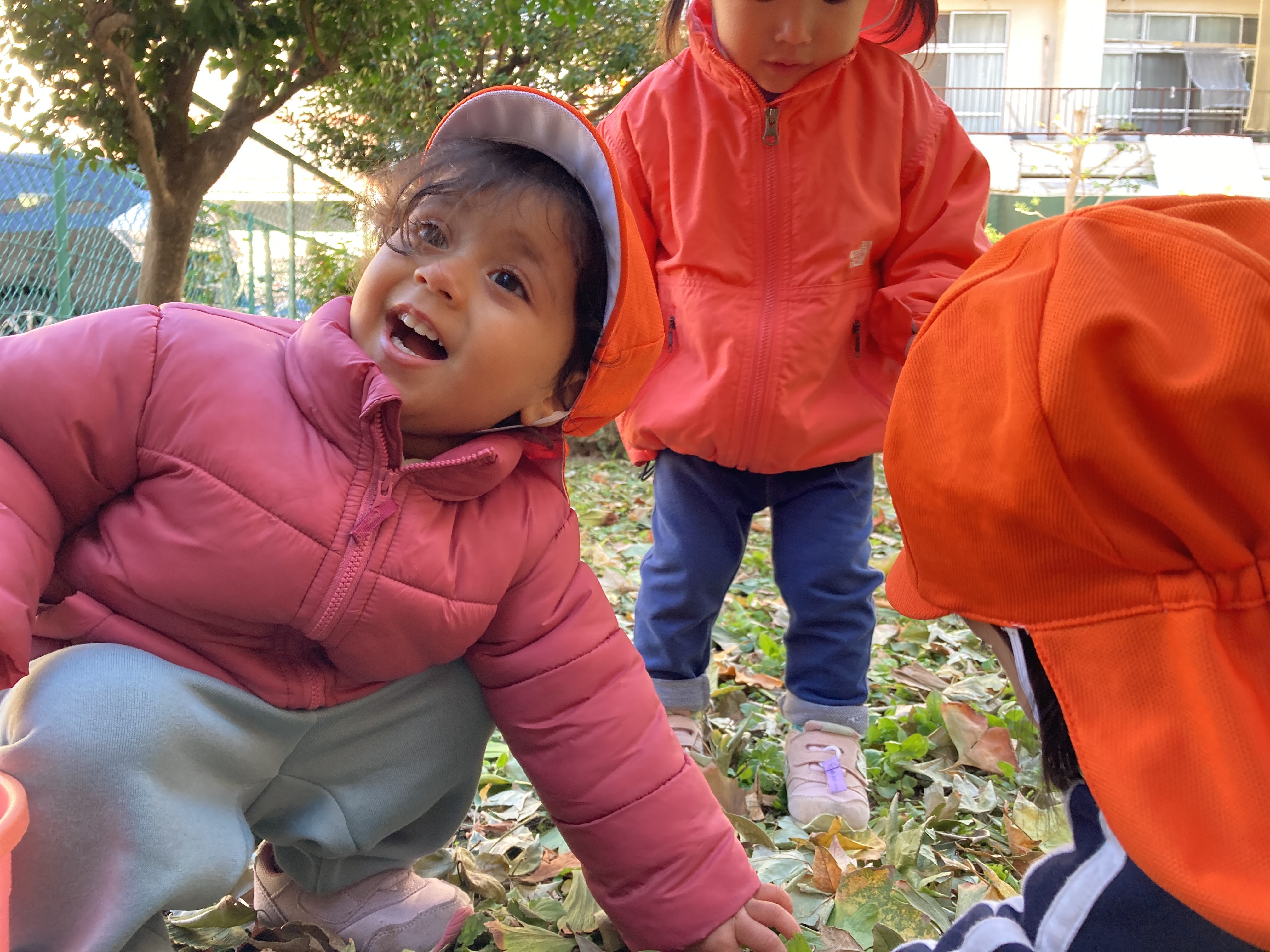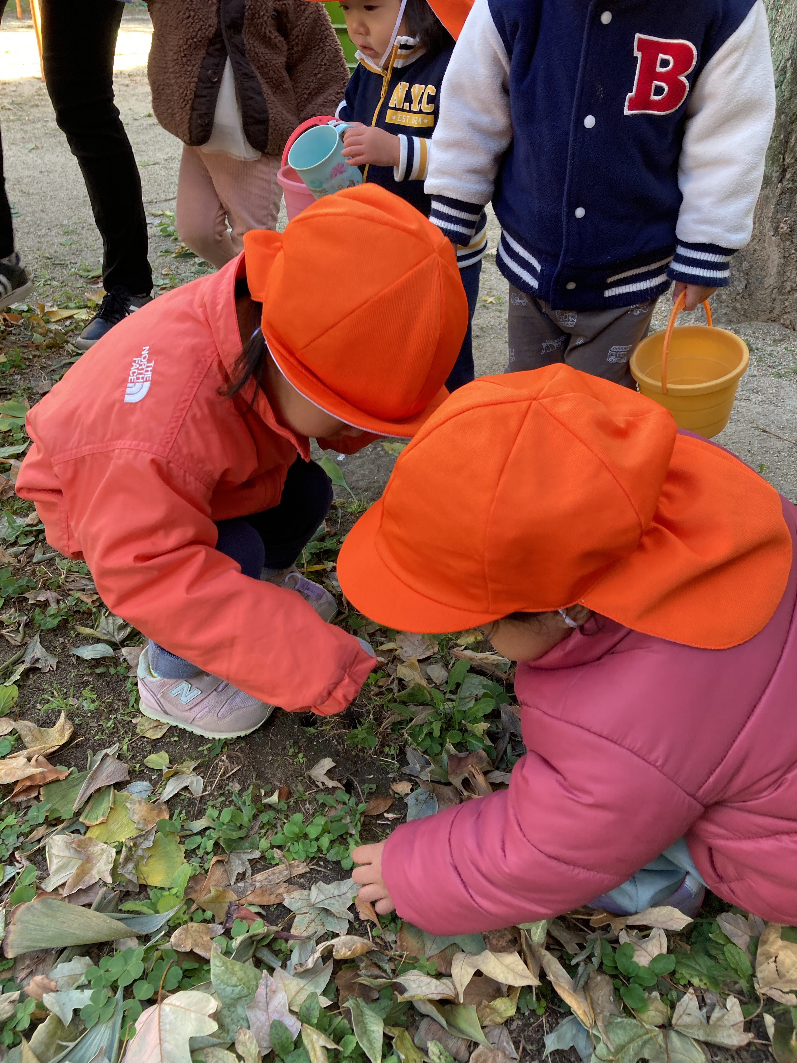 拾ったどんぐりをじーっと観察する子、『どこから落ちてきたのかな?』と上をキョロキョロ見上げる子、夢中になって探す子と反応も様々でした![]()
