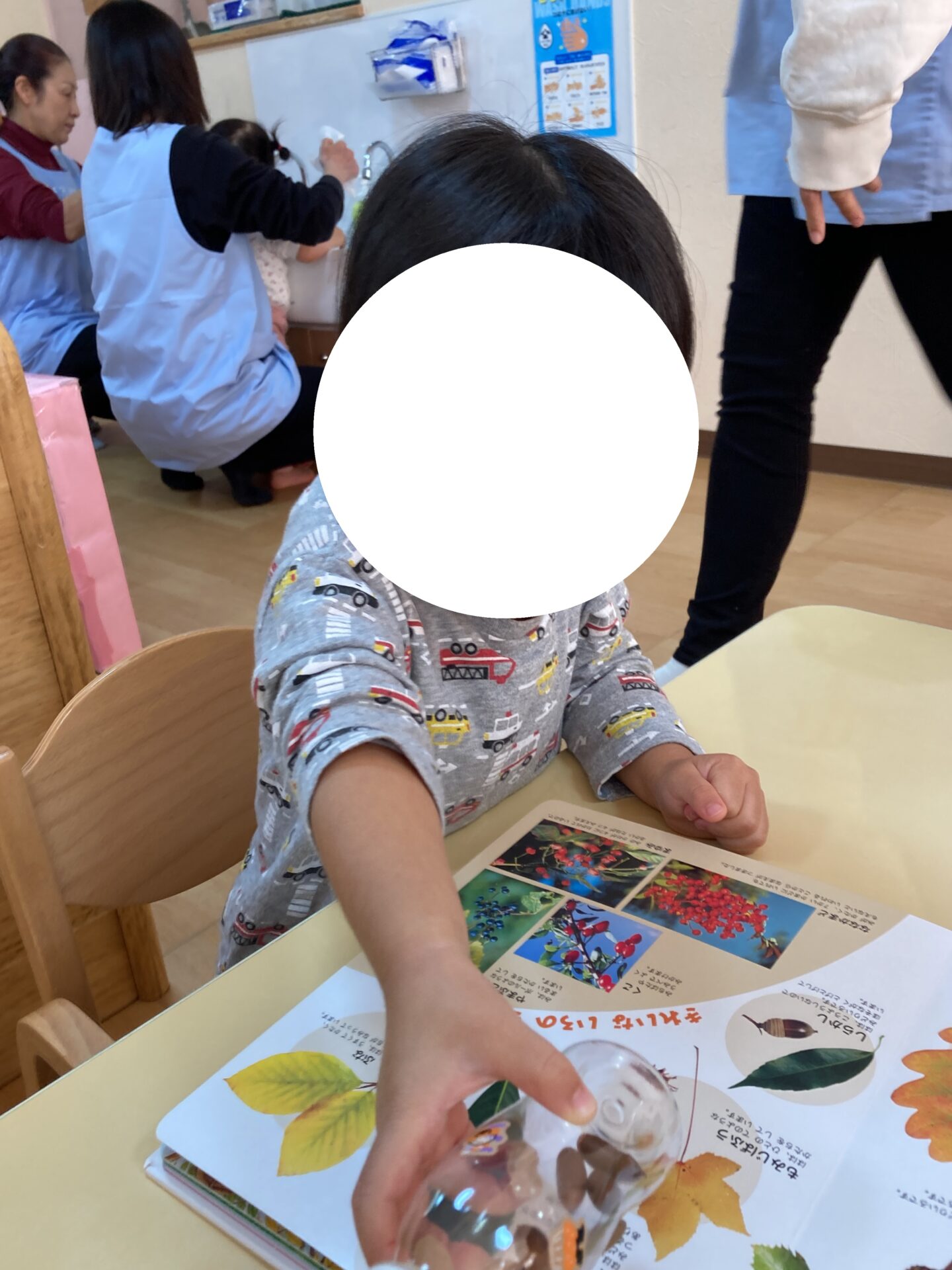 保育者が図鑑を持ってくると、拾ってきたどんぐりと図鑑のどんぐりを照らし合わせて、「一緒のはどれかな?」と探すお友だちもいました🌰