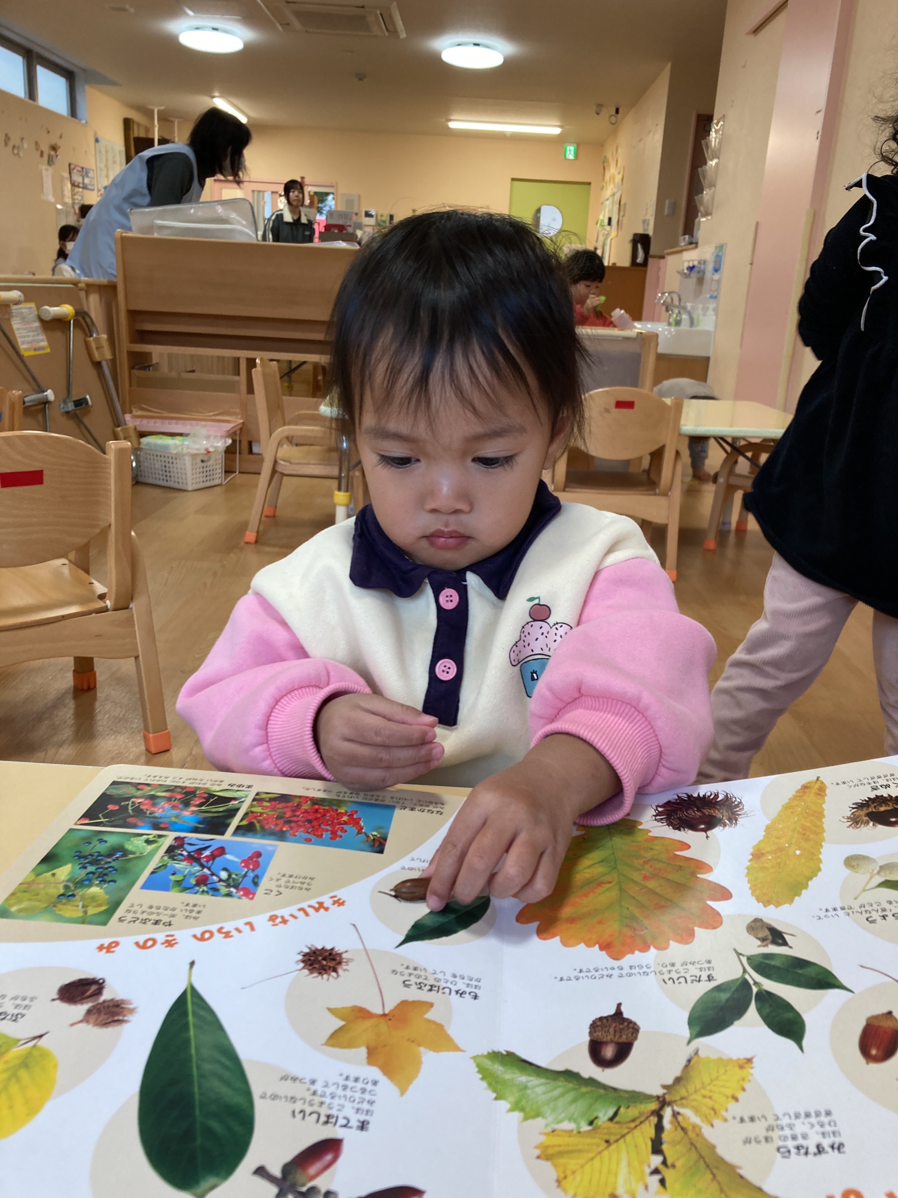 保育者が図鑑を持ってくると、拾ってきたどんぐりと図鑑のどんぐりを照らし合わせて、「一緒のはどれかな?」と探すお友だちもいました🌰
