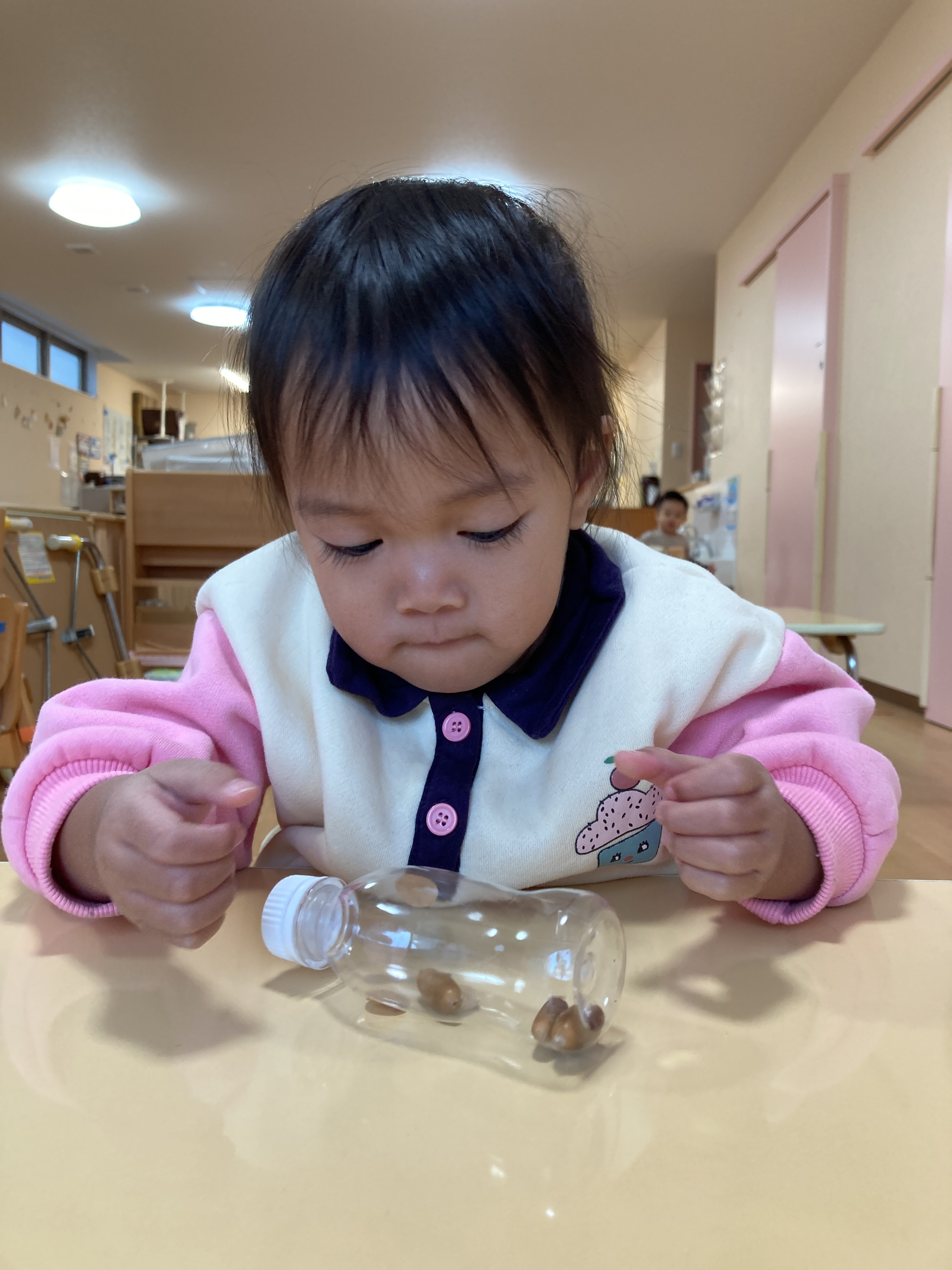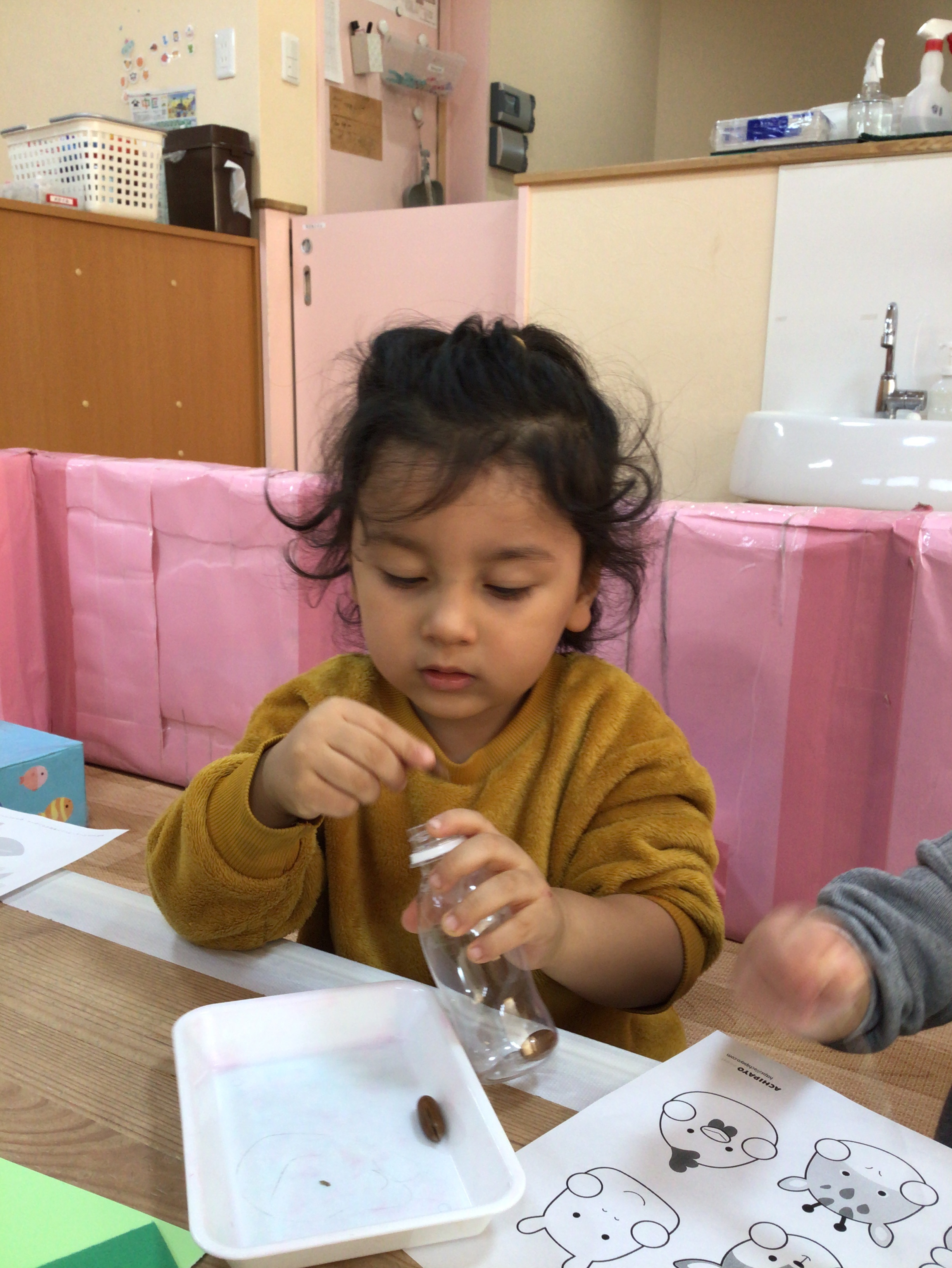 指先を器用に使って、上手にどんぐりを容器に入れることができました!