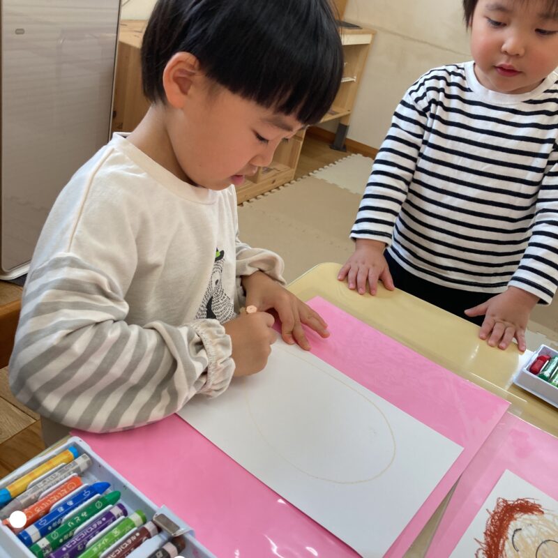 顔は何色かな~!? と問い掛けると「このいろ!」と肌色で描き始めていました![]()