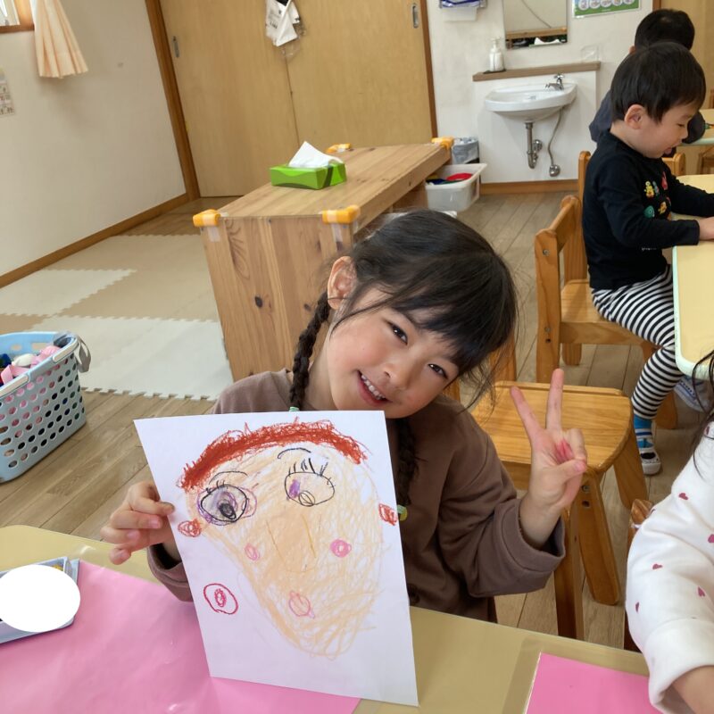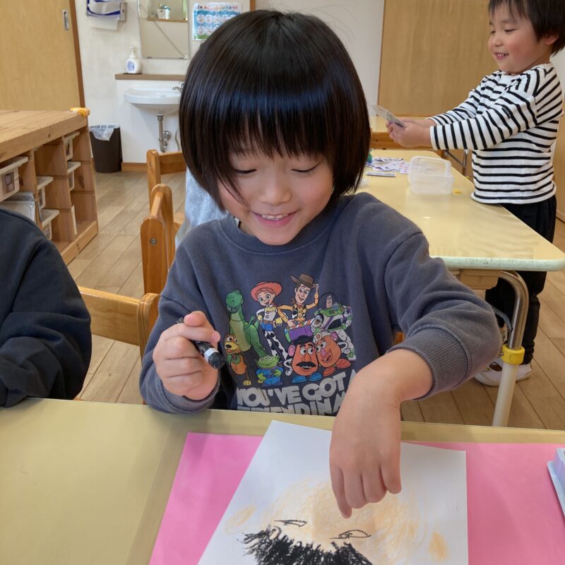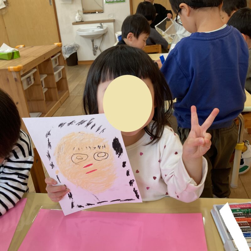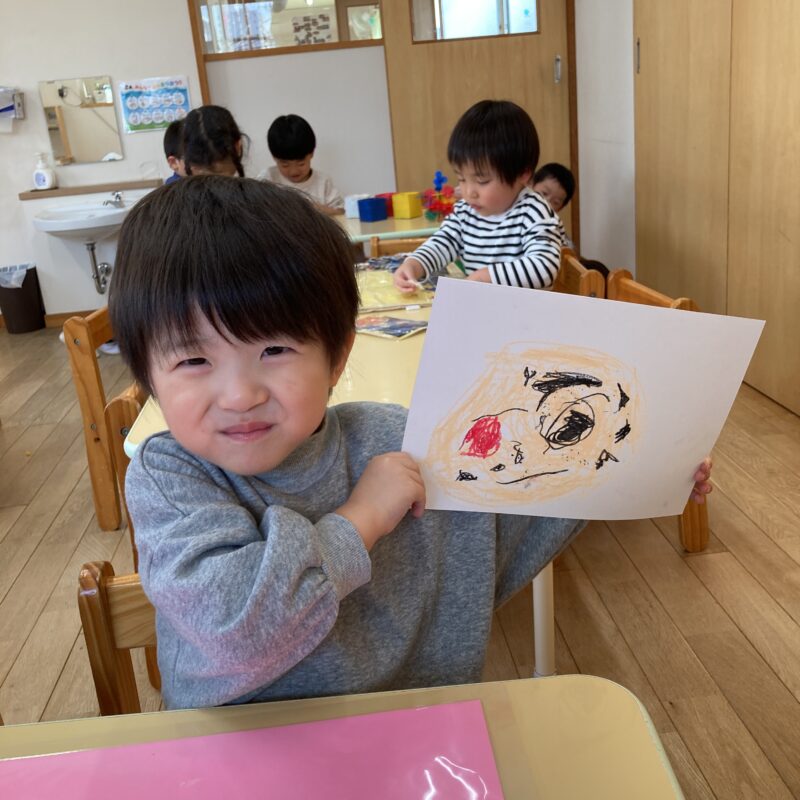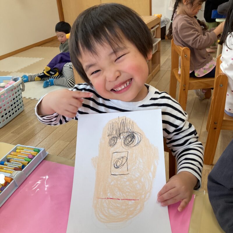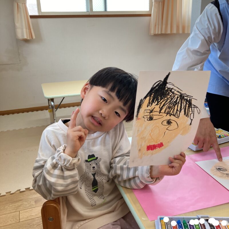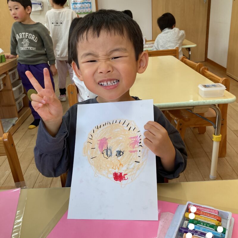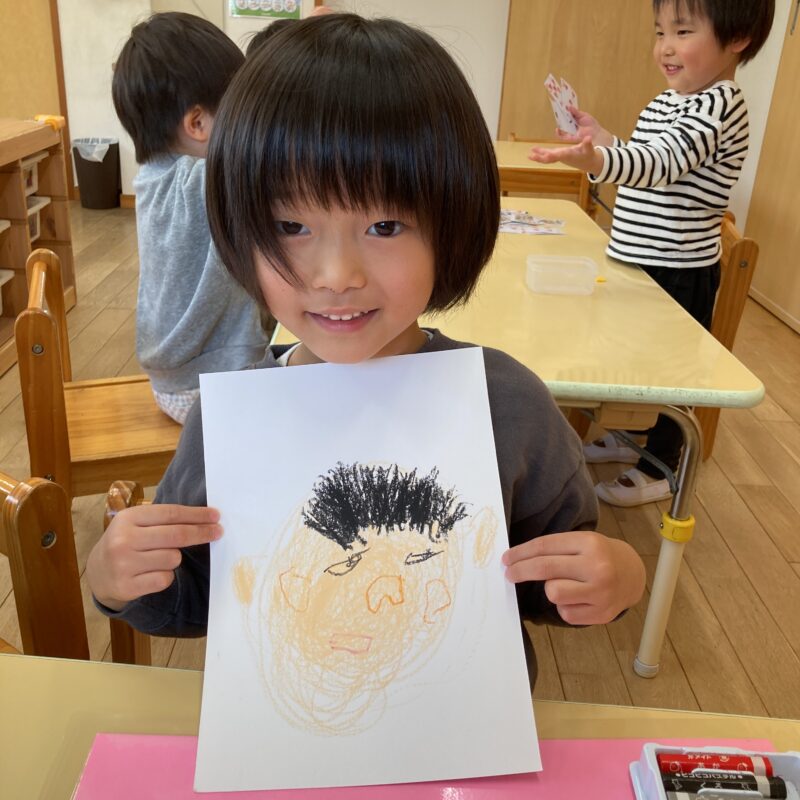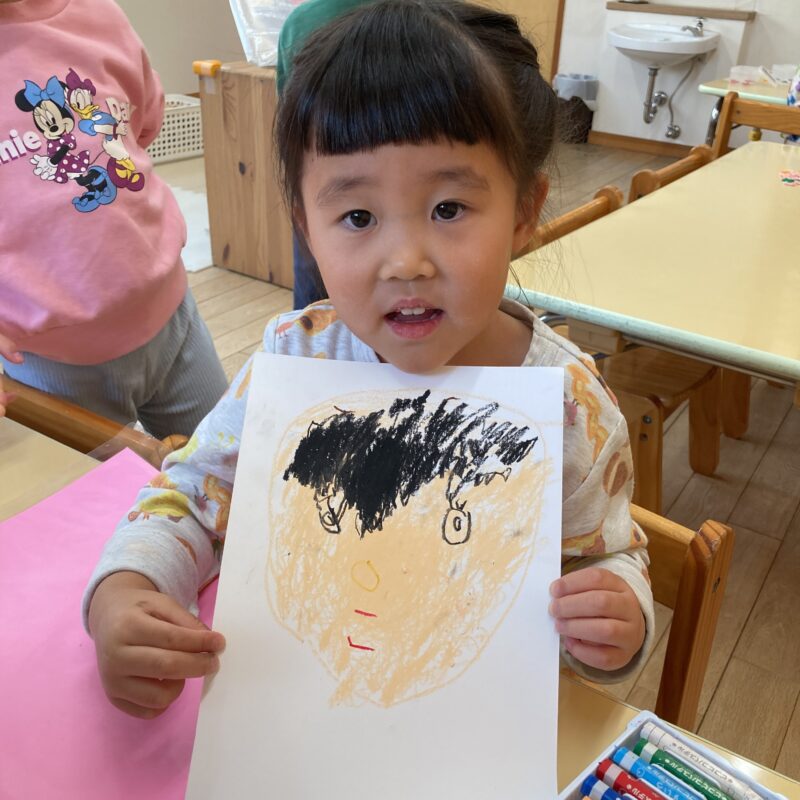 自分の顔ができあがってくると、パーツごとに指を差しながら「目は黒で~」「髪の毛は短い!」「あっ!耳かかなきゃ!」と楽しそうにお話しながら描いていました![]()