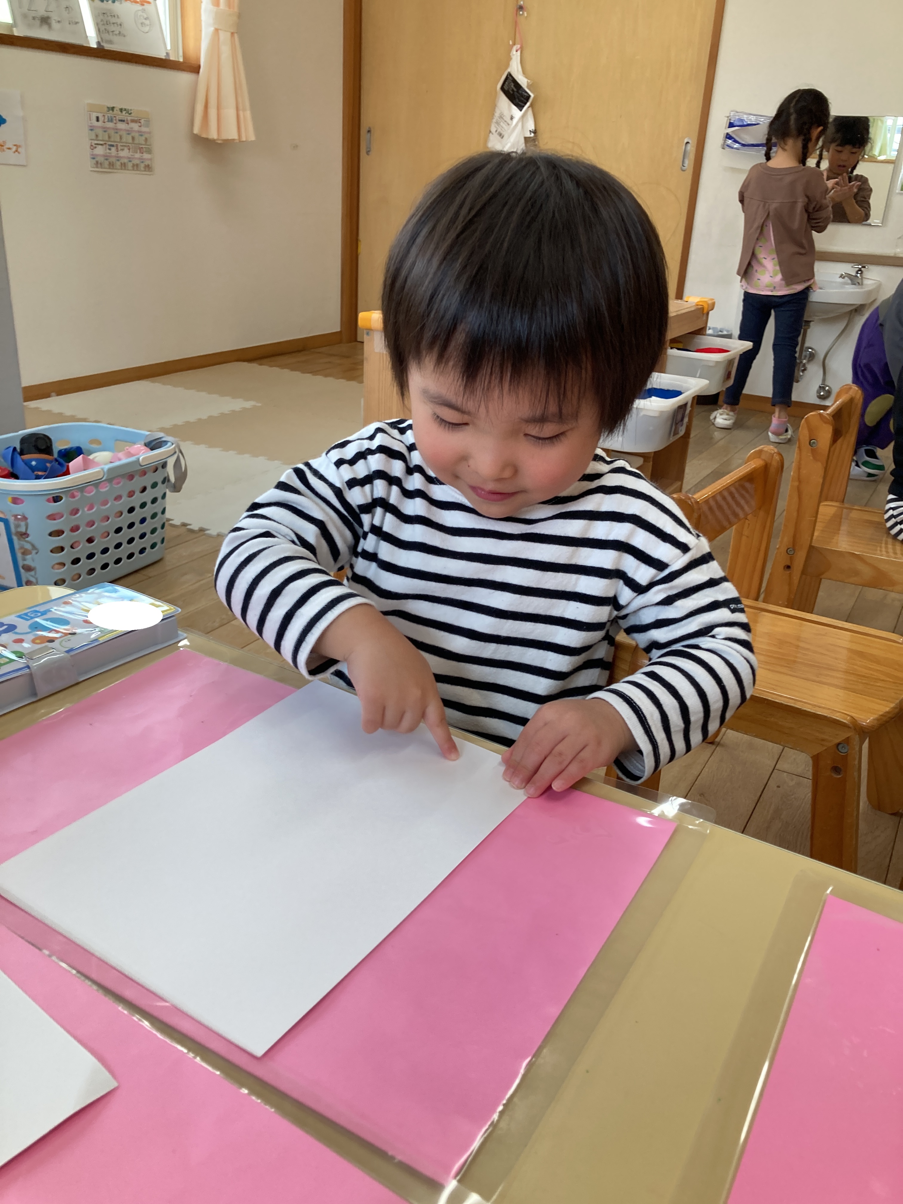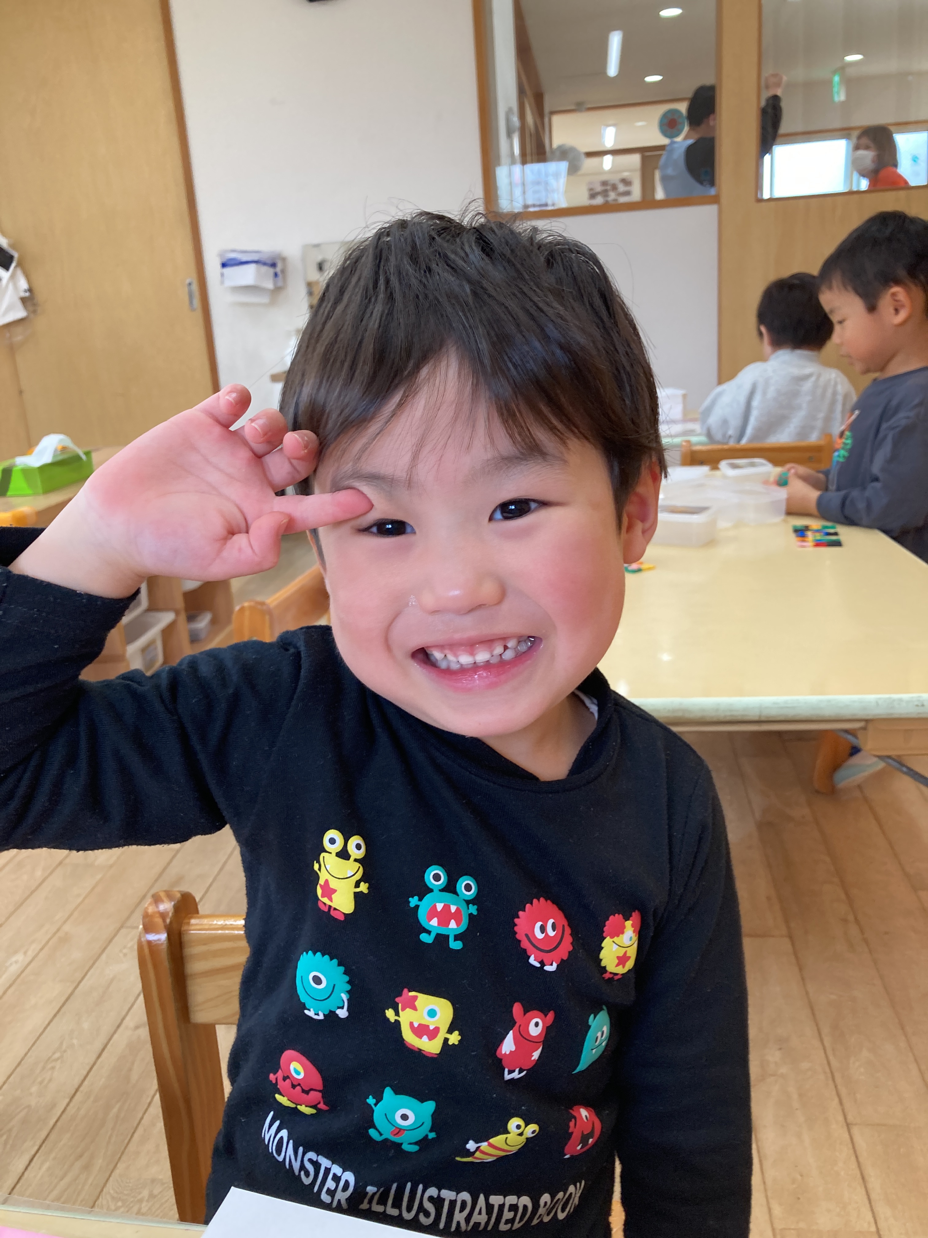 「〇〇くん、ちゃんは髪の毛黒だから~」と実際に髪の毛を見て確認をしたり、口や鼻を触りながらどんな形かを確認している子もいました![]()
