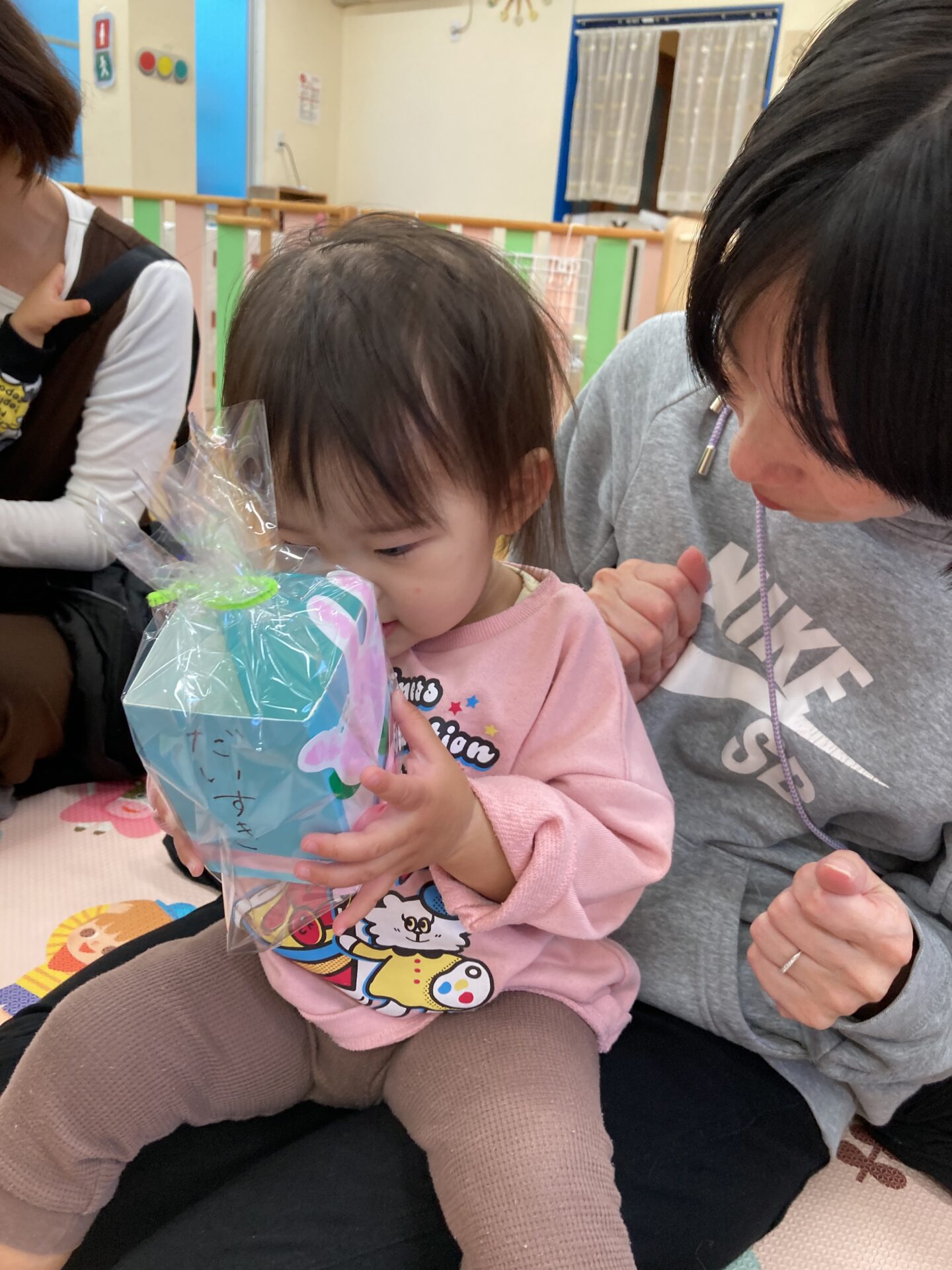 お母さんのお膝に座って「バスごっこ」「きゅうりができた」「もみもみマッサージ」をしましたよ![]()