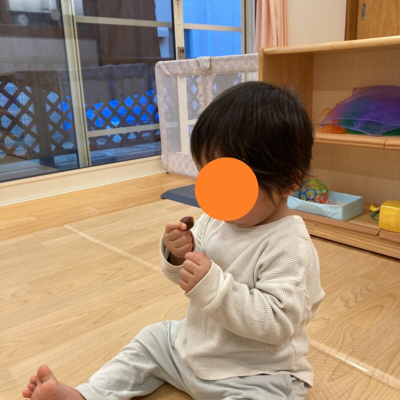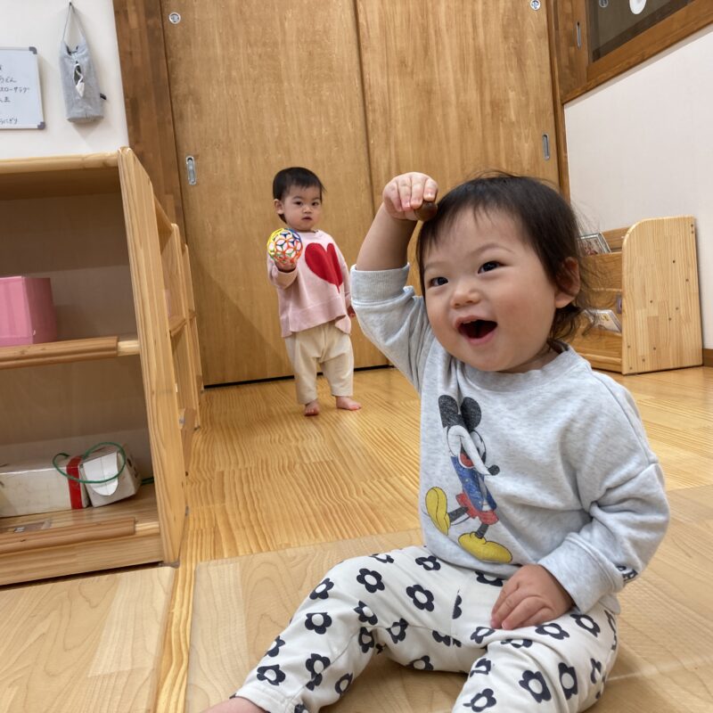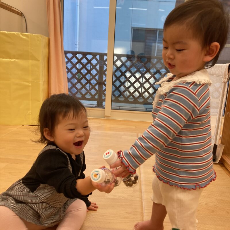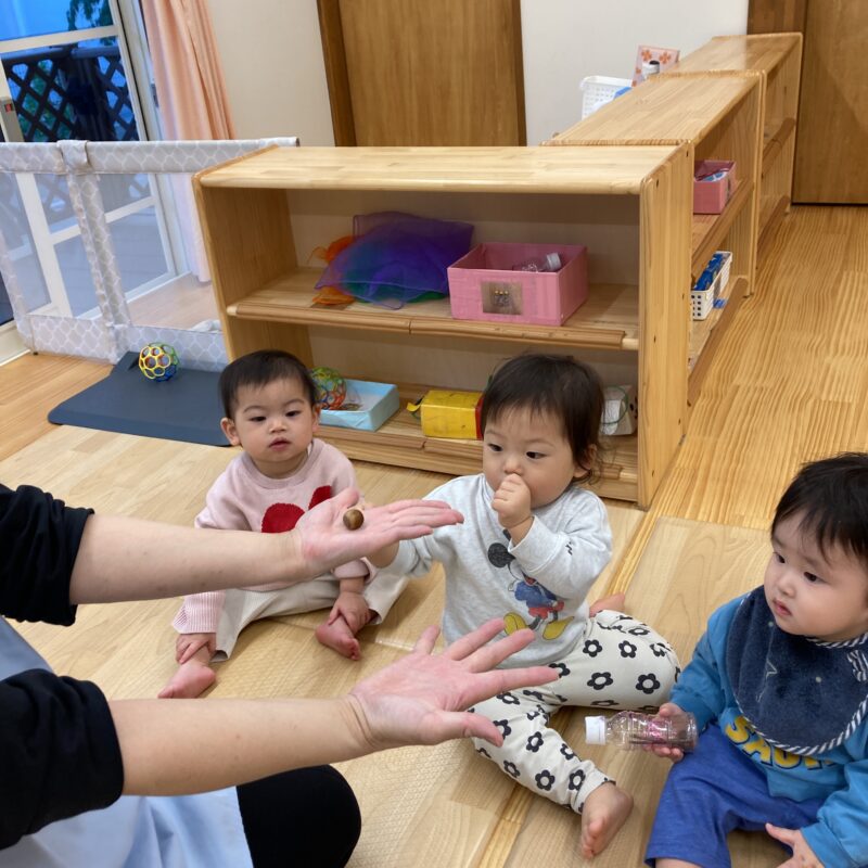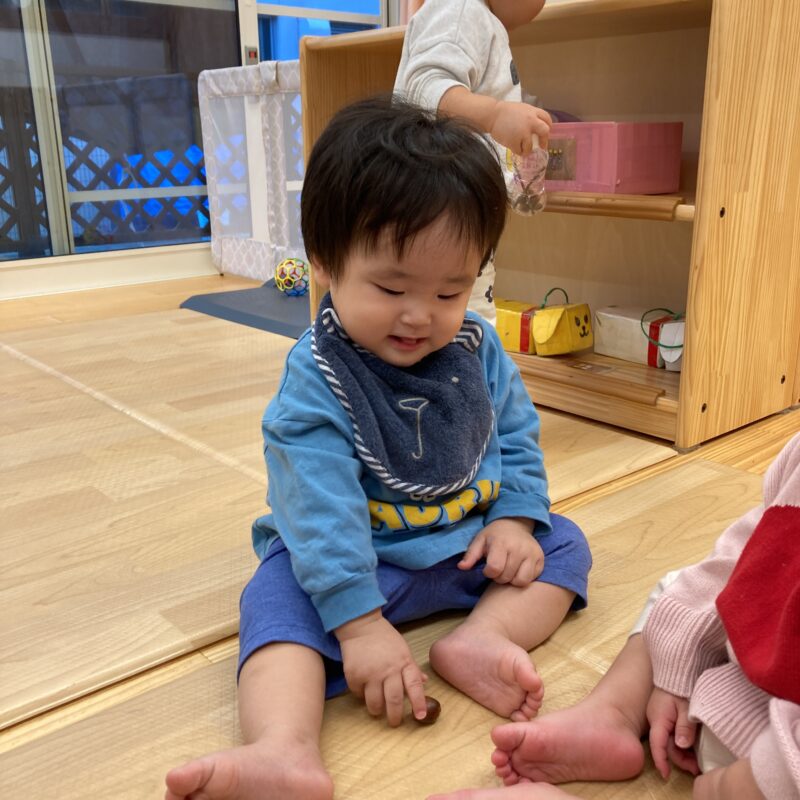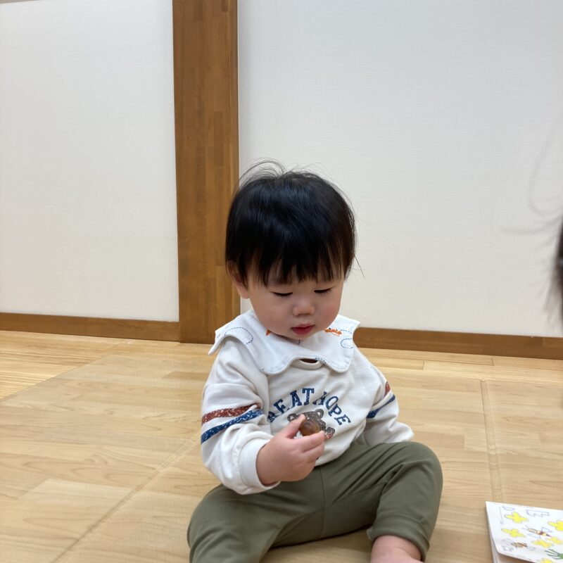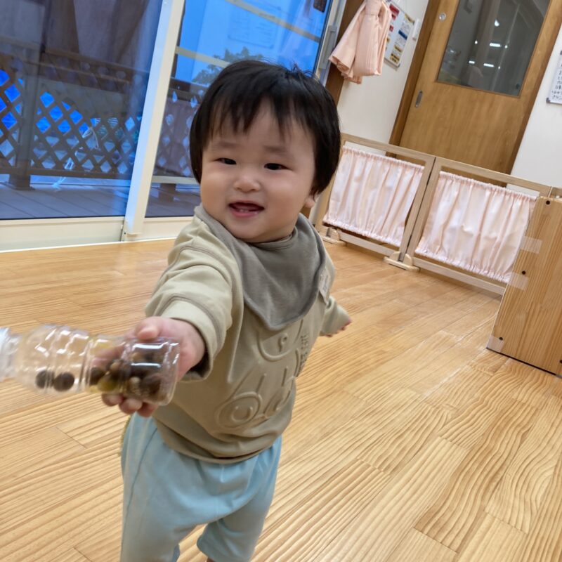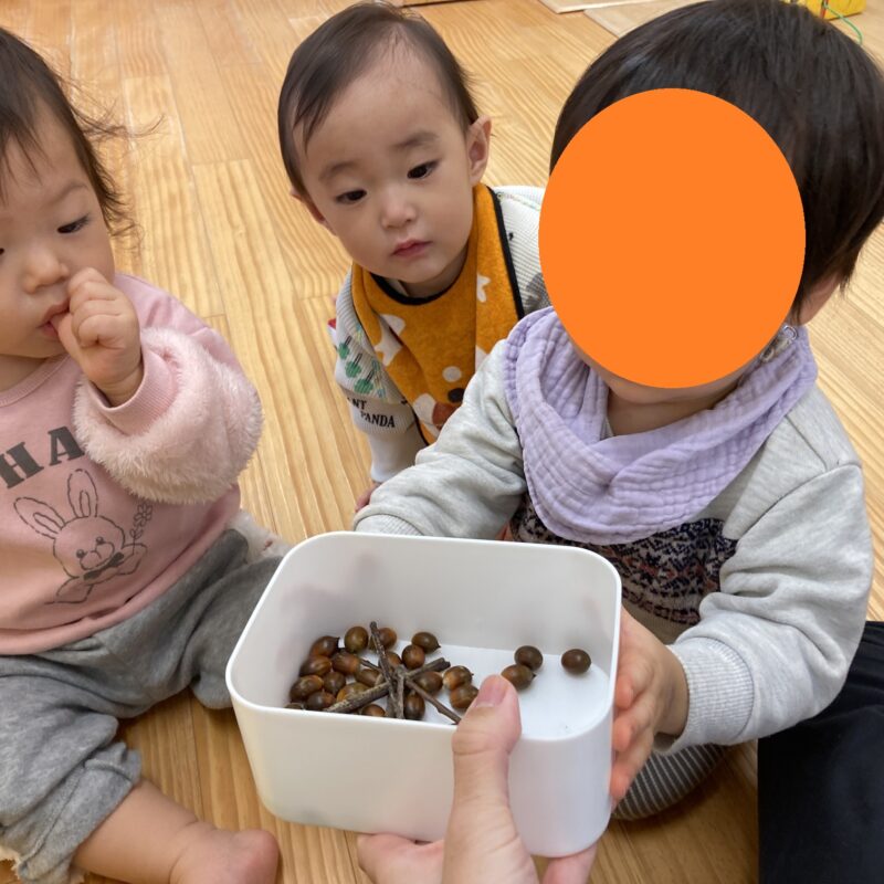 どんぐりを手に持って、最後にどちらの手に持っているかを当てる遊びもしていますよ![]()