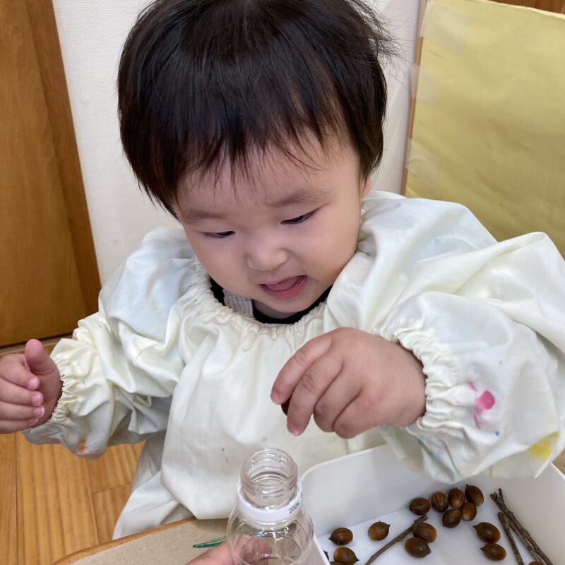 自然物に興味を示す姿や室内遊びで音楽遊びが大好きな子どもたちの姿から、秋の自然物どんぐりを使ってマラカス作りをしました![]()