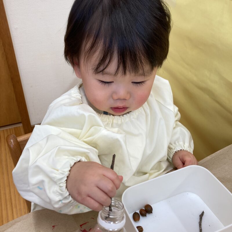 どんぐりの帽子に気づいたり、色の違いを発見して観察する子もいましたよ🙂