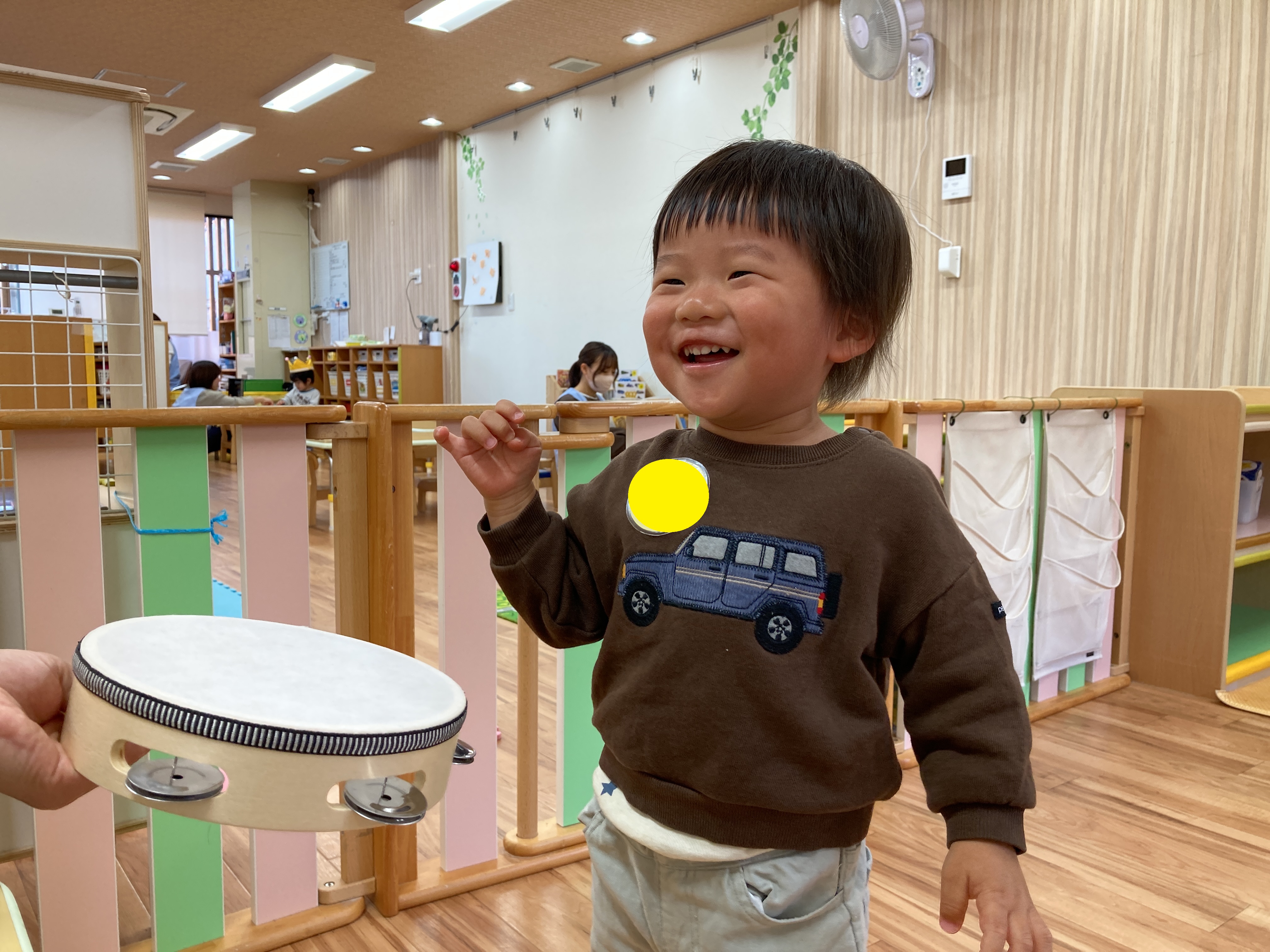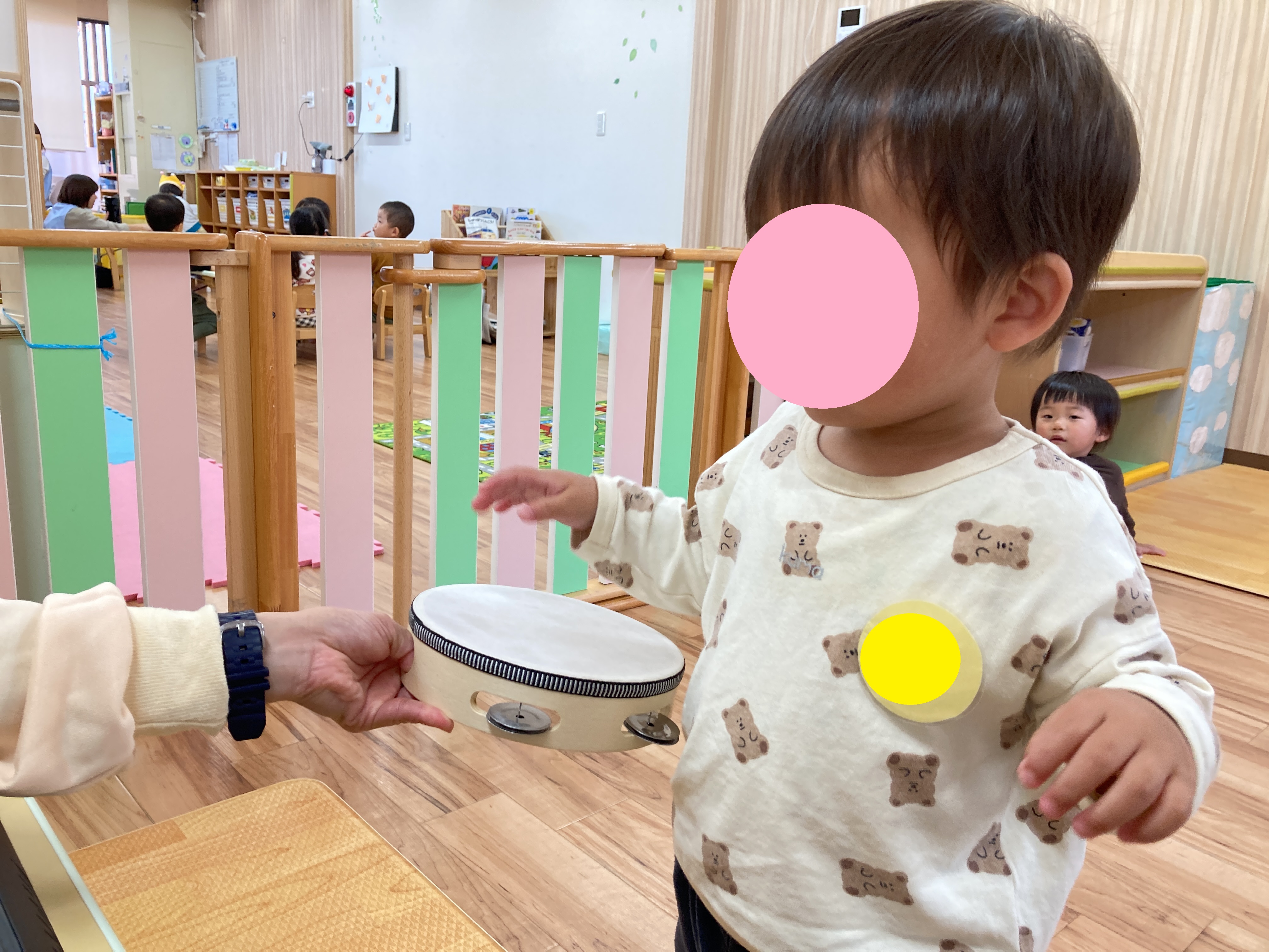 まず始めは挨拶から!一人ずつ名前を呼ばれると、タンバリンを叩いて返事をします![]()