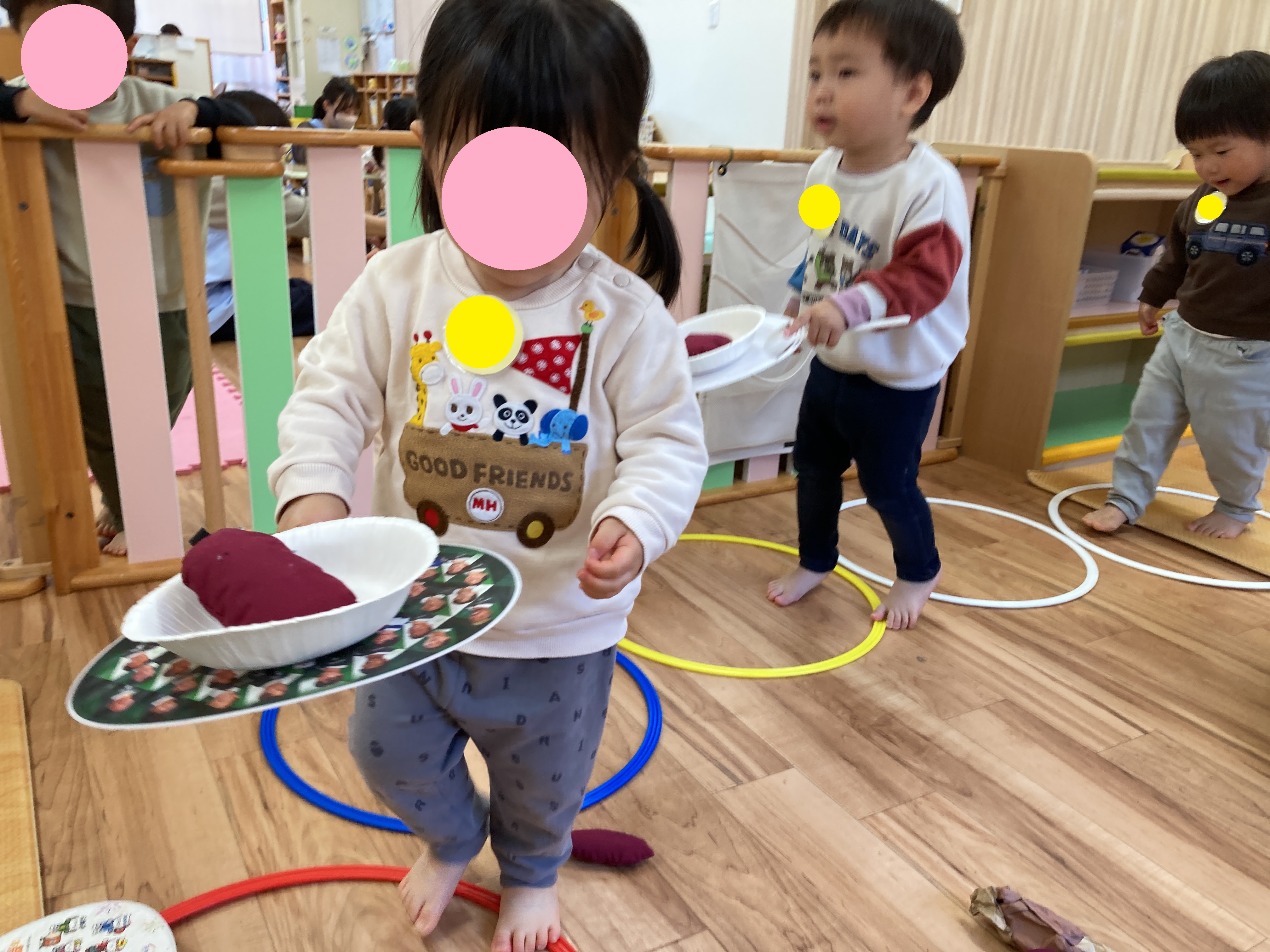 ピアノのリズムに合わせてみんなで運びます。落とさないようにそーっとそーっと、、