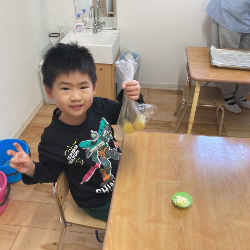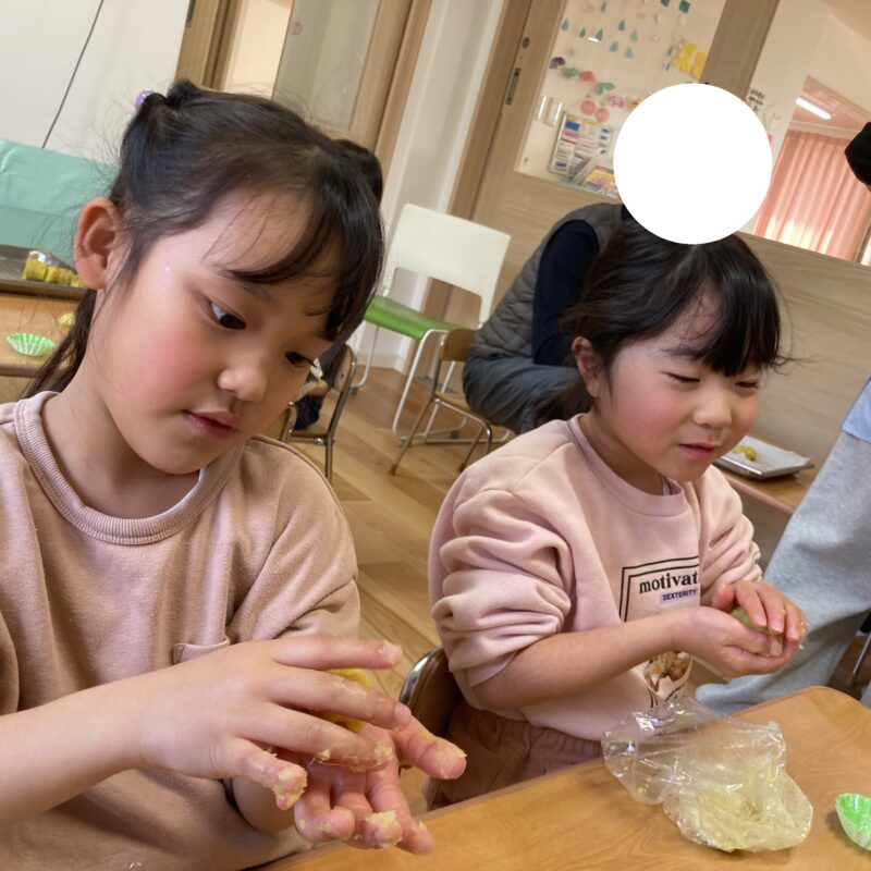 材料がしっかりと混ざるように揉み、「やわらかいね」「あまいにおいがするー!」と感触や匂いを楽しんでいました![]()