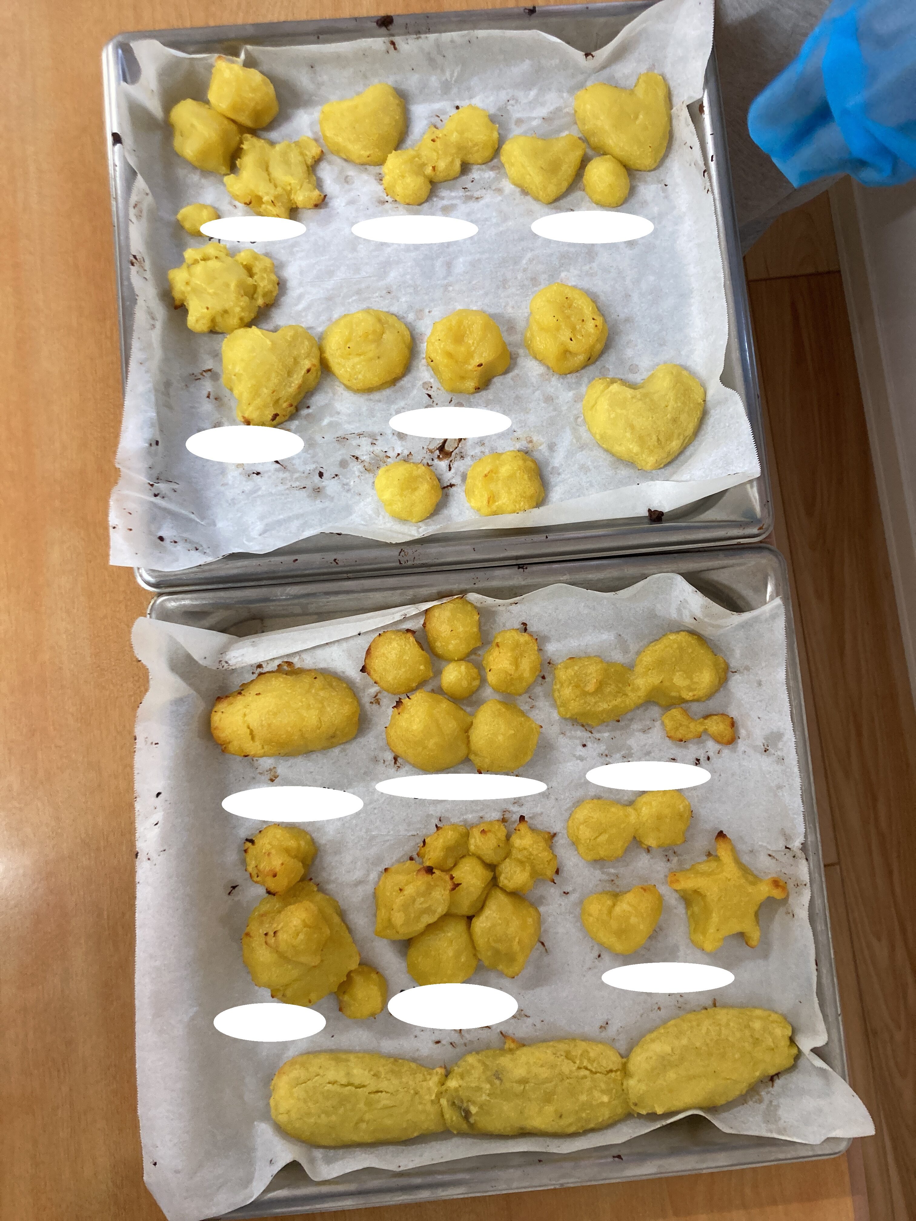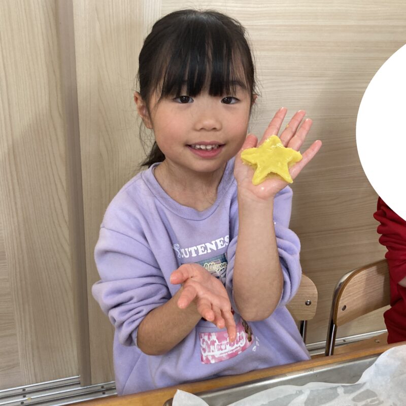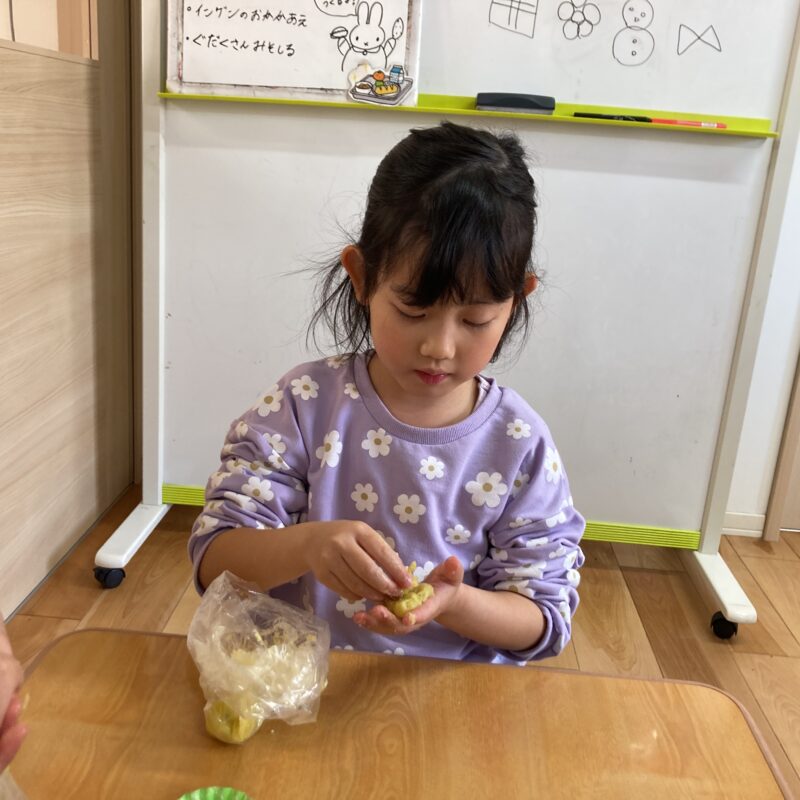 揉み込んださつまいもを袋から出してハート、星、お花、雪だるまなど一人ひとり違う形を作ったり、お友だちのをみて「○○ちゃんのすごい!」