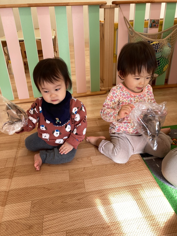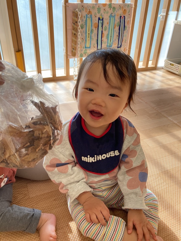 公園にたくさん落ちていた葉っぱを袋に入れて、鳴らしていました🎵🎶