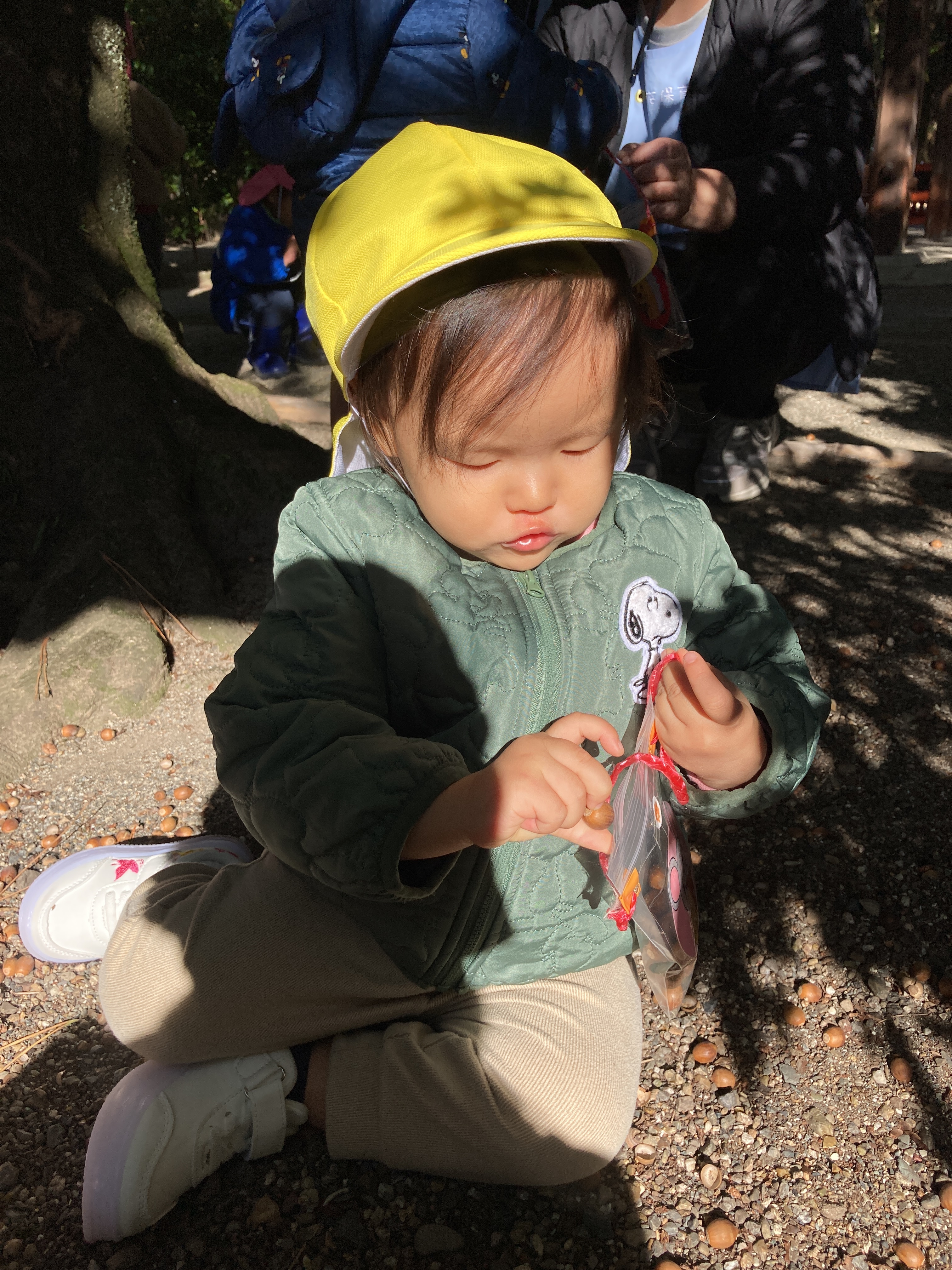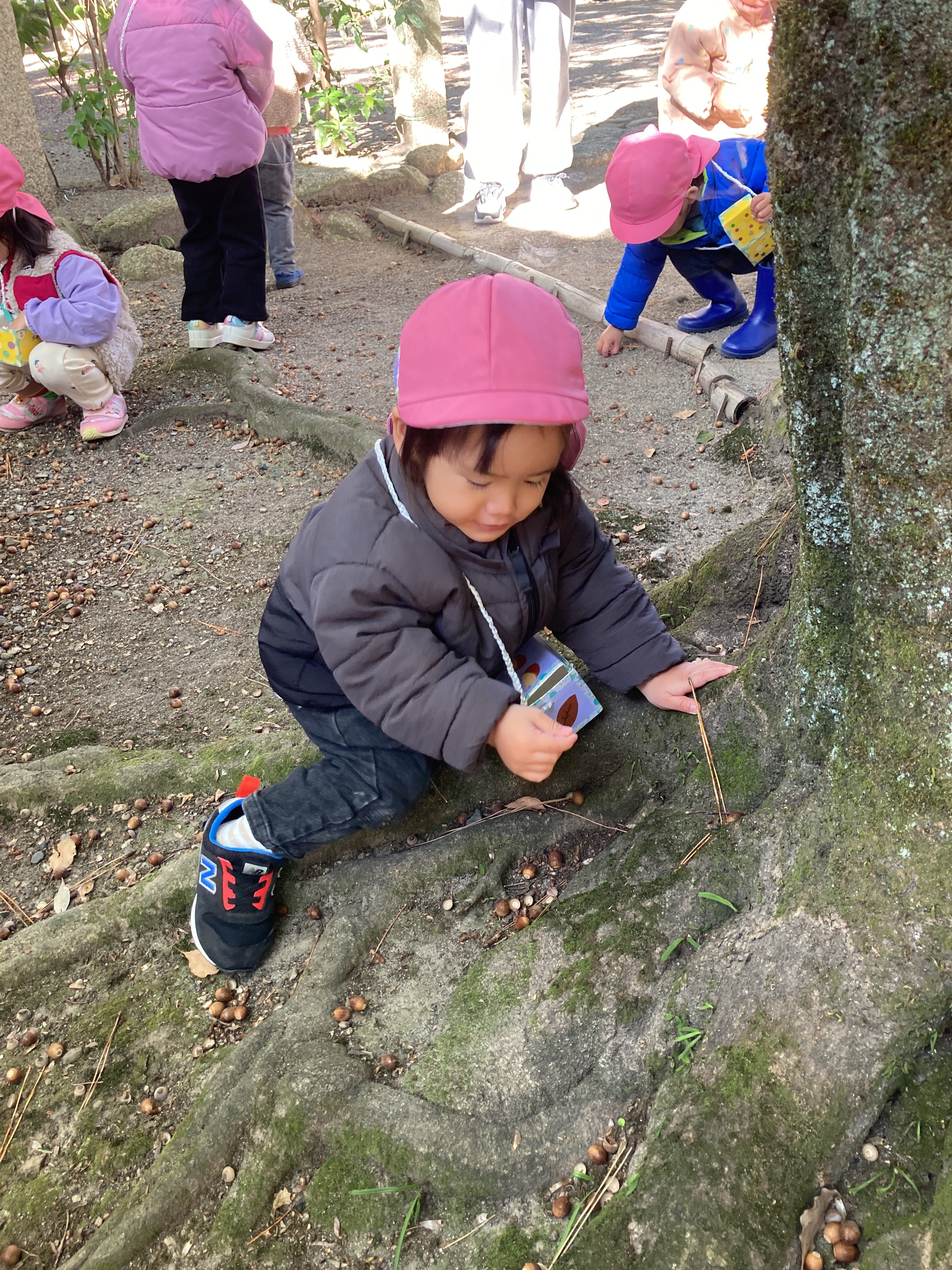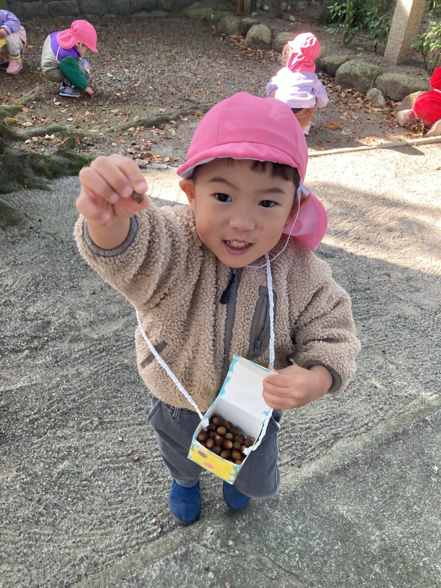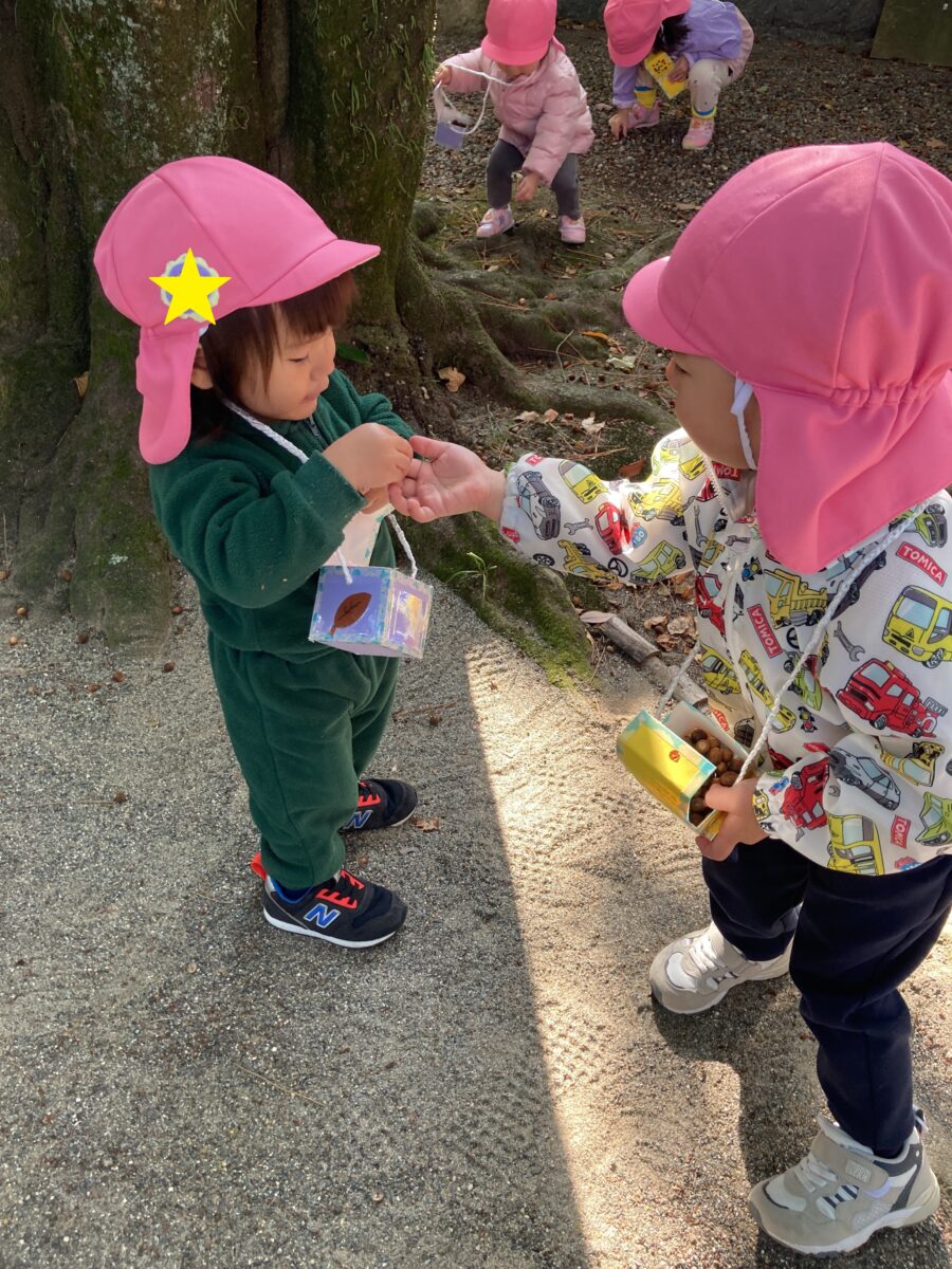 拾ったどんぐりを見せあいっこしたり、お友だちにどうぞと渡す姿もありました!
