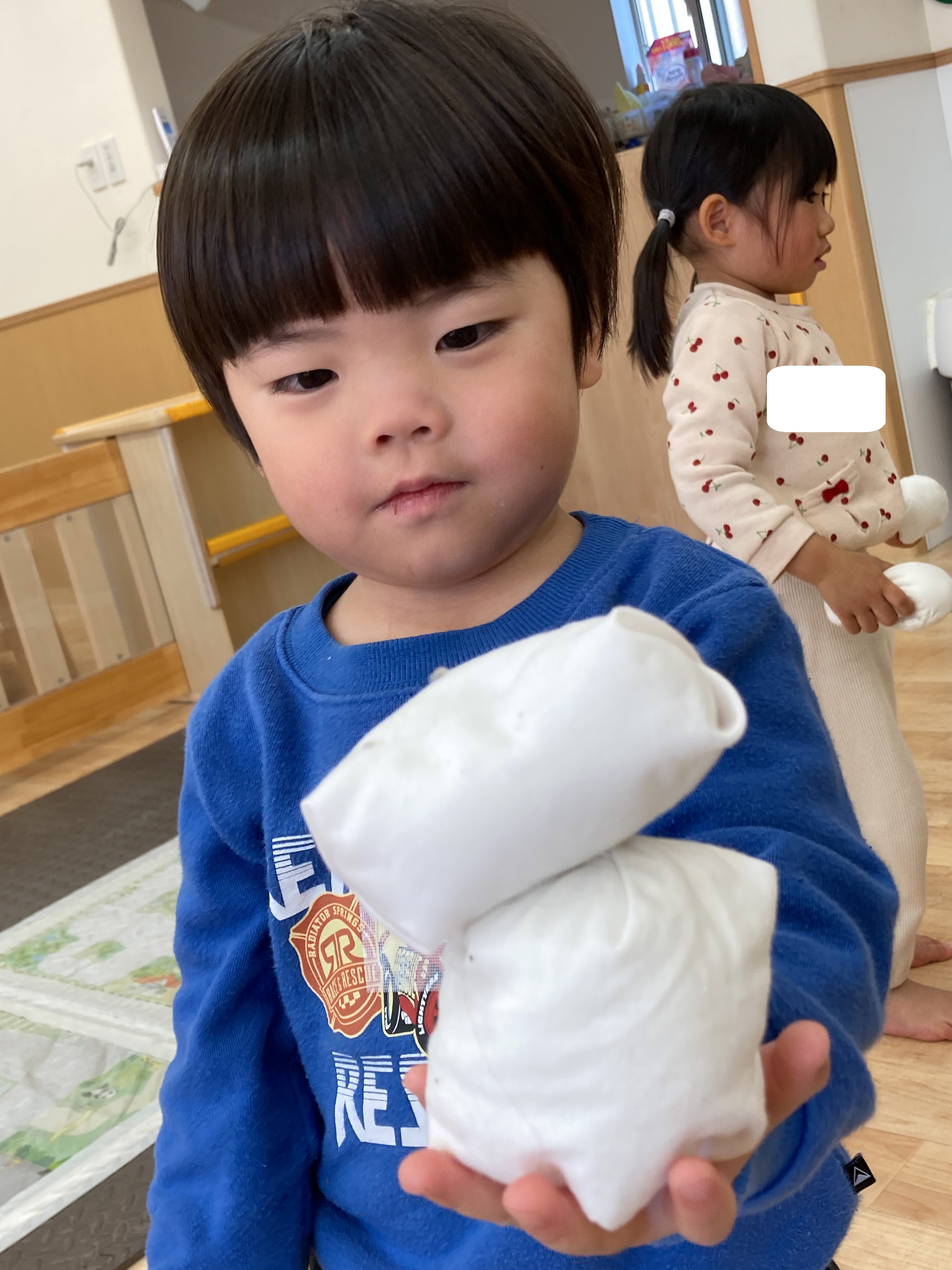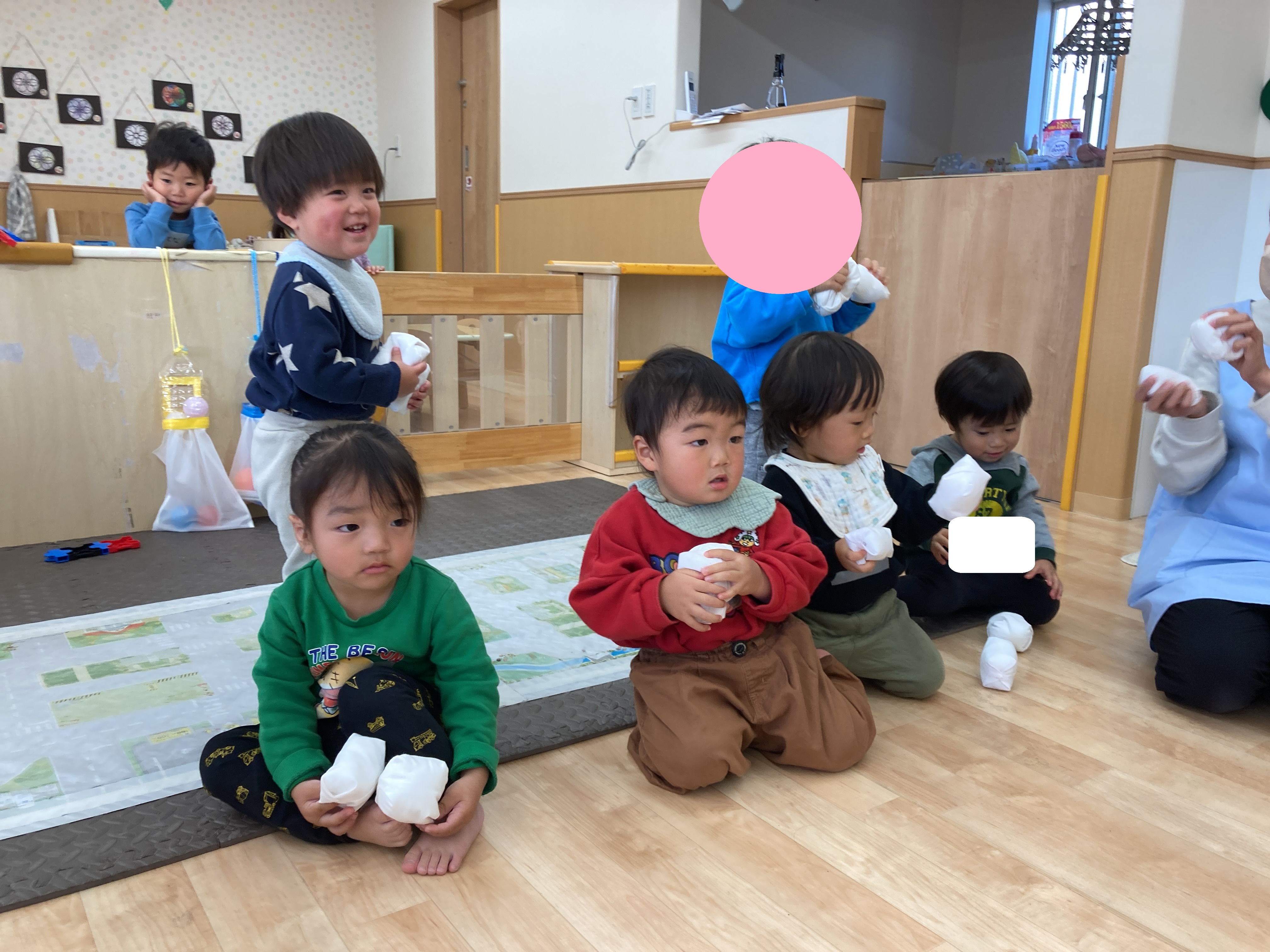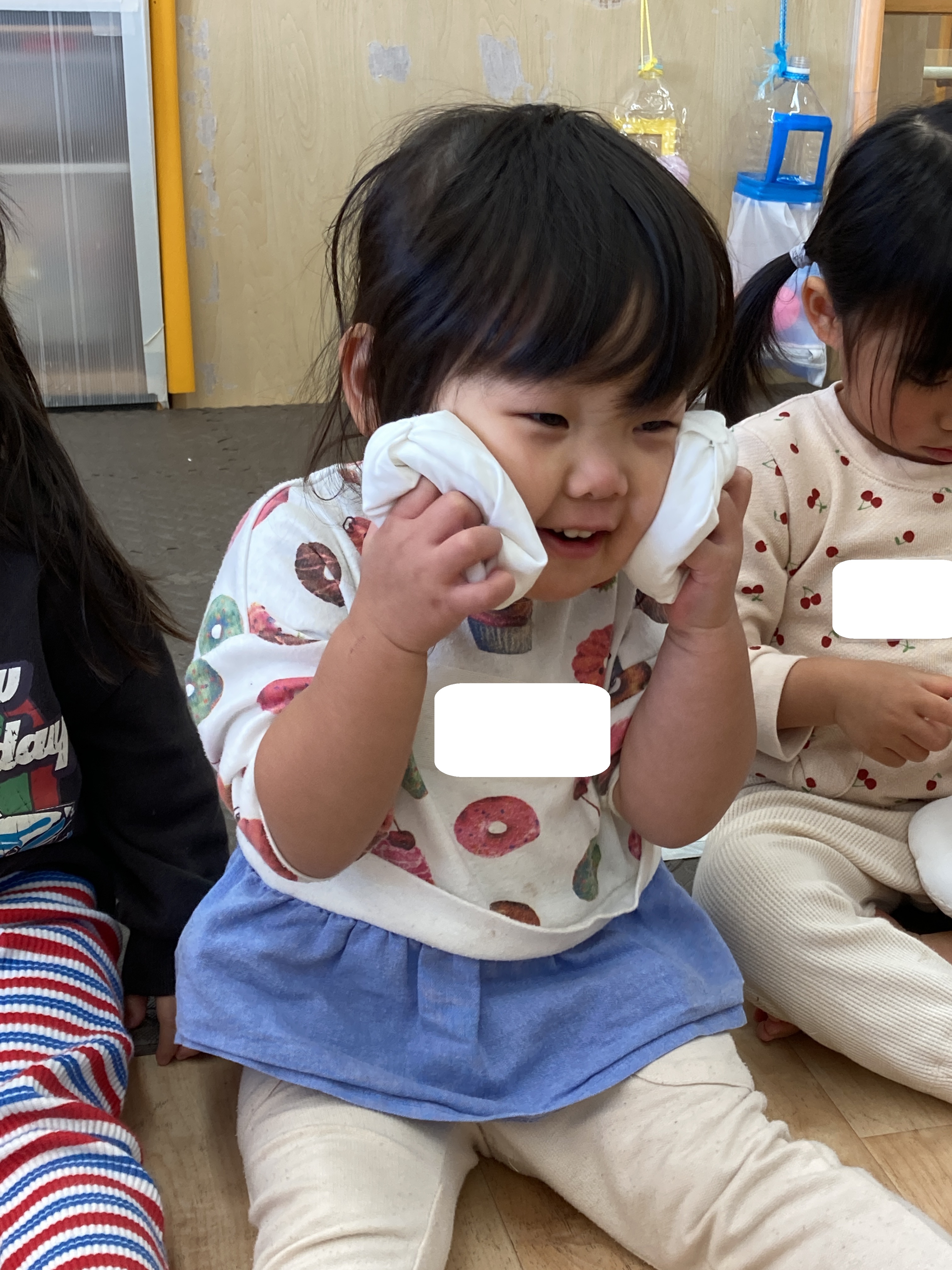 こちらのお友だちはお手玉を頬に当てて、感触を楽しむ姿が見られました![]()