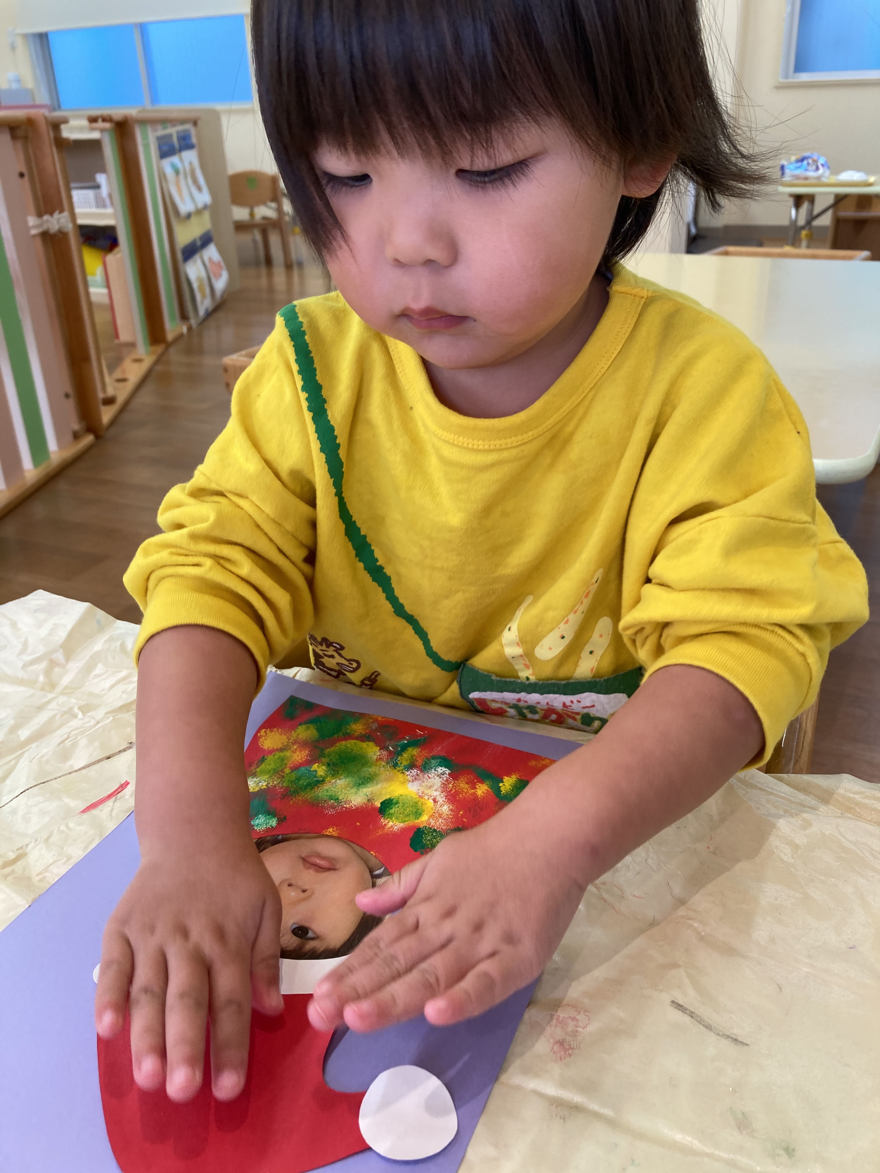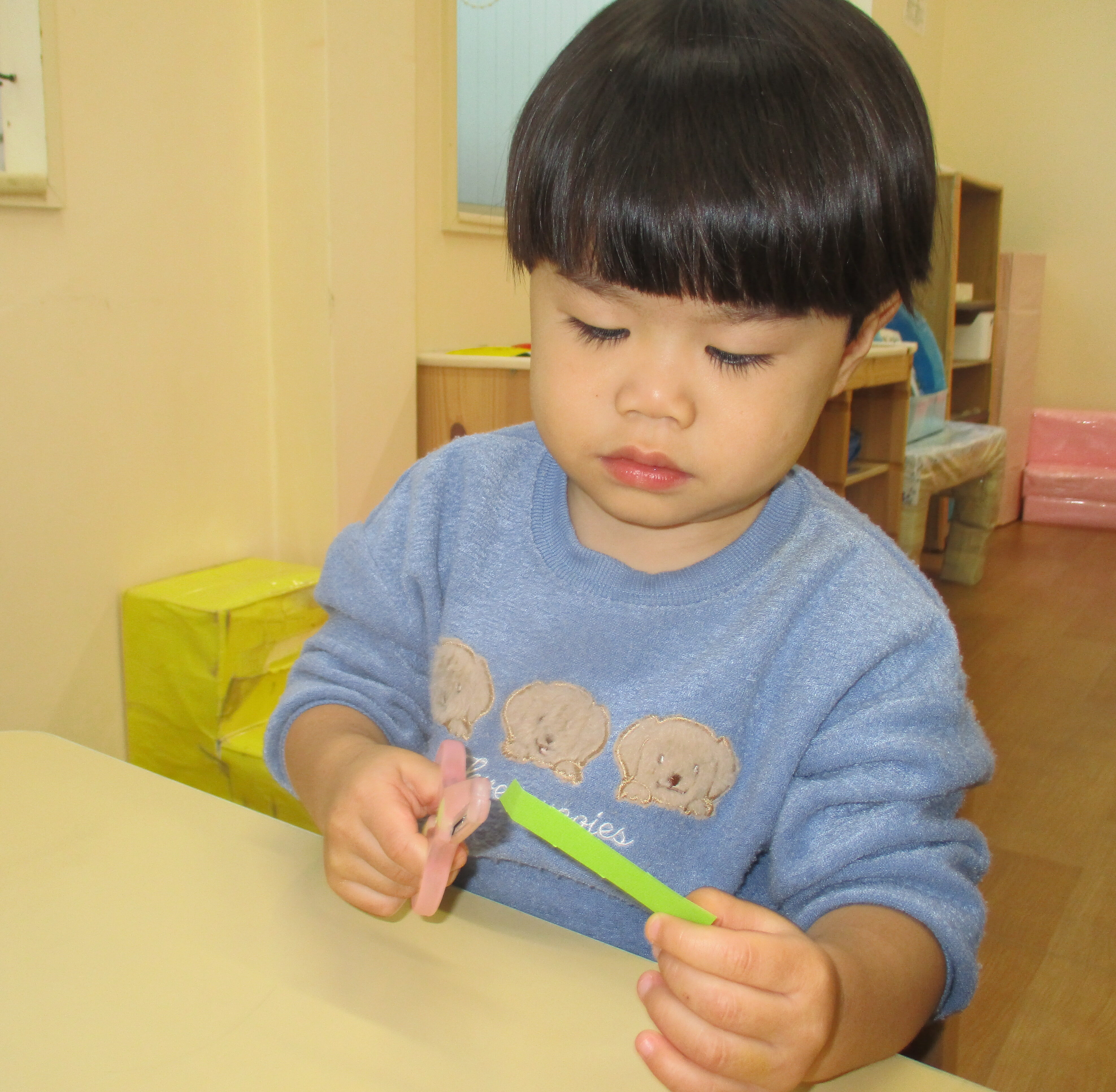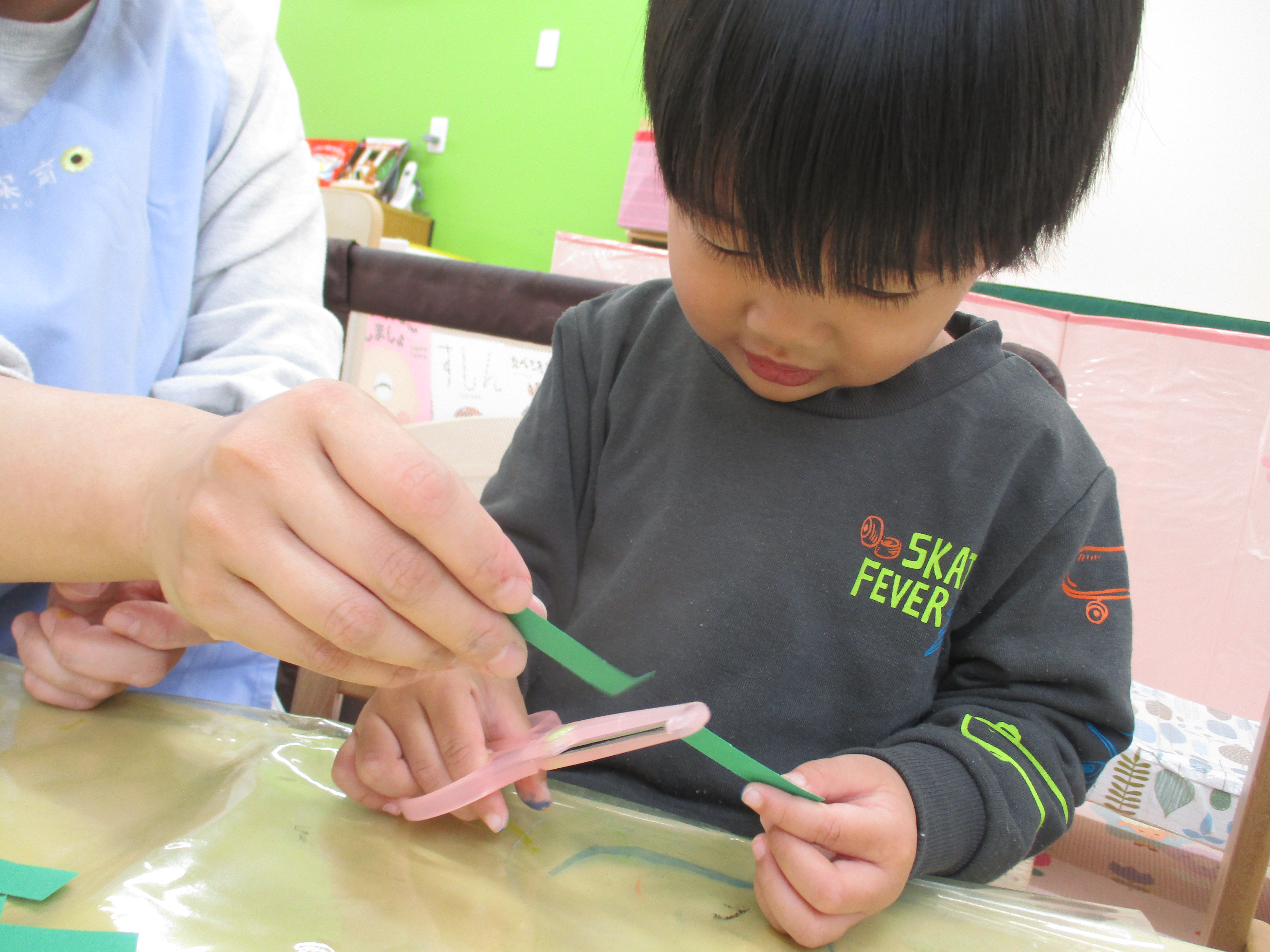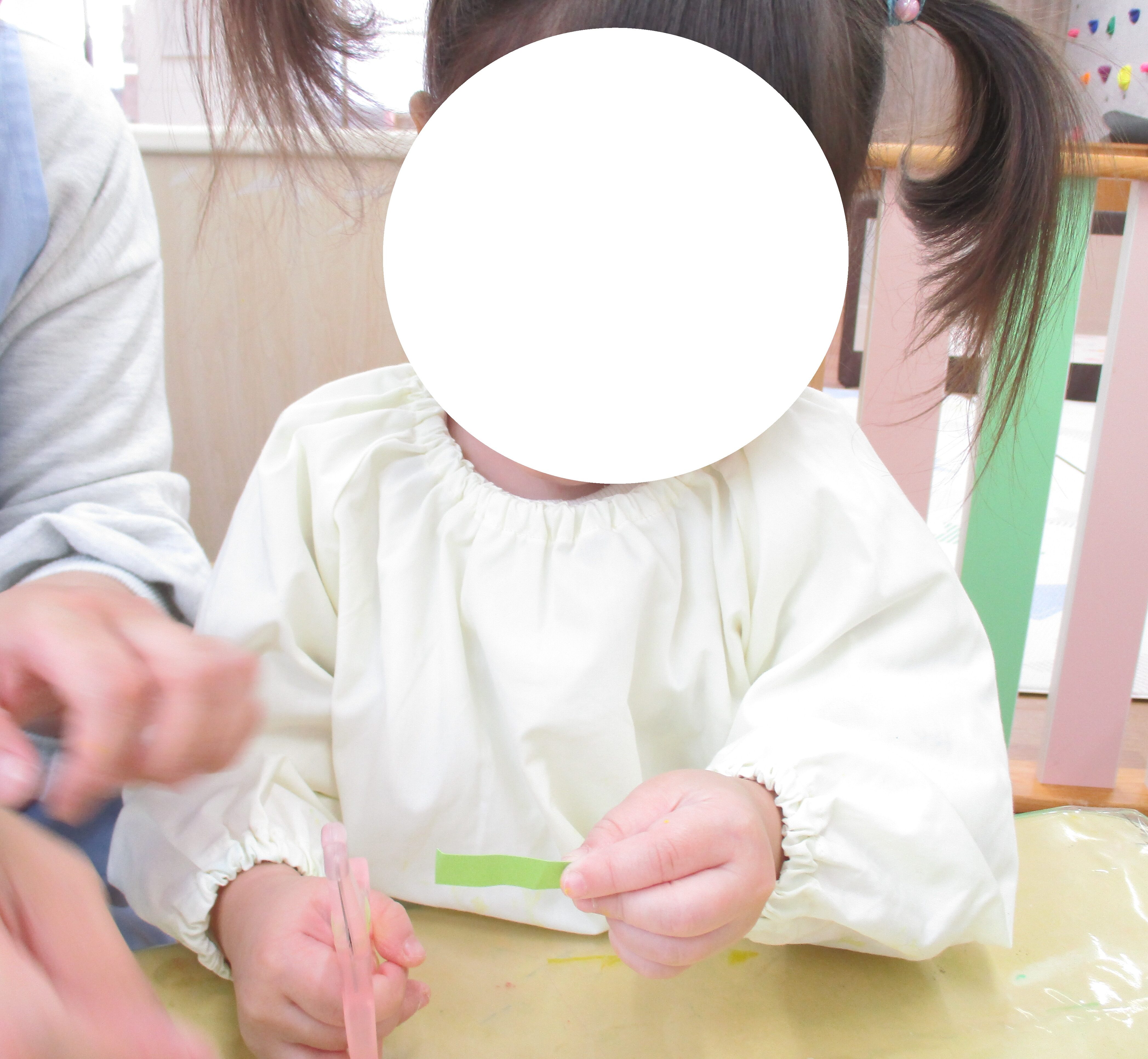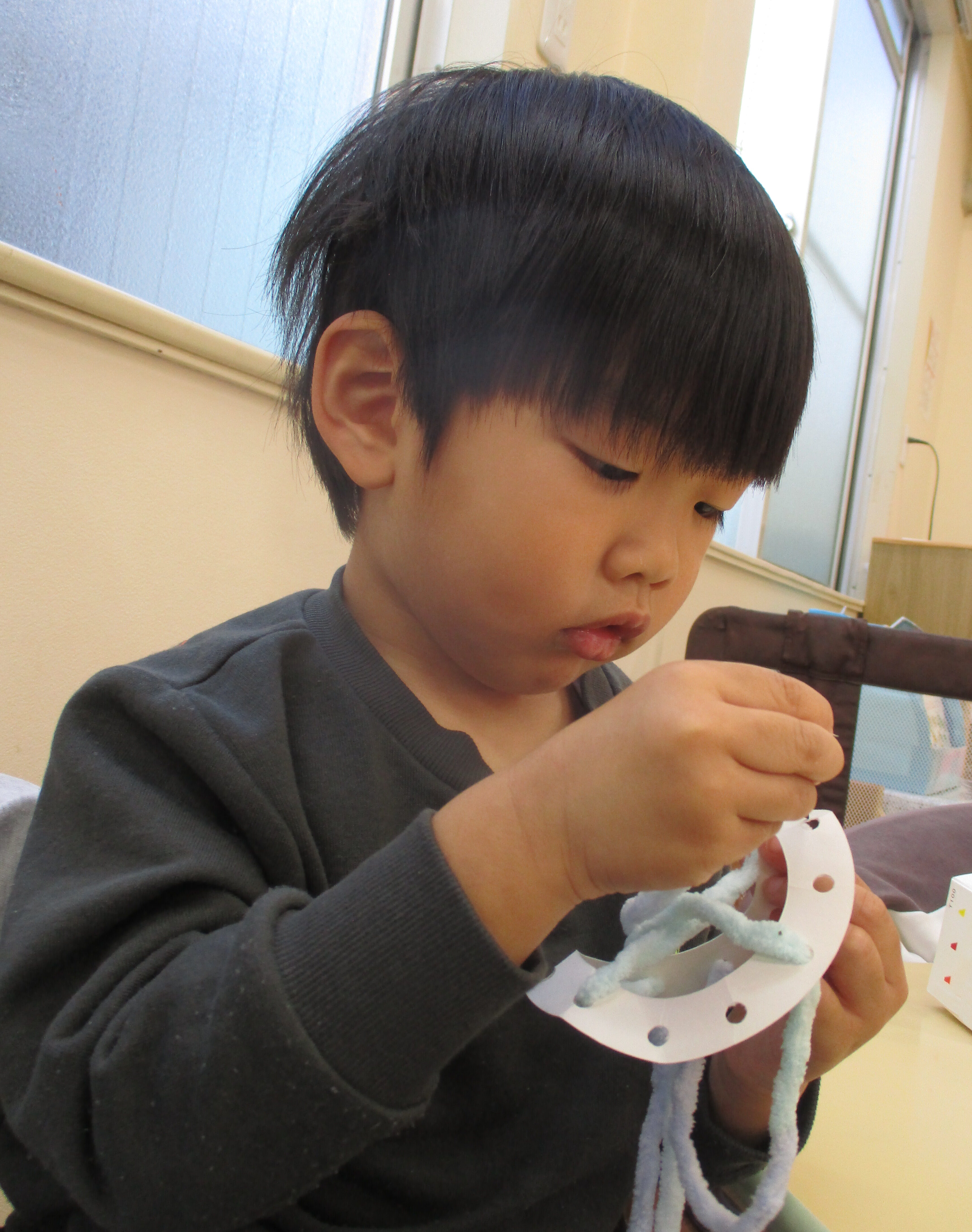 手先が器用になってきて、ハサミで画用紙を切ったりピンで糸を通したりすることができるようになりました![]()