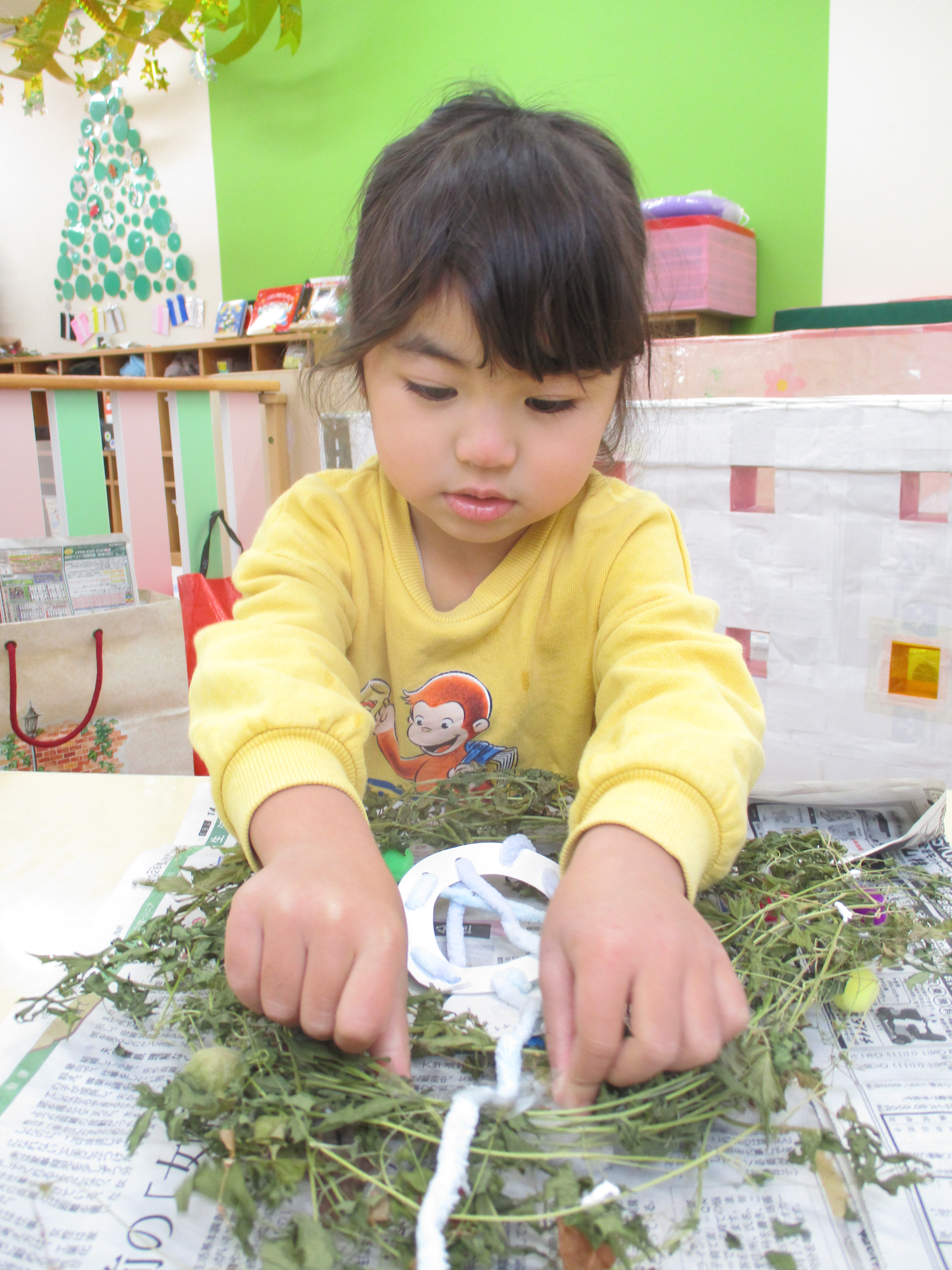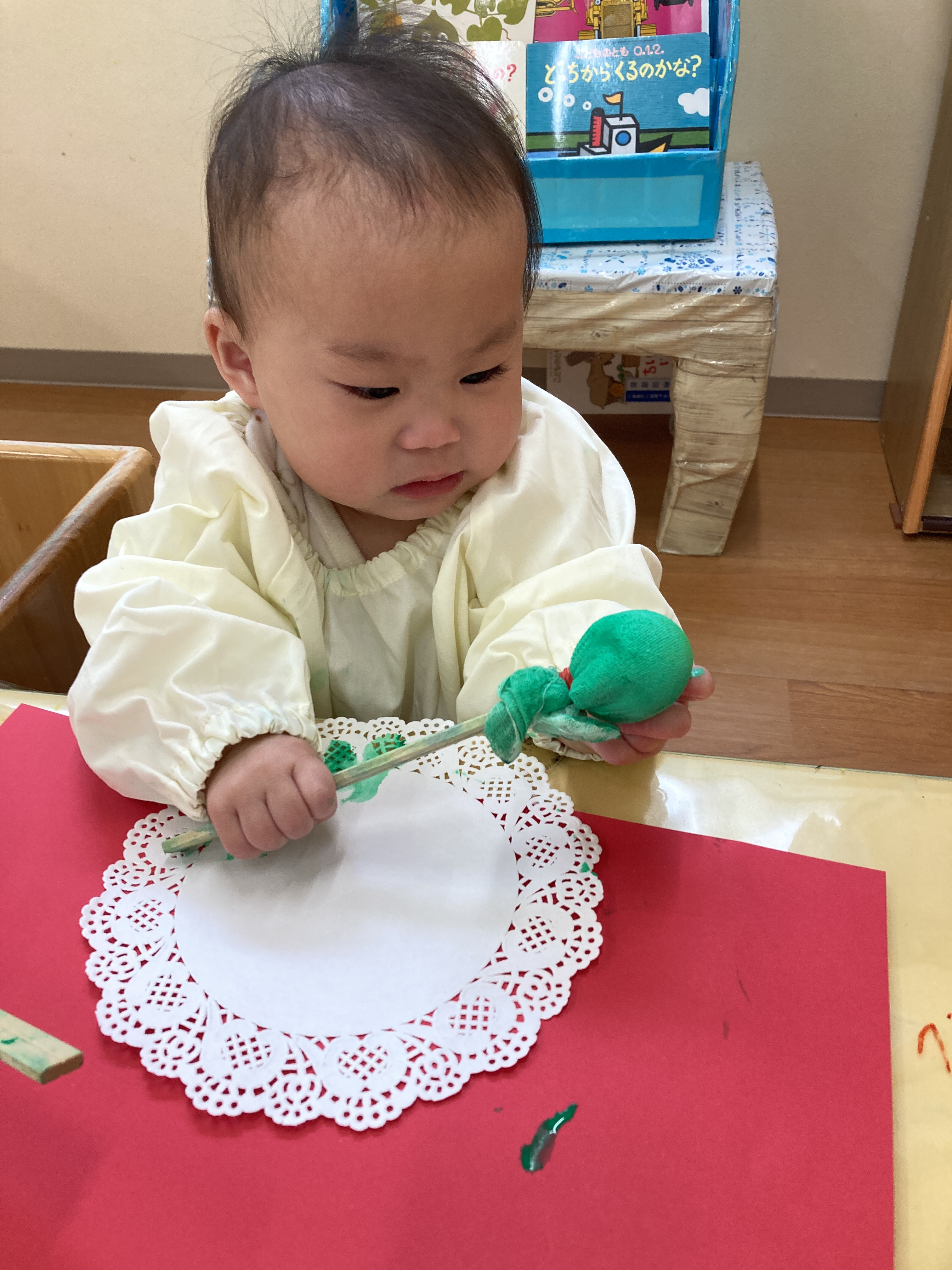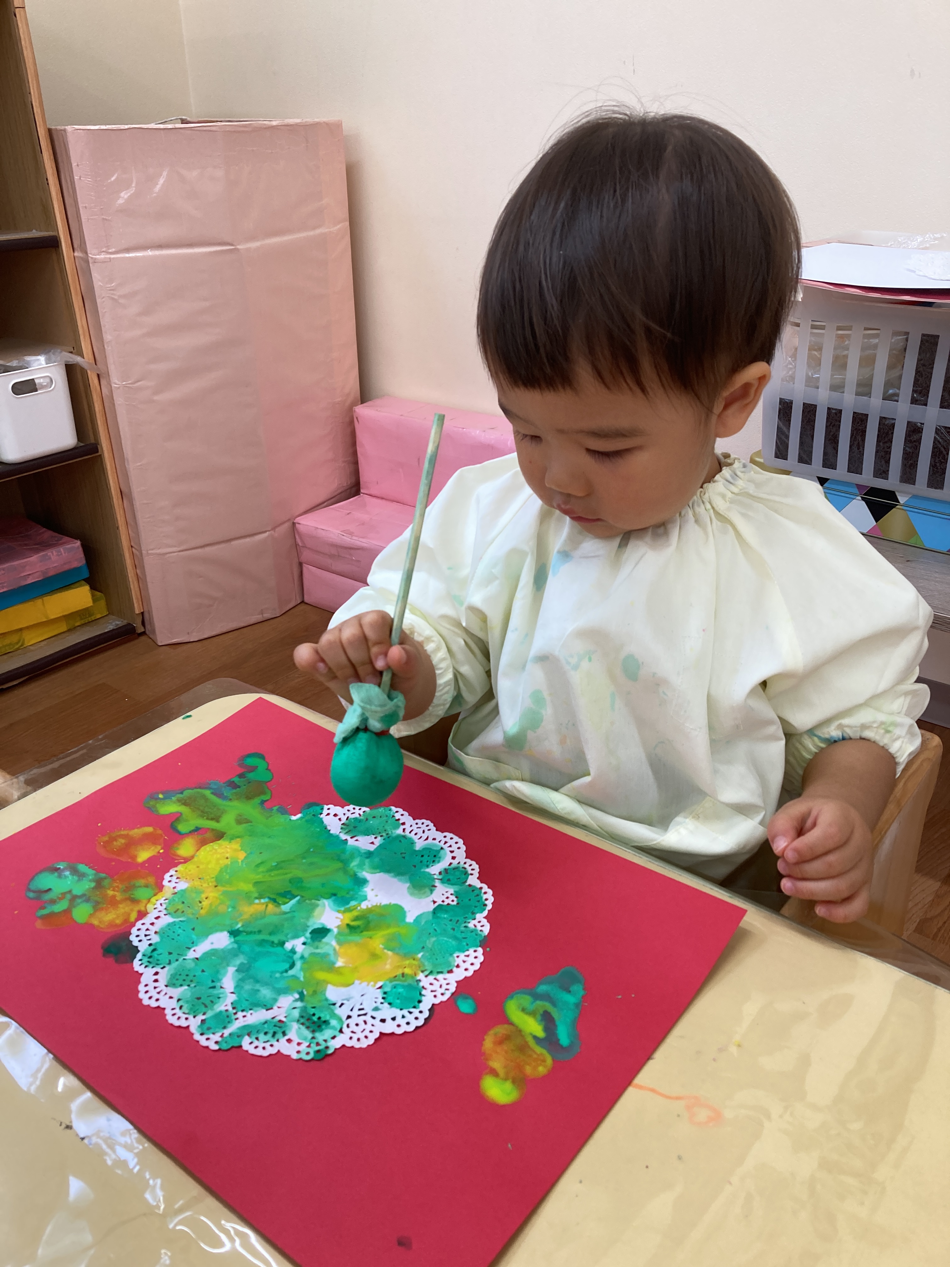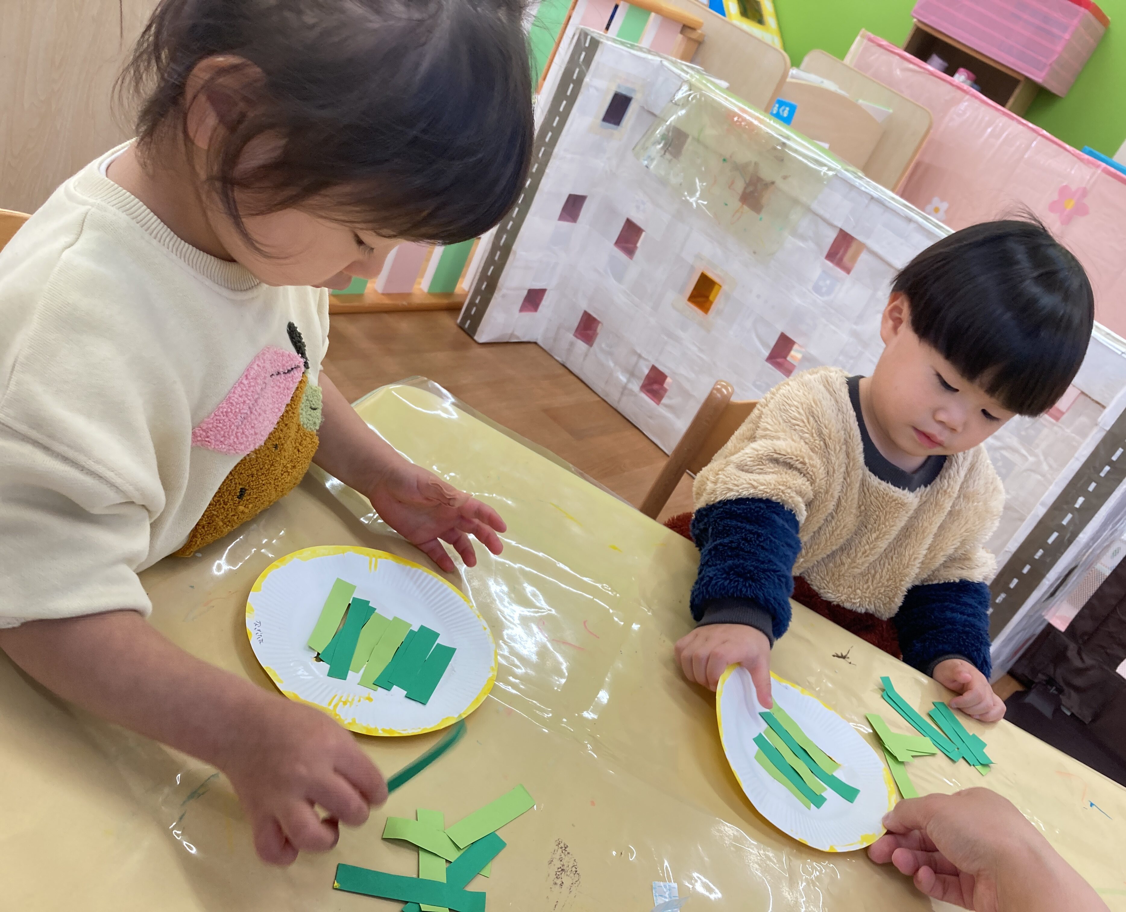 手先が器用になってきて、ハサミで画用紙を切ったりピンで糸を通したりすることができるようになりました![]()