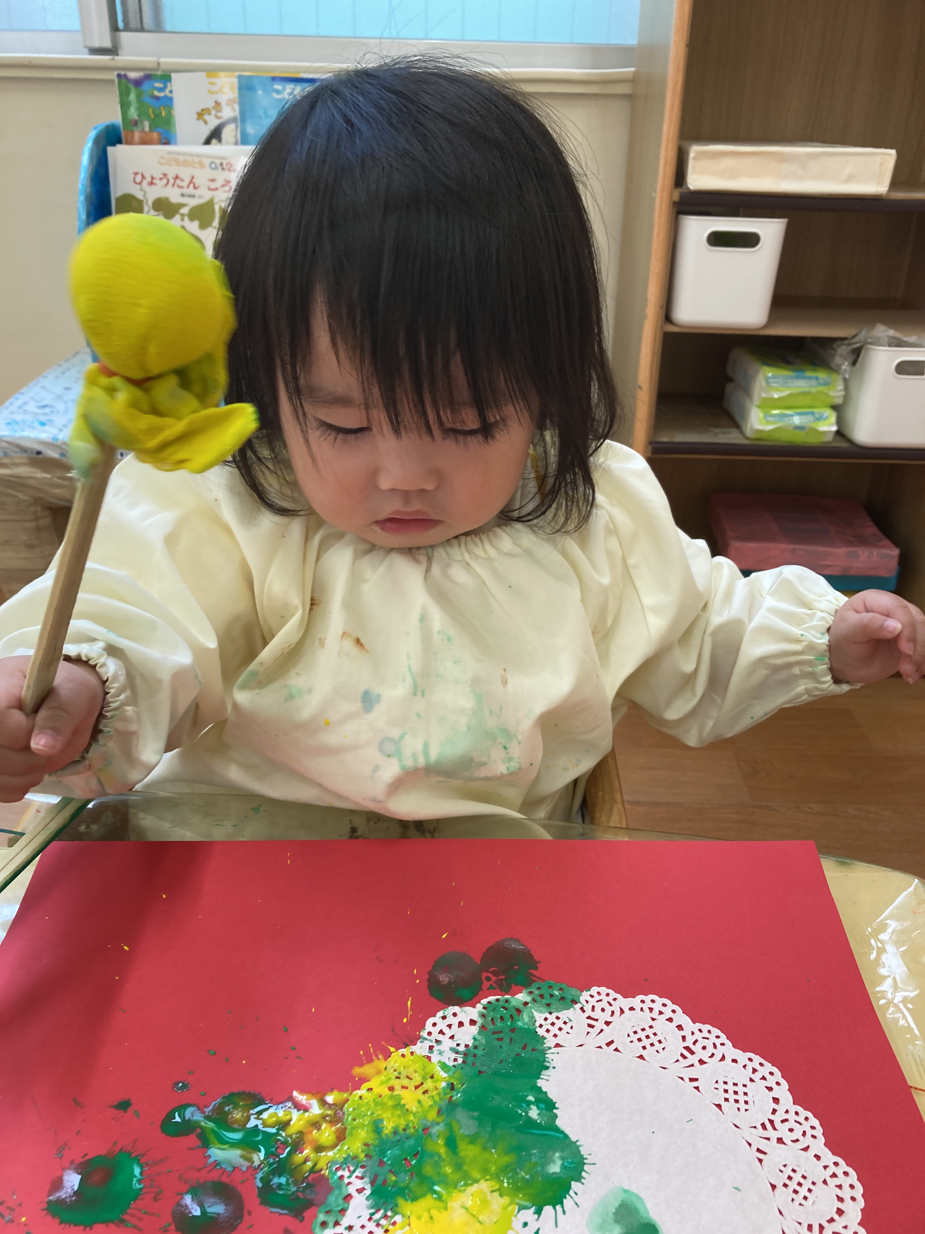 切った画用紙を紙皿の三角の部分に貼りつけて、絵の具で色をつけたところに綿棒を使って白の絵の具で雪を表現しました❄