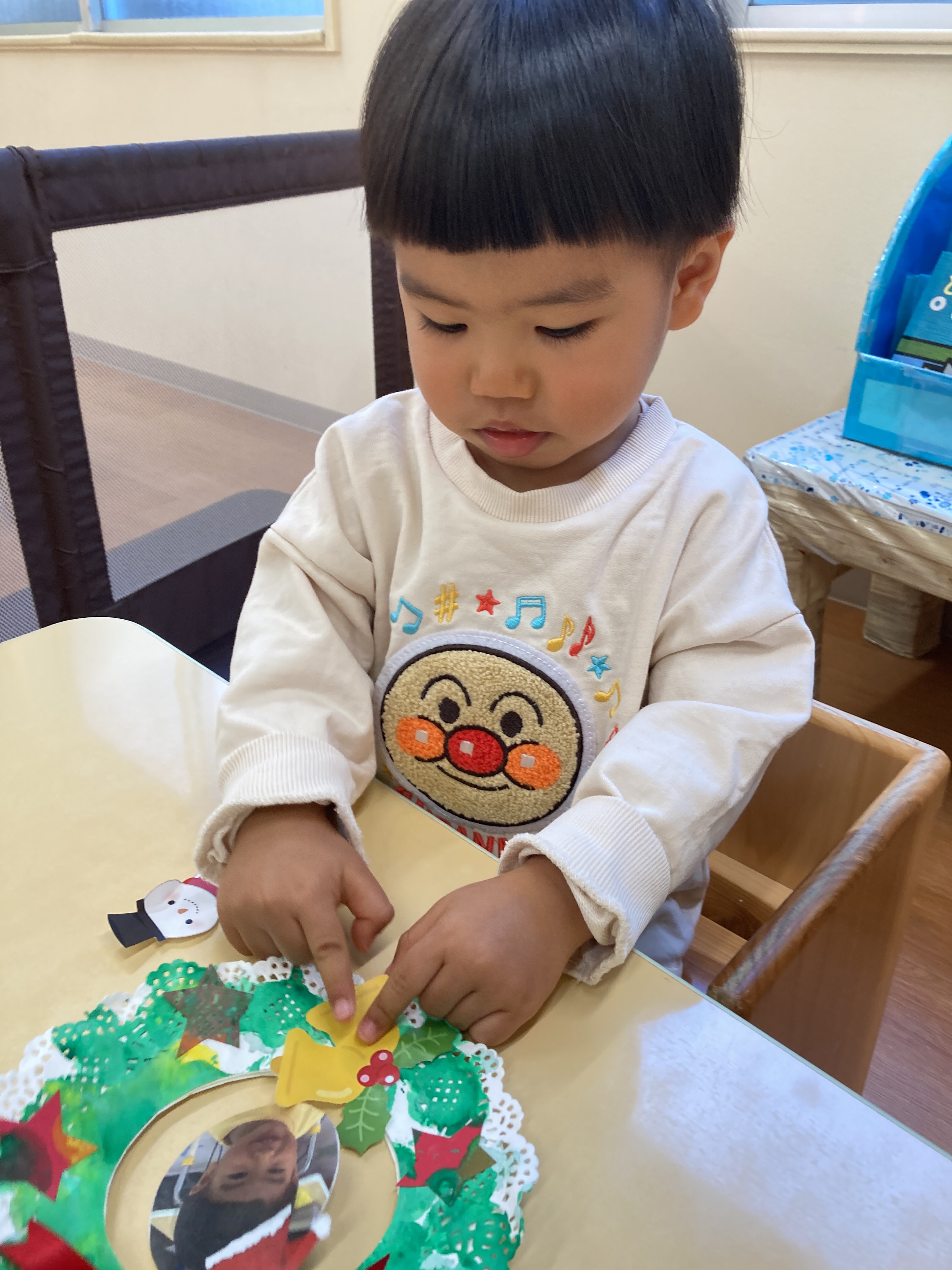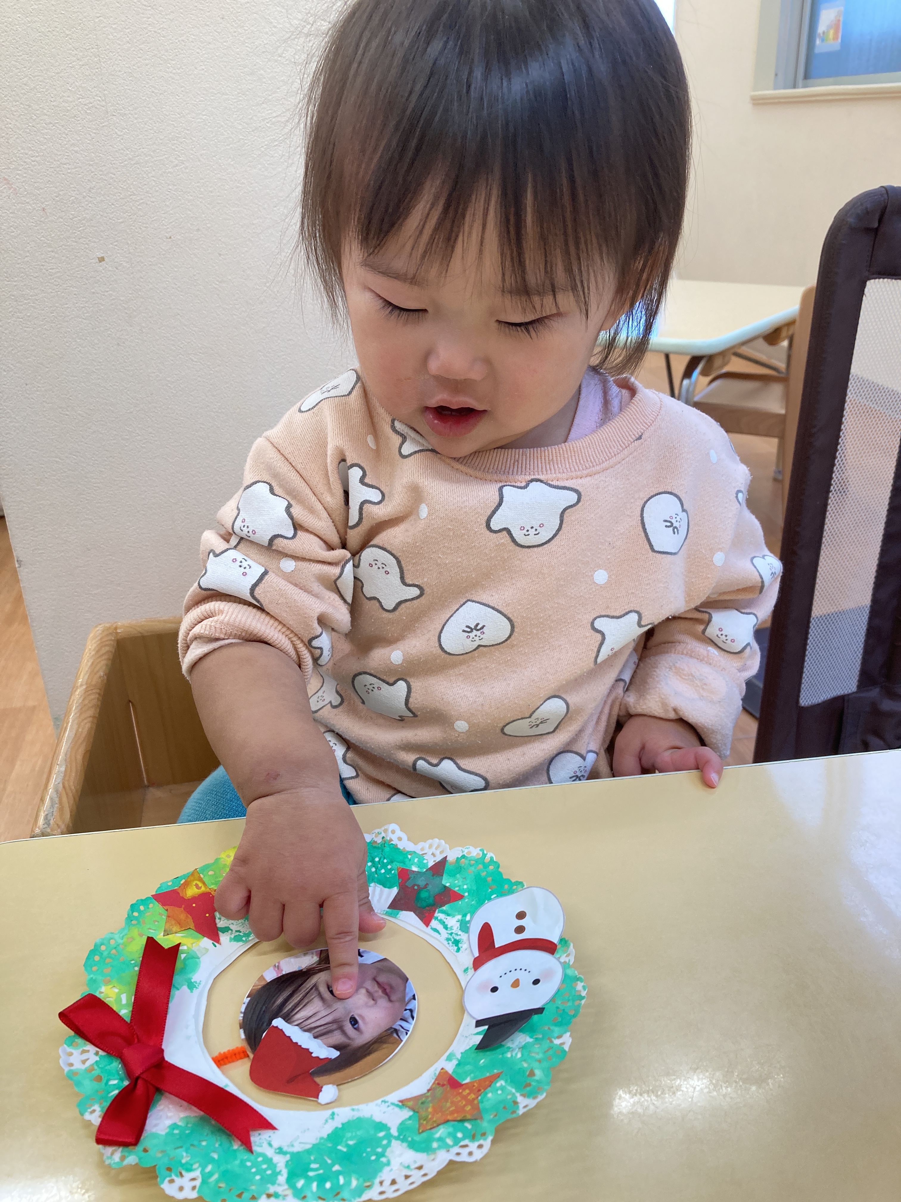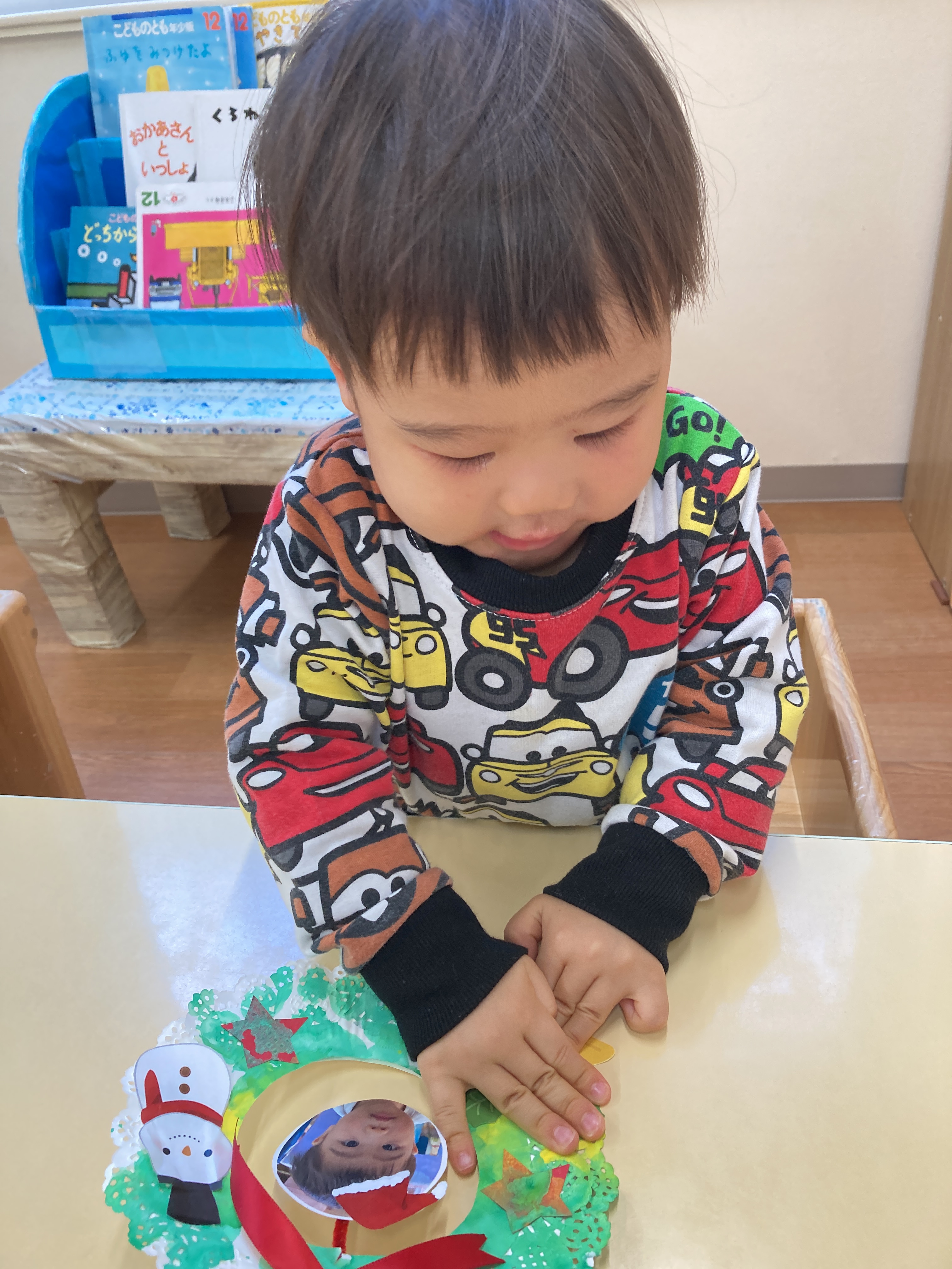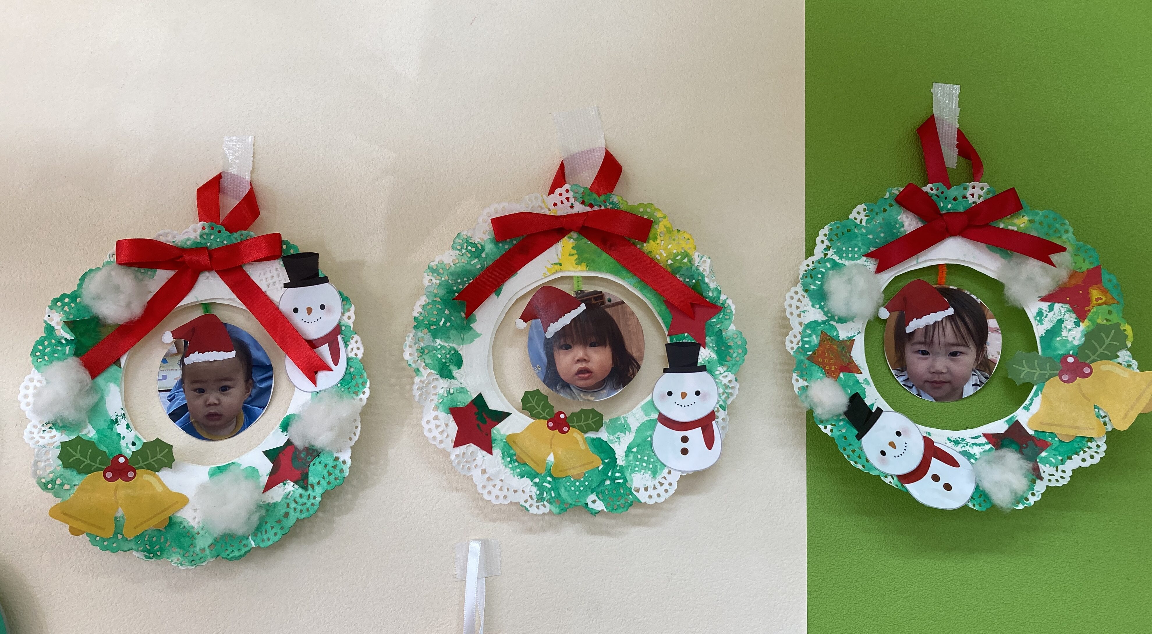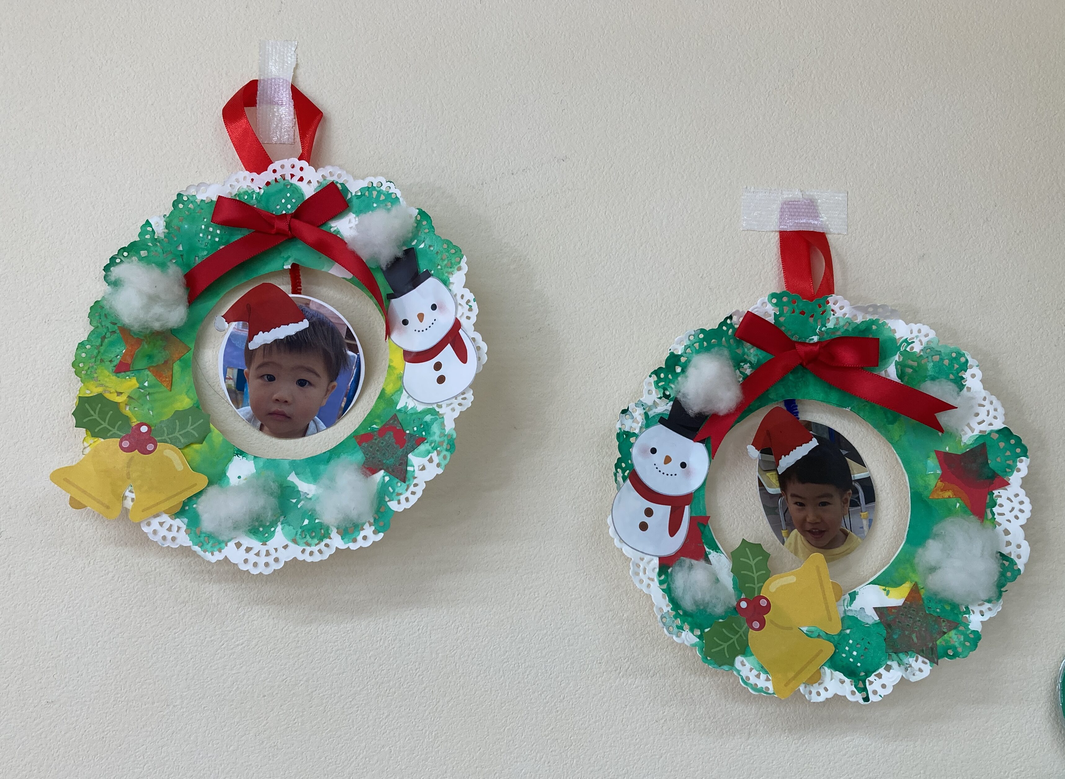 模様のついたレースペーパーの真ん中をくり抜き、サンタの帽子のついた自分の顔写真を真ん中に貼り、最後に飾りつけをしました![]()